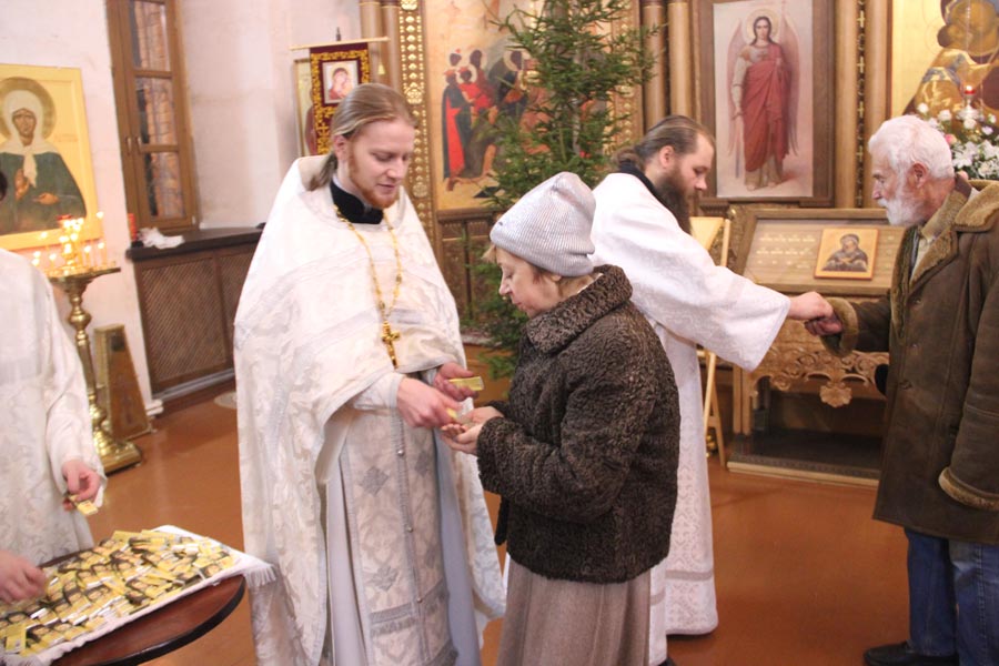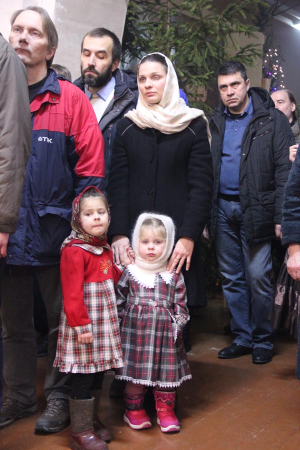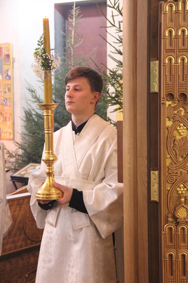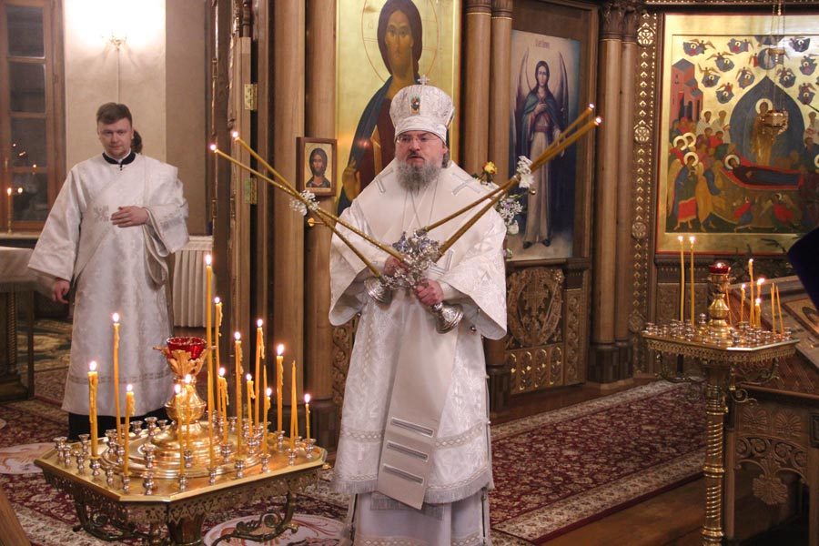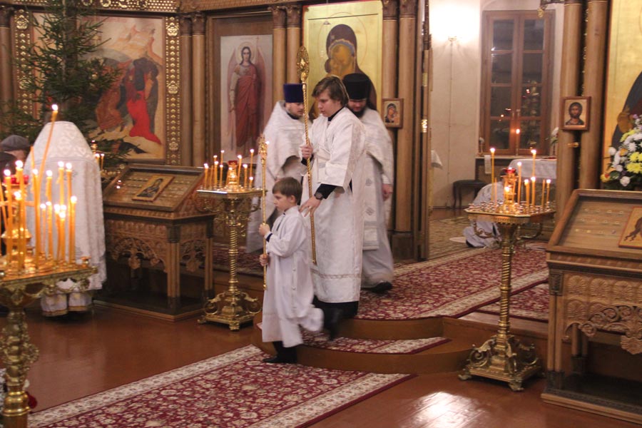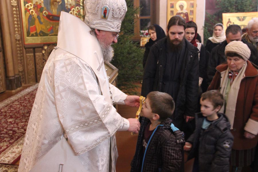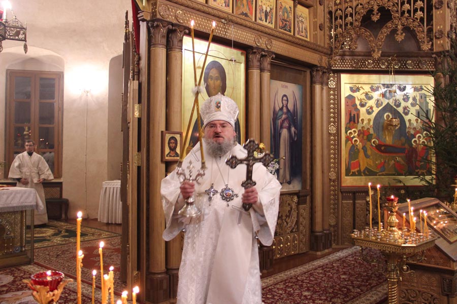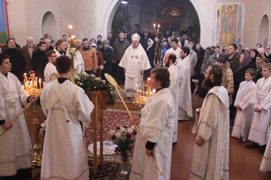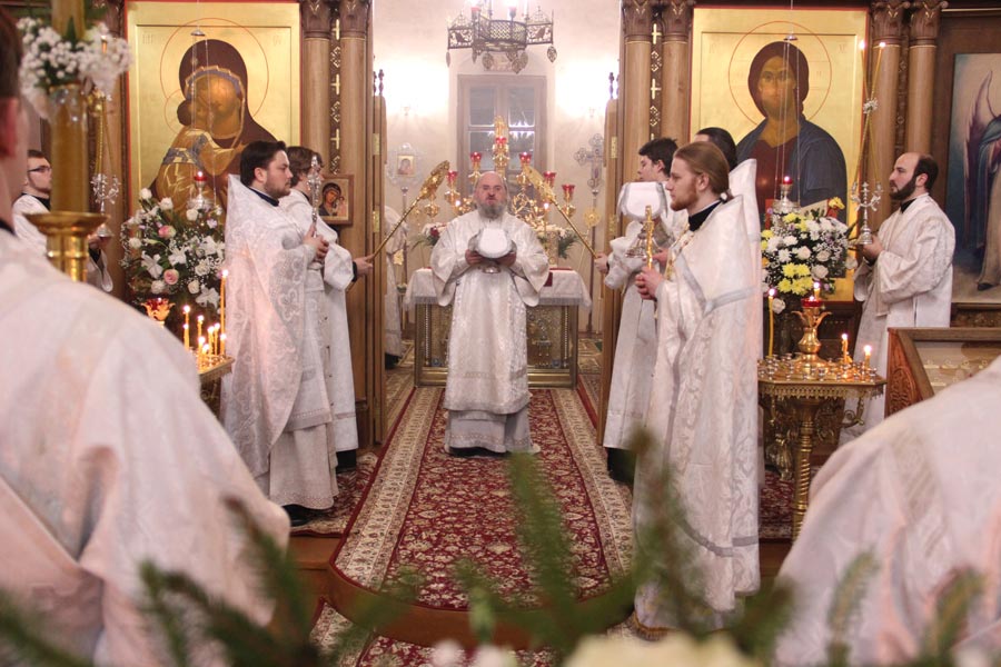 По отпусте литургии священнослужители совершили славление праздника Рождества Христова, после чего владыка поздравил молящихся с пришествием в мир Богомладенца Христа и произнес проповедь.