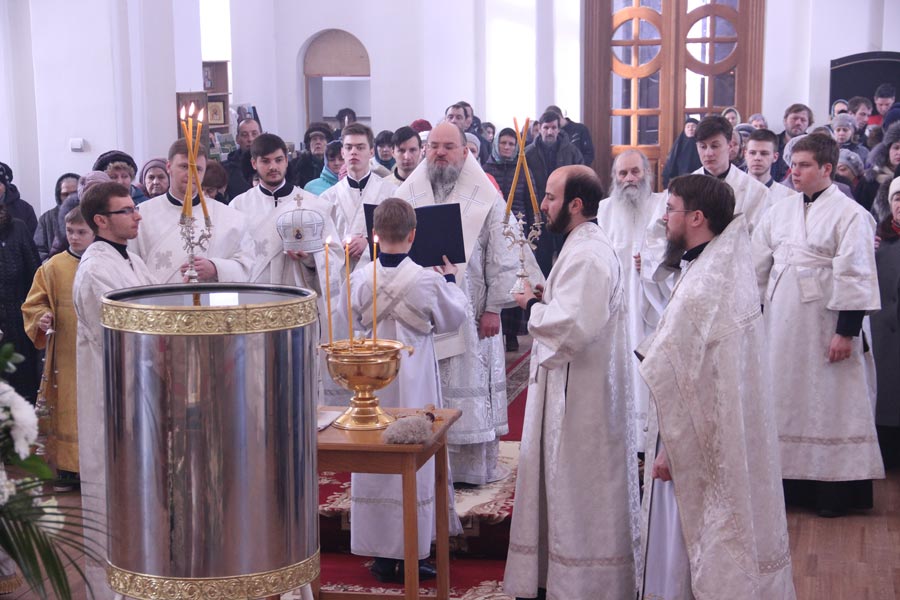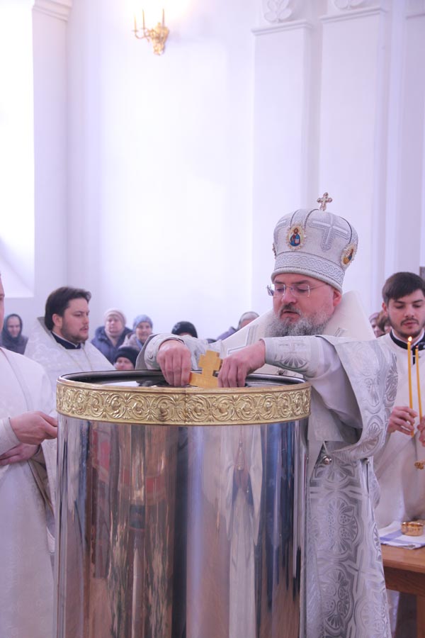 По заамвонной молитве священнослужители совершили великое освящение воды, а затем владыка обратился к богомольцам с архипастырским словом.