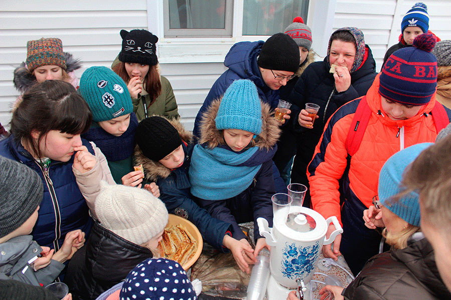 В конце праздника по традиции всех пили горячий чай с блинами.