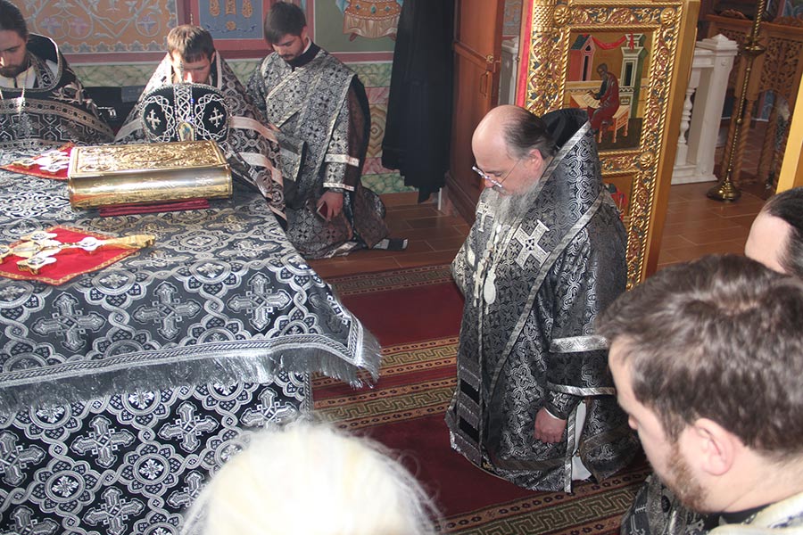 Архипастырю сослужили: духовник епархии митрофорный протоиерей Алексий Жиганов и клирики храмов Ульяновского и Хвастовичского районов Калужской области. До начала богослужения протоиерей Алексий Жиганов совершил последование исповеди для собравшихся священнослужителей.