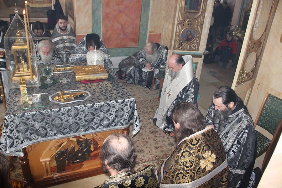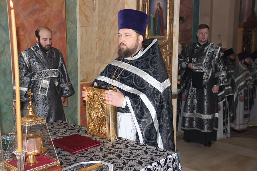 За богослужением состоялось великопостное говение духовенства первого (Козельского) благочиния Козельской епархии. Исповедь у священнослужителей принимал духовник епархии иеромонах Тихон (Клинов).
