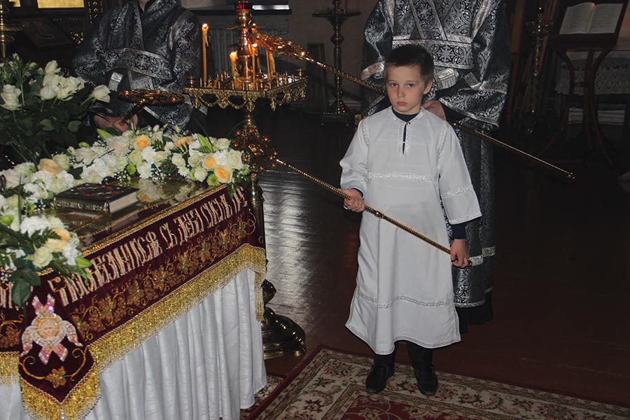 Днем Преосвященнейший епископ Козельский и Людиновский Никита возглавил служение вечерни и вынос Плащаницы Спасителя, а вечером была совершена утреня Великой Субботы с чином Погребения.