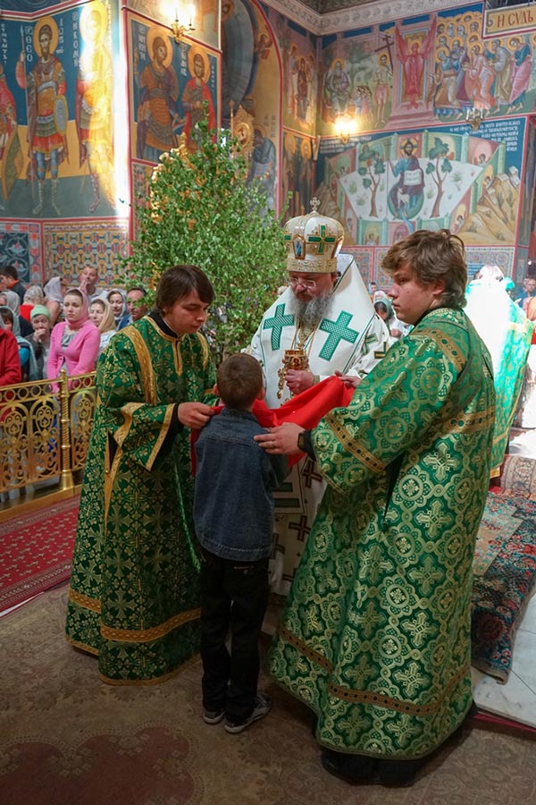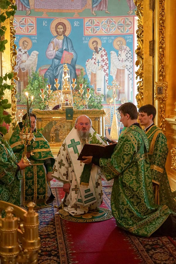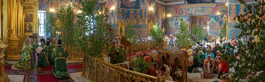У великой вечерни несколько уникальных особенностей. В мирную ектению добавляются особые прошения о благодати Святого Духа. А кульминация — это, конечно же, чтение коленопреклоненных молитв. Их всего семь, они делятся на три части: по две в первой и второй, три в третьей. Части разделяются между собой короткими молитвословиями: первая — после великого прокимена («Кто Бог велий…»), вторая — после сугубой ектении «Рцем вси…»); после второй части поется «Сподоби, Господи» и затем уже третья часть. В первой части воспевается домостроительство нашего спасения, и она, действительно, покаянная («…услыши ны, вонь же аще день призовем Ти, изрядне же в день сей пятдесятный…»). Вторая часть — это молитва о нашем обновлении Духом Святым («…светом Духа просветихомся и прелести якоже тьмы изменихомся…»), а третья часть, по сути, заупокойная, это молитвы об усопших: «…и упокой вся отцы коегождо, и матери, и чада, и братия, и сестры единородныя и купнородныя, и вся прежде почившия души в надежде воскресения…». В самом конце вечерни — третья из ее особенностей — длинный особый отпуст: «Иже от Отчих и Божественных недр истощивый Себе и с небесе на землю сошедый…». В его вводной весьма пространной фразе воспеваются все спасительные действия Бога, начиная с воплощения, заканчивая крестной смертью и посланием Духа. Этот отпуст подводит итог всему искупительному действию Господа.