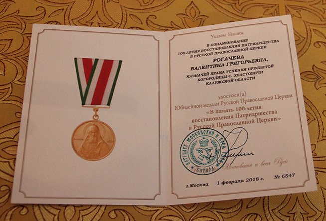 По отпусте литургии владыка обратился к молящимся с архипастырским словом. Во внимание к усердным многолетним трудам во славу Святой Церкви, по благословению Святейшего Патриарха Московского и всея Руси Кирилла, казначей храма Рогачева Валентина Григорьевна была награждена юбилейной медалью в ознаменование 100 -летия восстановления Патриаршества в Русской Православной Церкви.