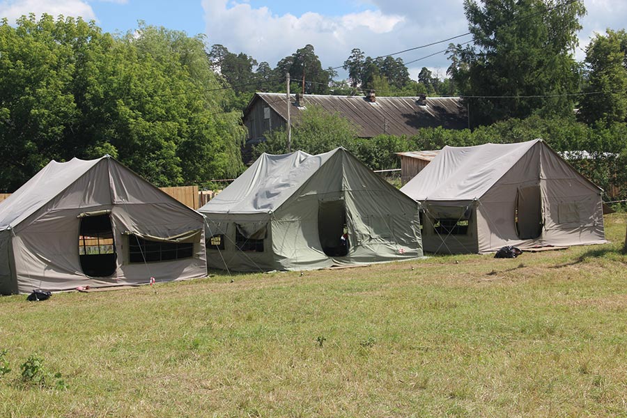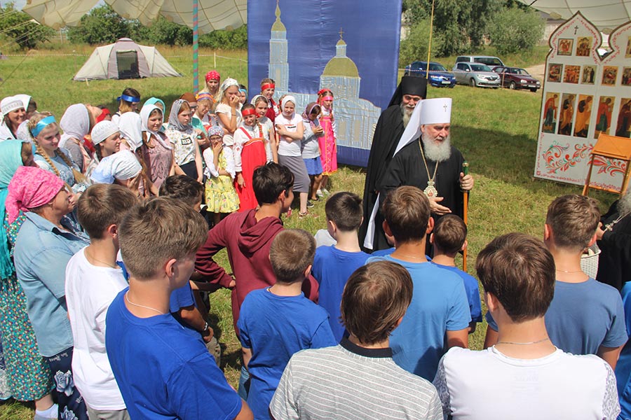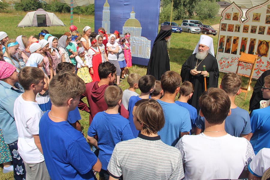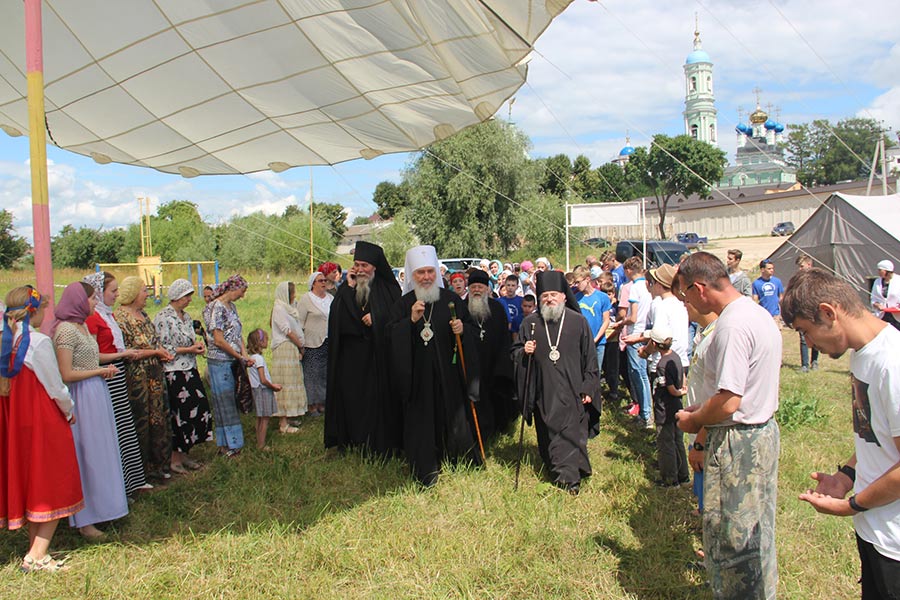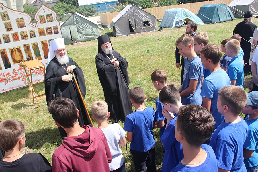 Детский палаточный лагерь рядом с Оптиной Пустынью ежегодно, на протяжении последних десяти лет устраивает приход кафедрального собора Казанской иконы Божией Матери города Людиново, настоятелем которого является протоиерей Алексий Жиганов. Отец Алексий и насельники поселения встретили высоких гостей у ворот гимном лагеря, а затем владыки познакомились с бытом и расписанием дня отдыхающих ребятишек.