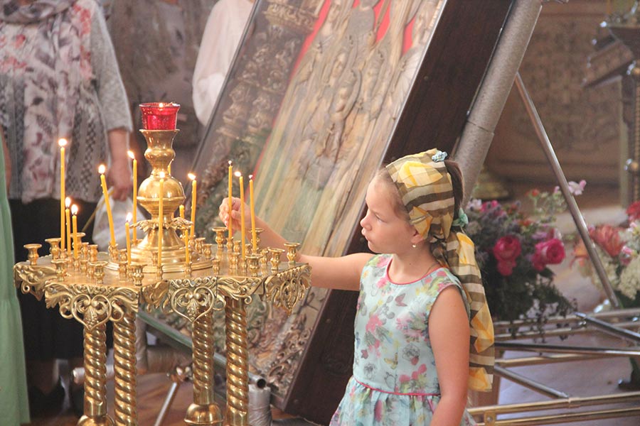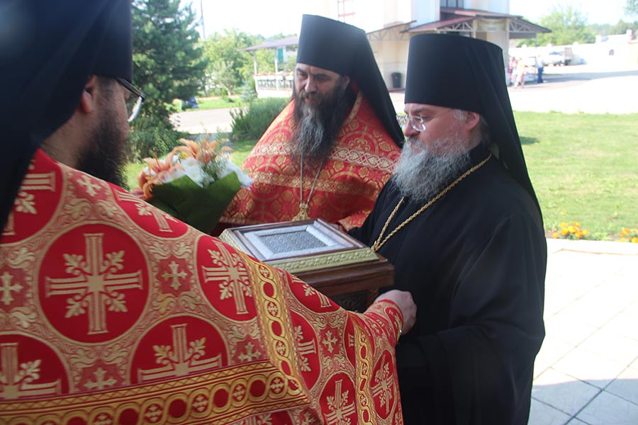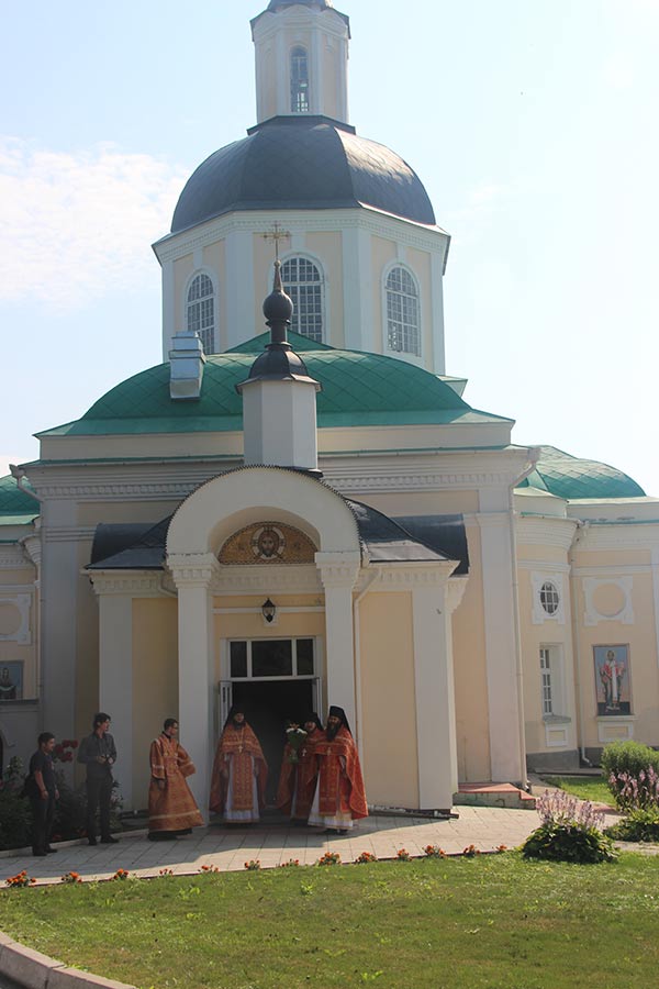 По отпусте литургии священнослужители совершили праздничный молебен пред уникальной резной иконой Царственных мучеников, доставленной крестным ходом из города Козельска 12 июля сего года, и мощами святых преподобномучениц Елисаветы и Варвары.