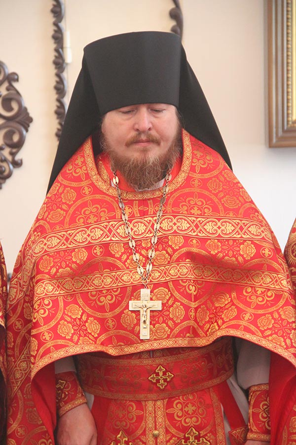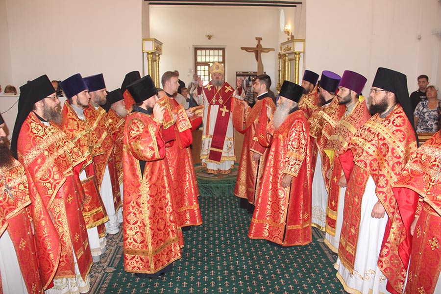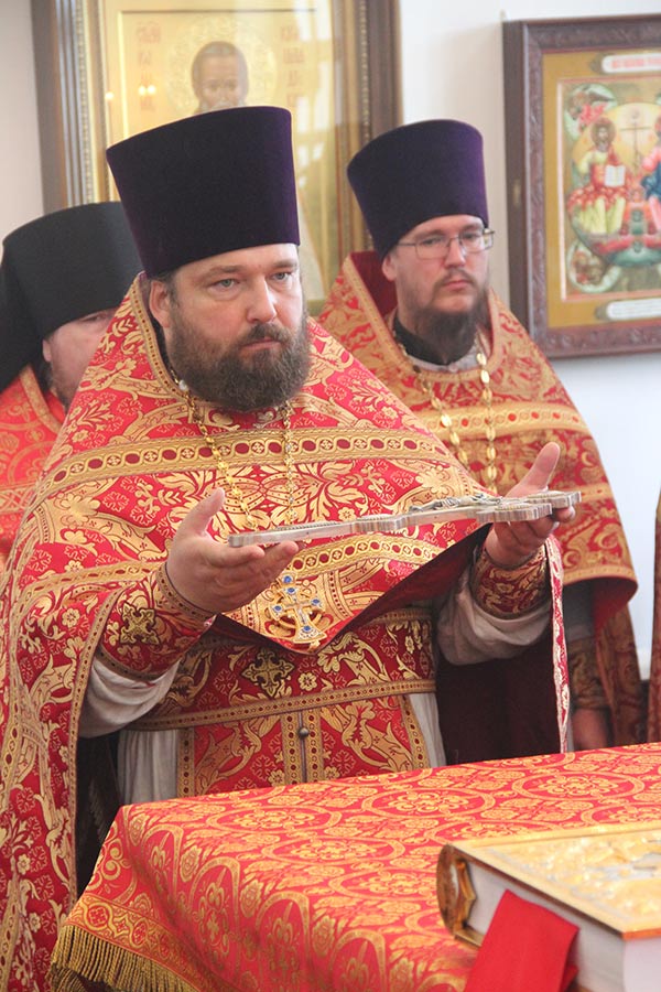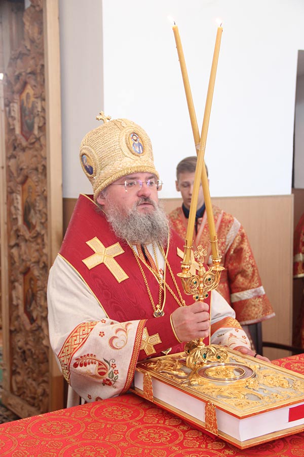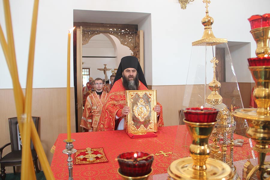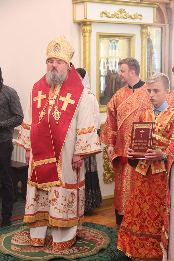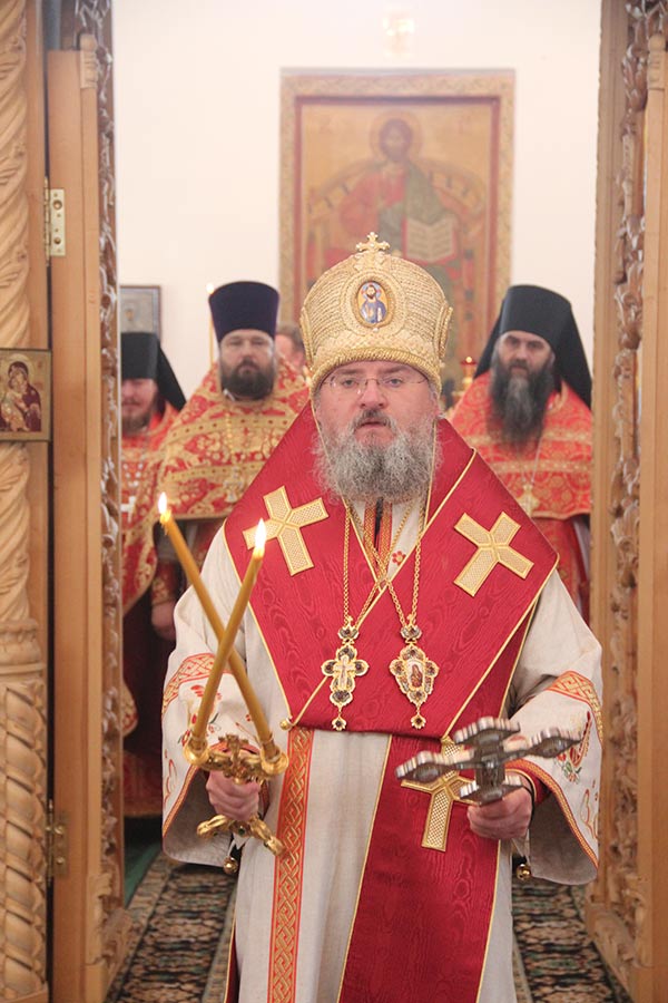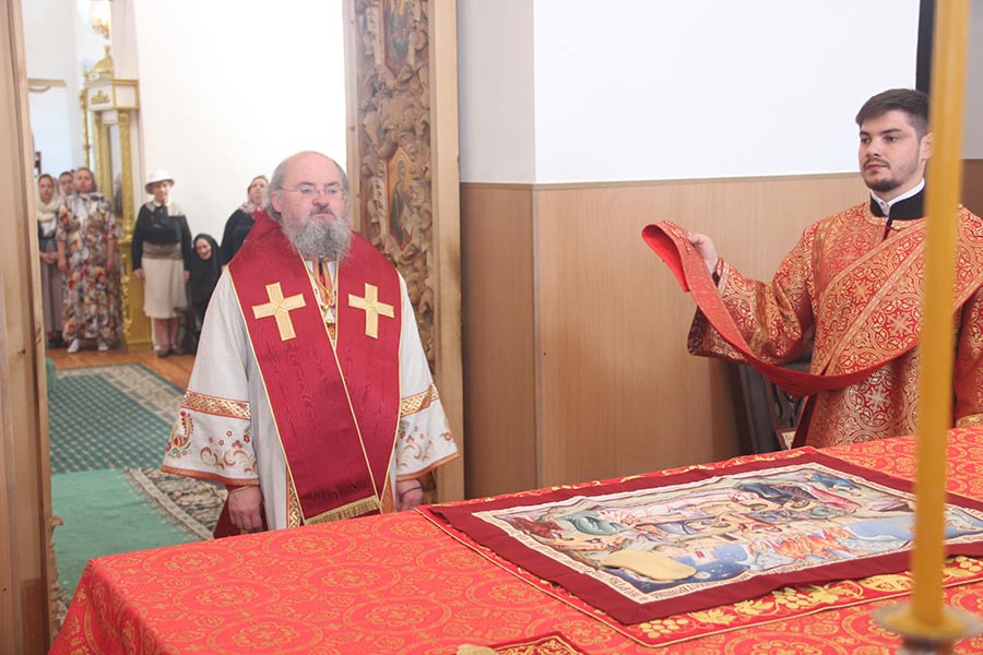 В начале богослужения владыка доставил в храм мощевик с частицами мощей святых преподобномучениц великой княгини Елисаветы и инокини Варвары. Архипастырю сослужили настоятель обители игумен Михаил (Семенов), благочинный округа протоиерей Владимир Бахаев с клириками благочиния. За богослужением пел хор епархии под управлением диакона Тихона Худякова.