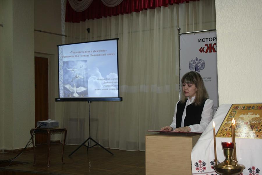 Репрессии, проходившие по всей стране, не миновали и Людиновский край. О событиях того времени, происходивших в Людиновском районе, рассказала Марина Александровна Неверовская, учитель ОПК МКОУ «Манинская средняя общеобразовательная школа»: «Ушедшие за Веру и убеждения. Репрессии 30-х годов на Людиновской земле». Среди пострадавших в годы массовых репрессий несколько сотен имен наших земляков. Среди 900 репрессированных граждан Калужской области находятся также имена жителей Людиновского района. Трагическим судьбам наших земляков, ставших жертвами политических репрессий, посвящено данное выступление.