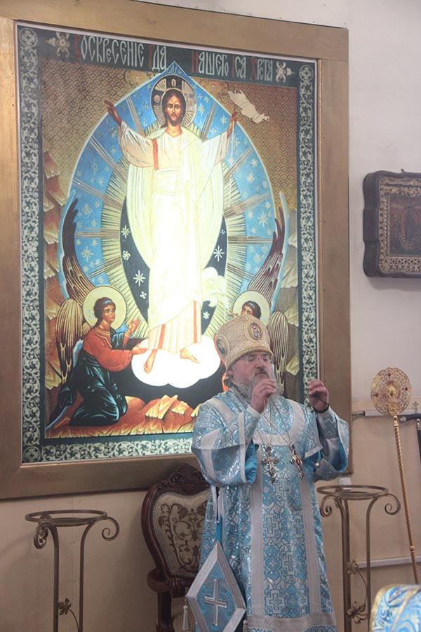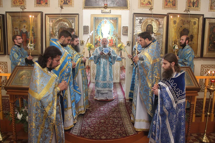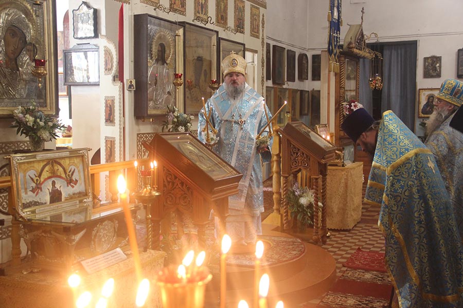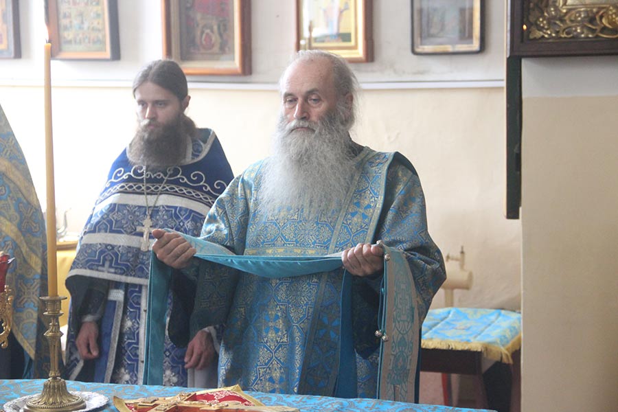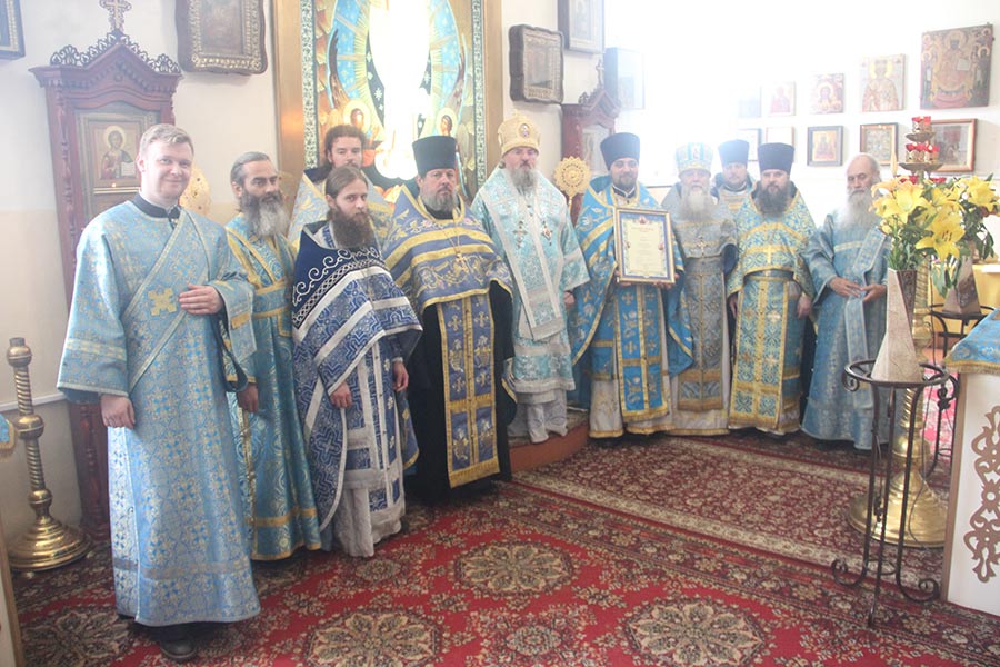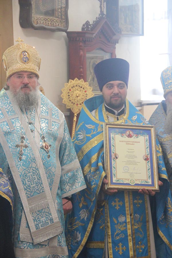 По запричастном стихе архипастырь поздравил настоятеля храма святых первоверховных апостолов Петра и Павла села Овсорок Жиздринского района священника Артемия Арутяняна с пятилетием иерейской хиротонии, поблагодарил его за добросовестное служение и вручил ему благодарственное архиерейское письмо и букет цветов.