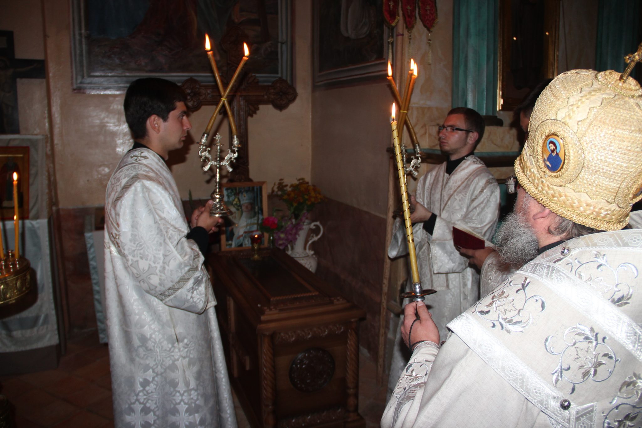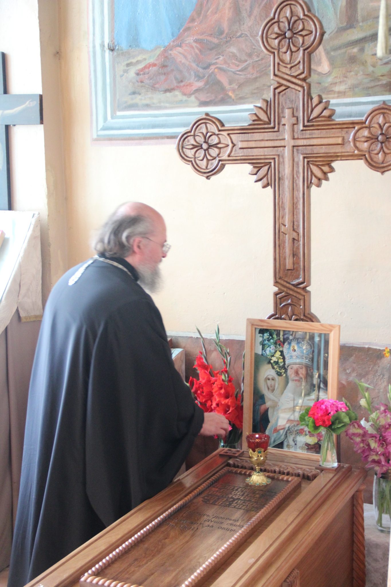 По отпусте утрени владыка совершил заупокойную литию на могиле почившего настоятеля храма протоиерея Леонтия Никифорова.