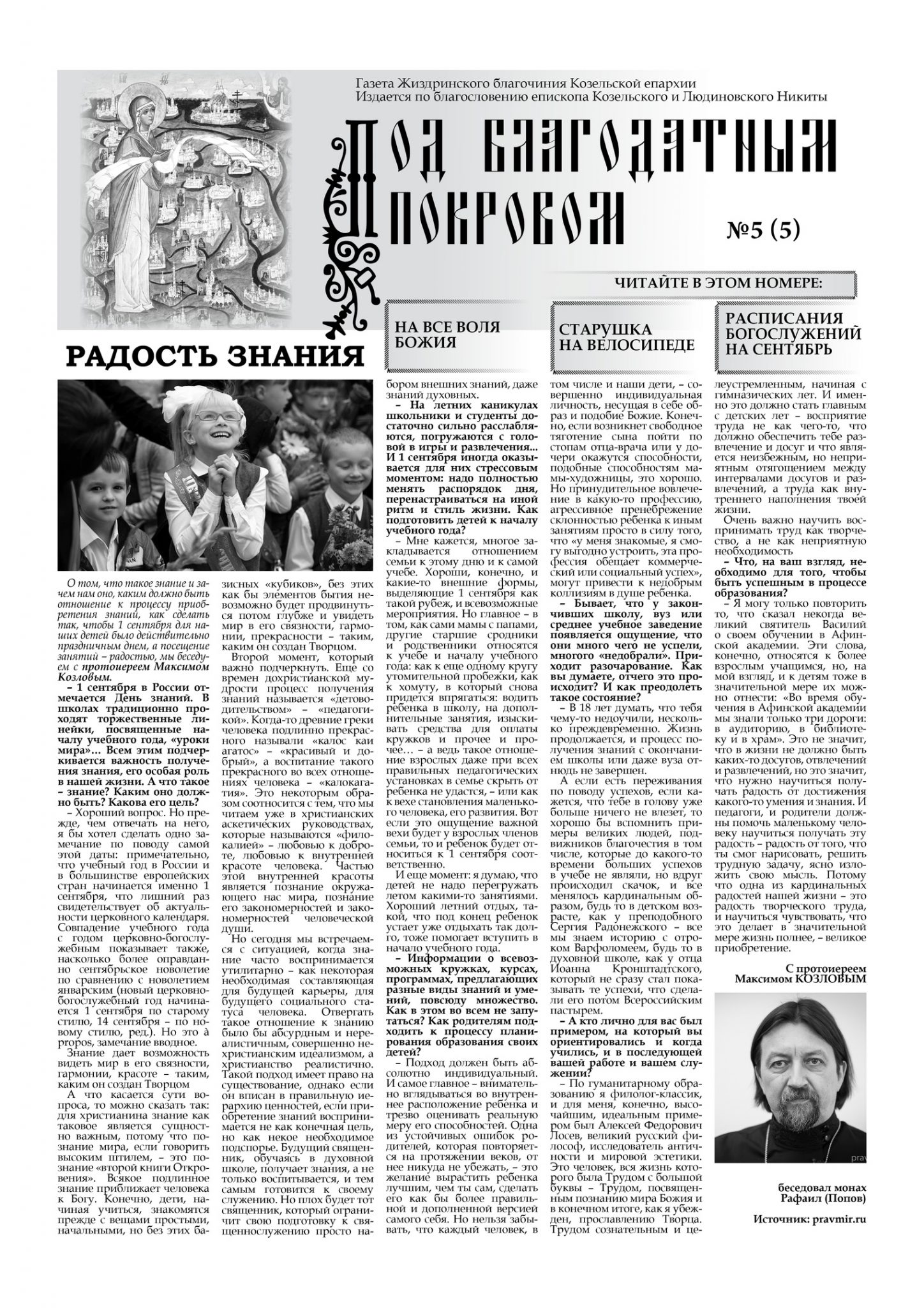 Сентябрьский номер посвящен началу нового учебного года. Что такое знание и зачем оно нам, каким должно быть отношение к процессу приобретения знаний, как сделать так, чтобы 1 сентября для наших детей было действительно праздничным днем, а посещение занятий – радостью, на все эти вопросы в интервью отвечает протоиерей Максим Козлов (источник pravmir.ru).