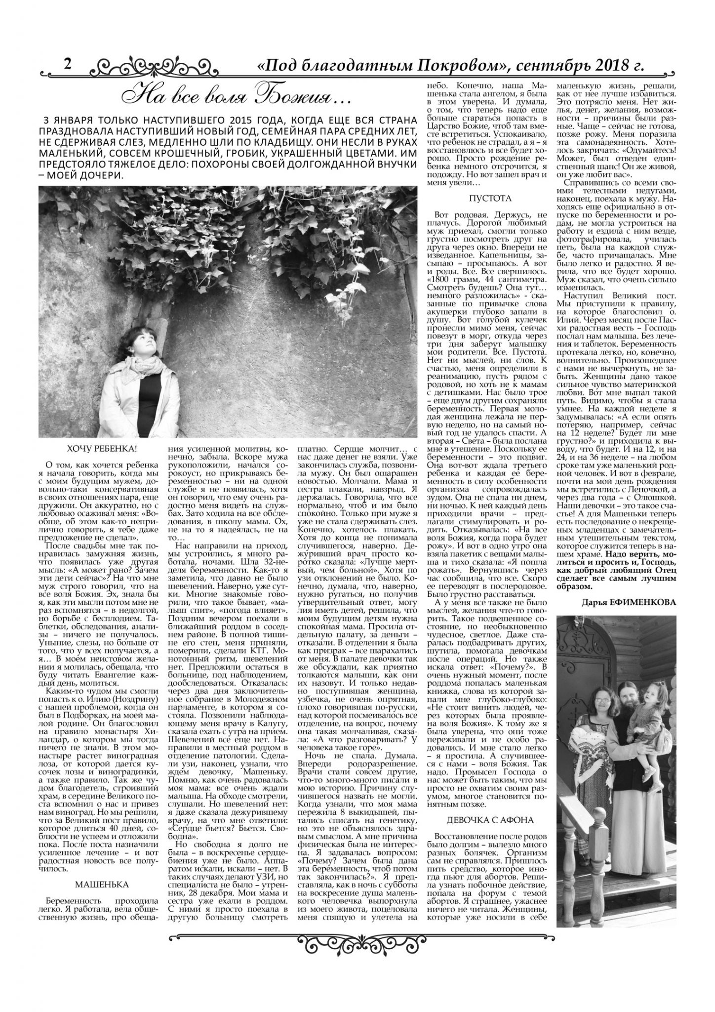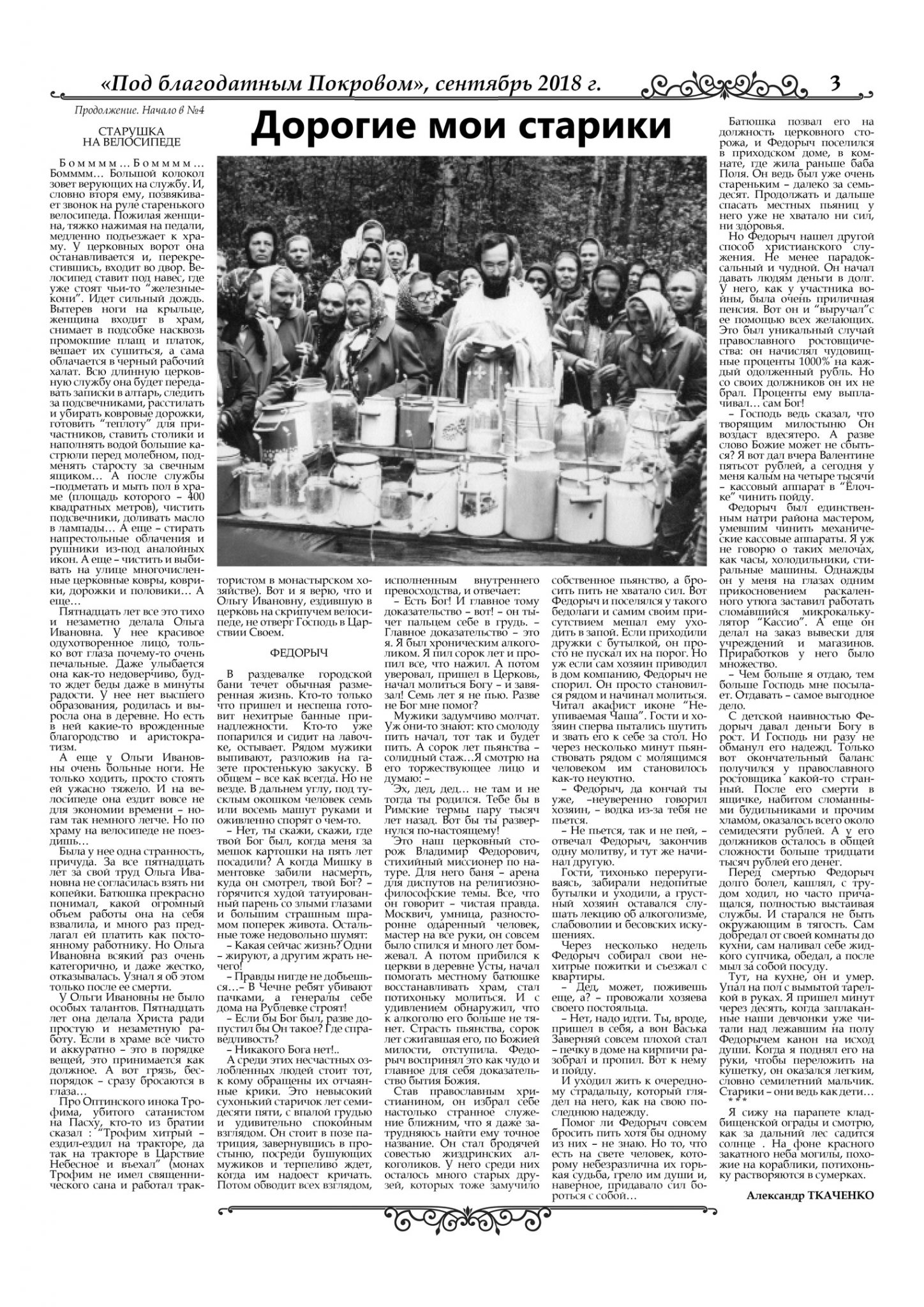 Также в новом номере читайте продолжение статьи «Дорогие мои старики» прихожанина храма Покрова Пресвятой Богородицы в городе Жиздра писателя Александра Ткаченко, статью «На все воля Божия», написанной в связи с появлением последования о некрещенных младенцев, прихожанкой храма Ефименковой Дарьей и расписание богослужений на сентябрь всех храмов Жиздринского благочиния.