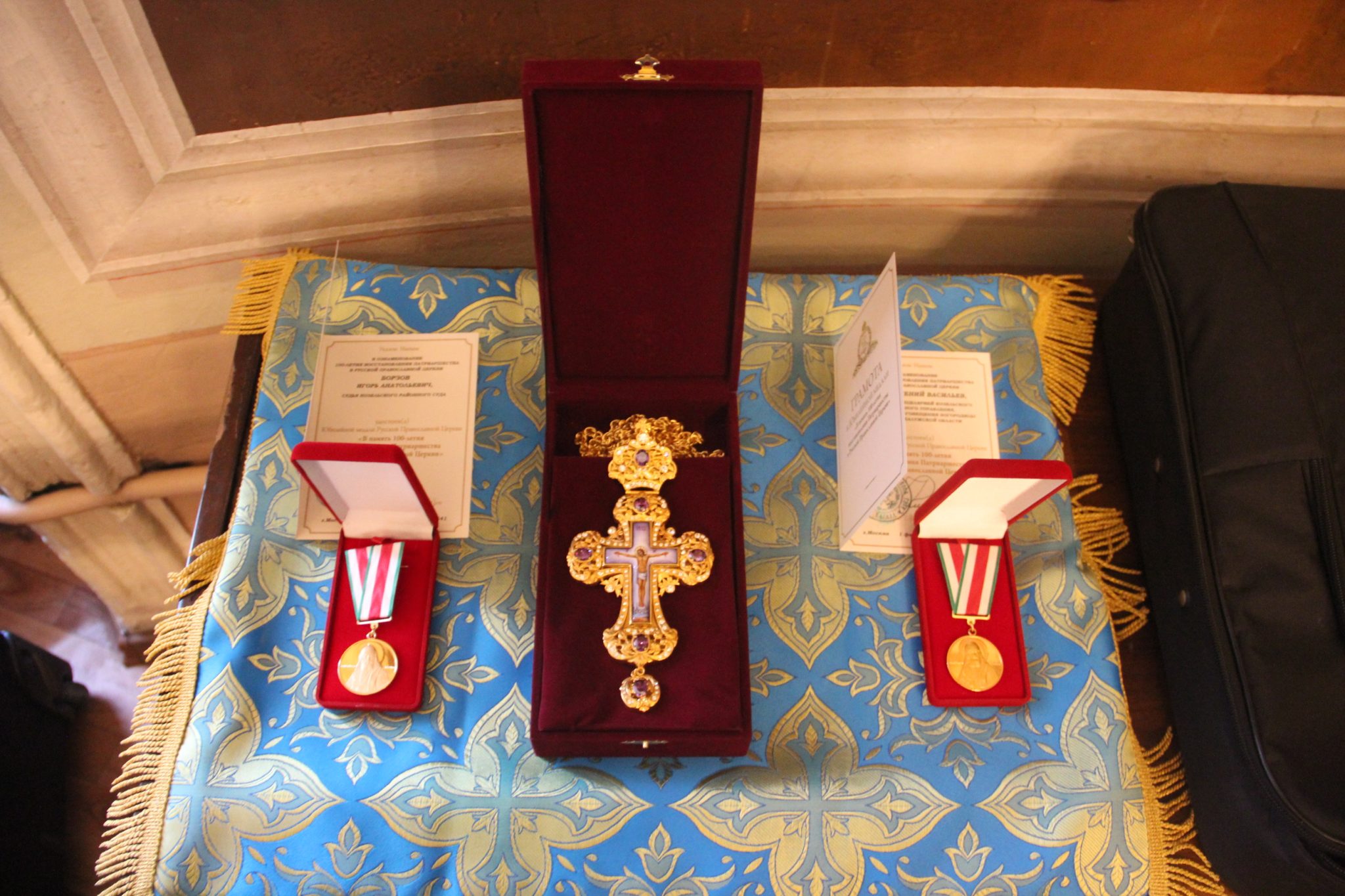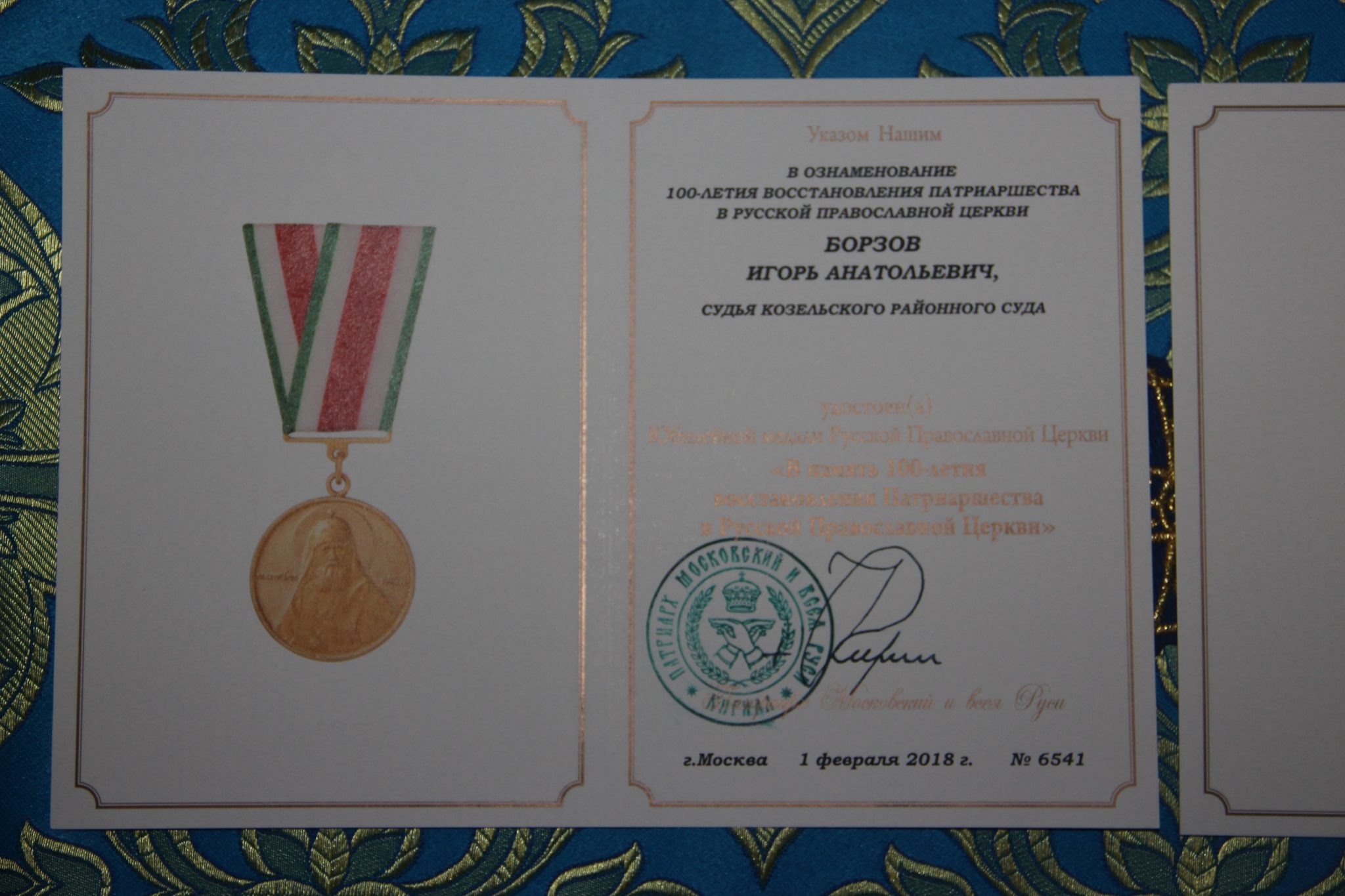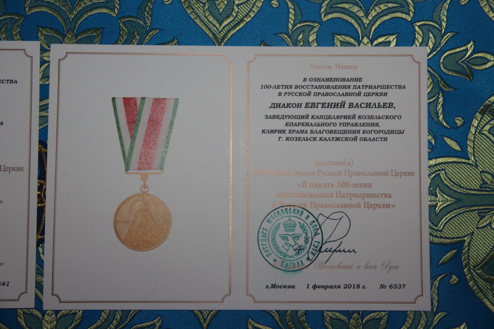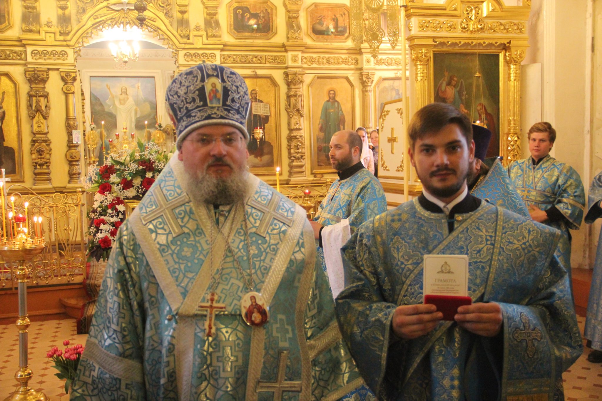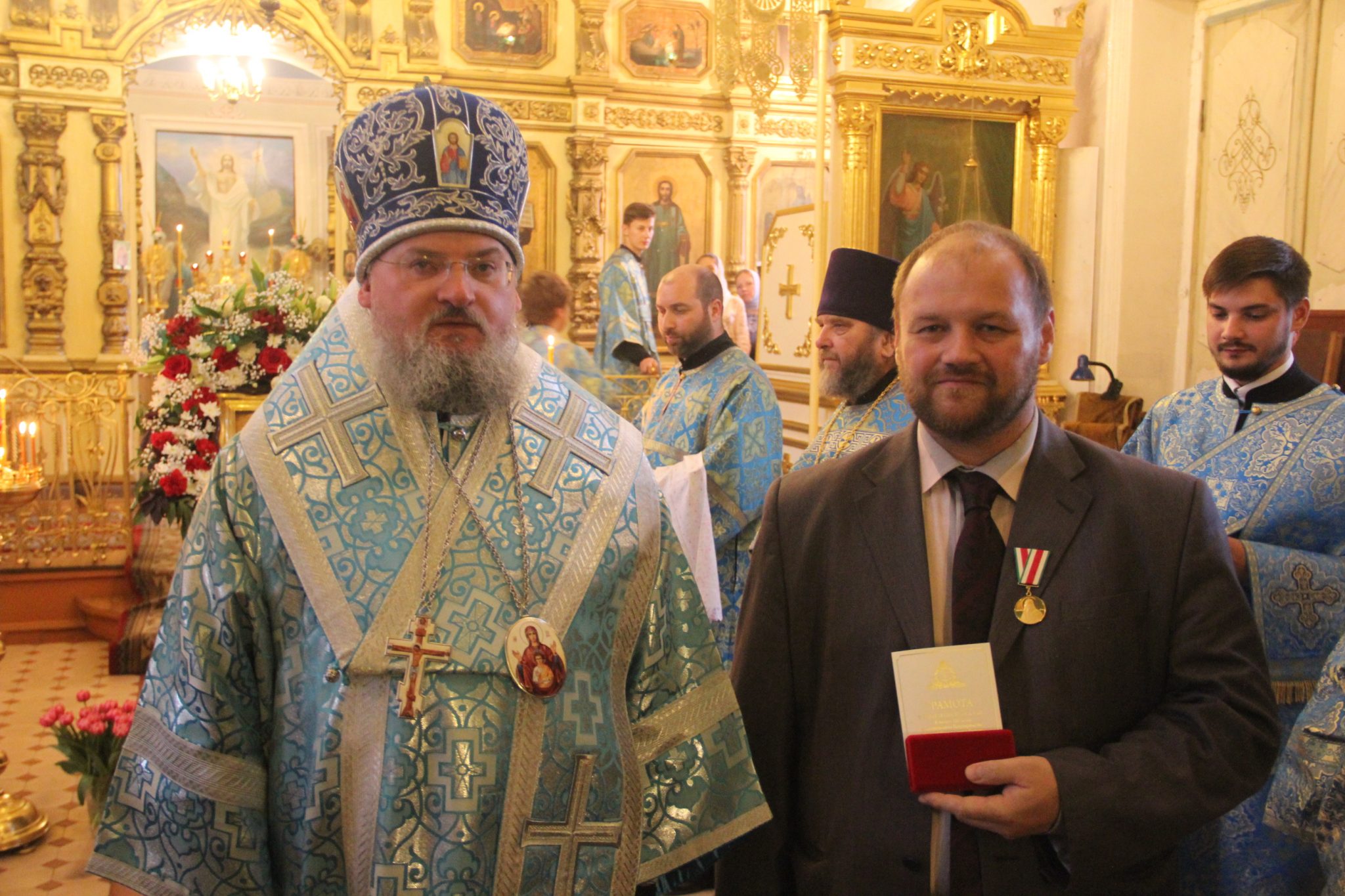 Во внимание к усердным трудам во славу святой Церкви и в связи с пятидесятипятилетием со дня рождения владыка преподнес протоиерею Павлу Морозову наперстный крест с украшениями. Архипастырь также поздравил клирика храма диакона Евгений Васильева с двадцатипятилетием со дня рождения и вручил ему патриаршую награду – медаль во ознаменования столетия восстановления патриаршества в Русской Православной Церкви. Этой же награды, по благословению Святейшего Патриарха Кирилла, был удостоен прихожанин храма, судья Козельского районного суда Борзов Игорь Анатольевич.