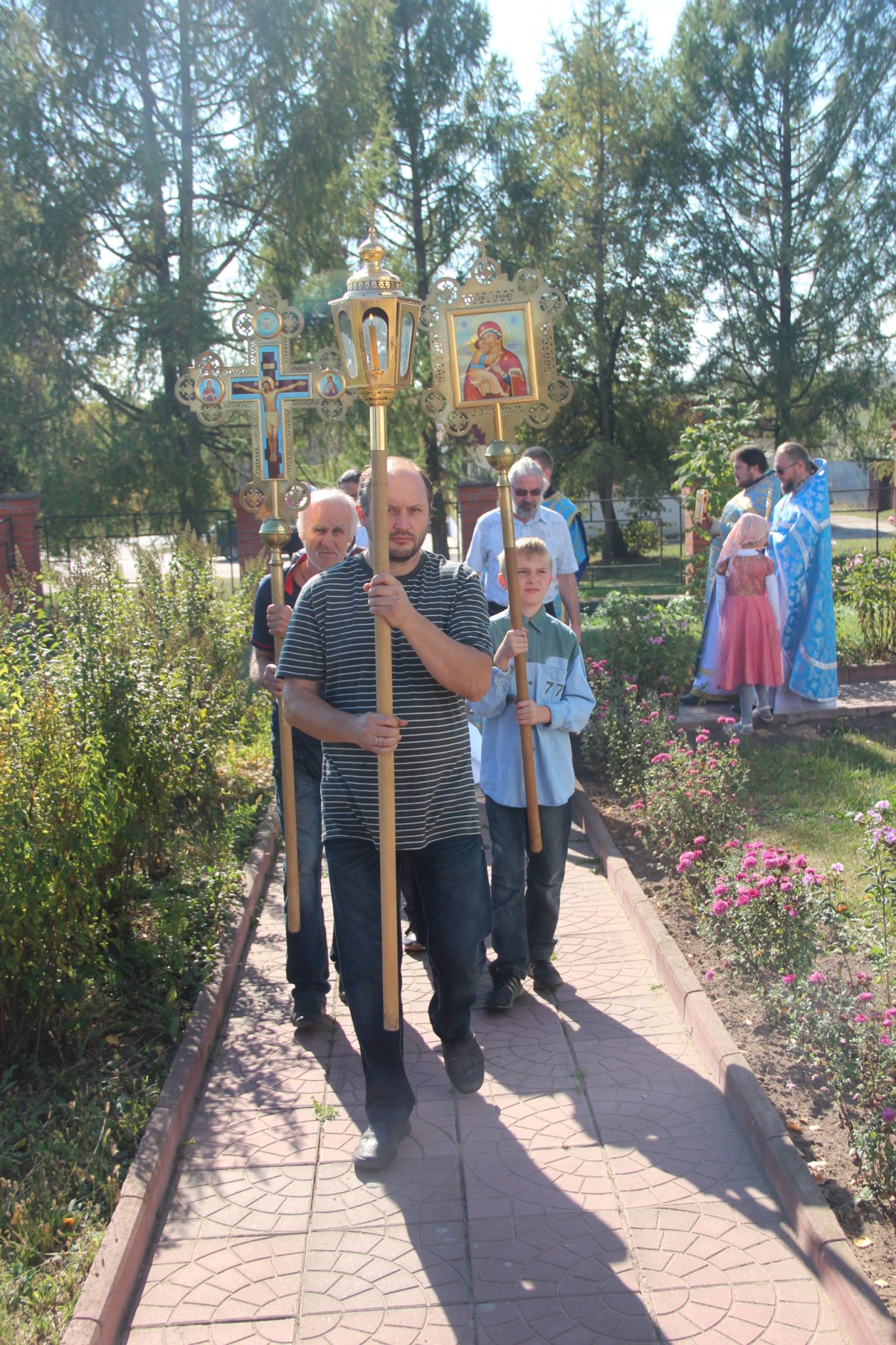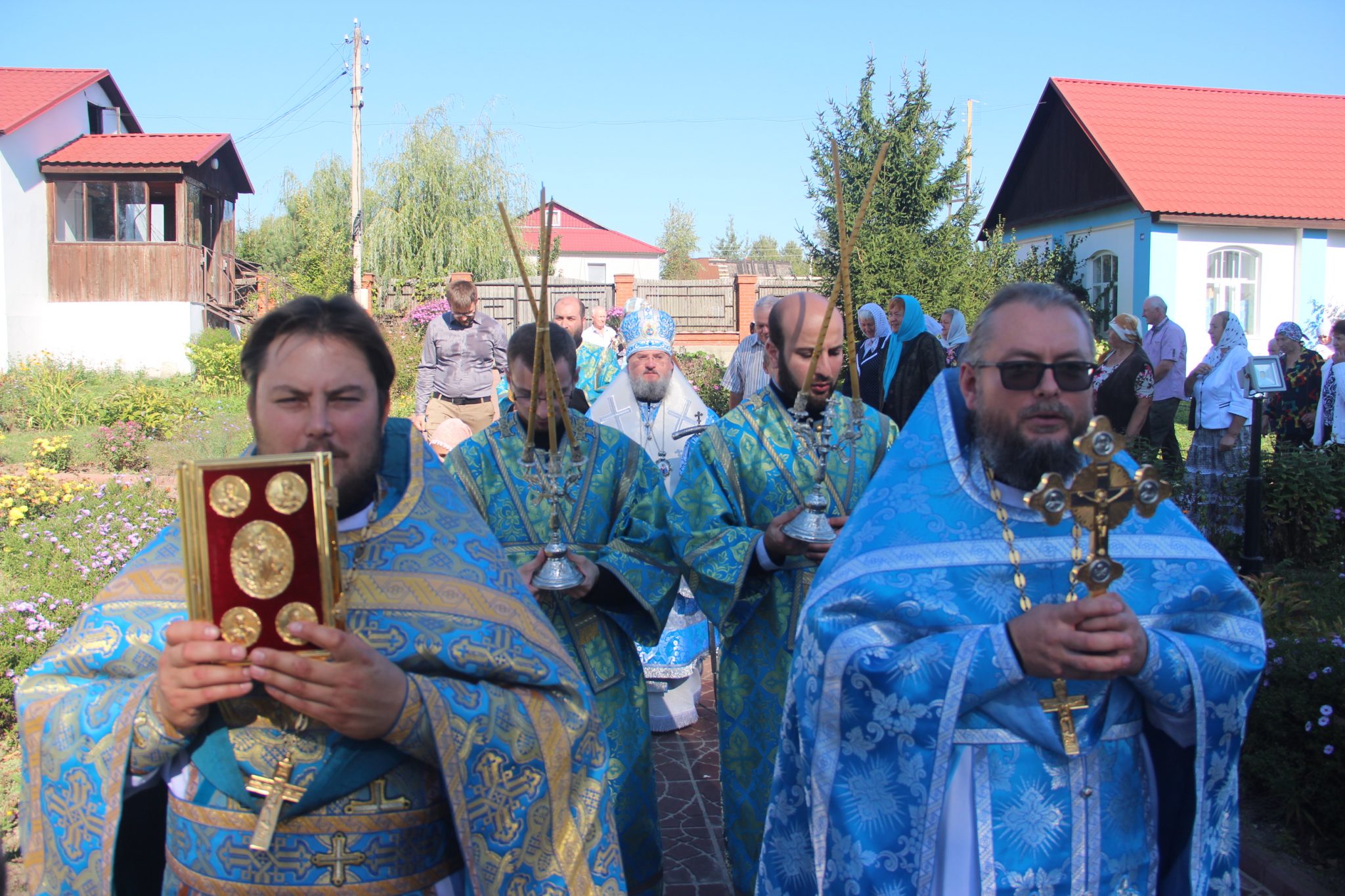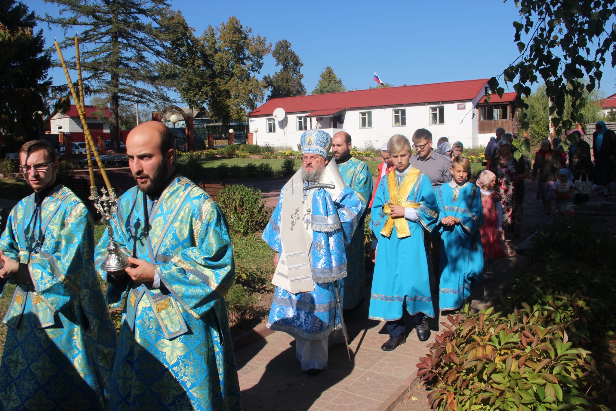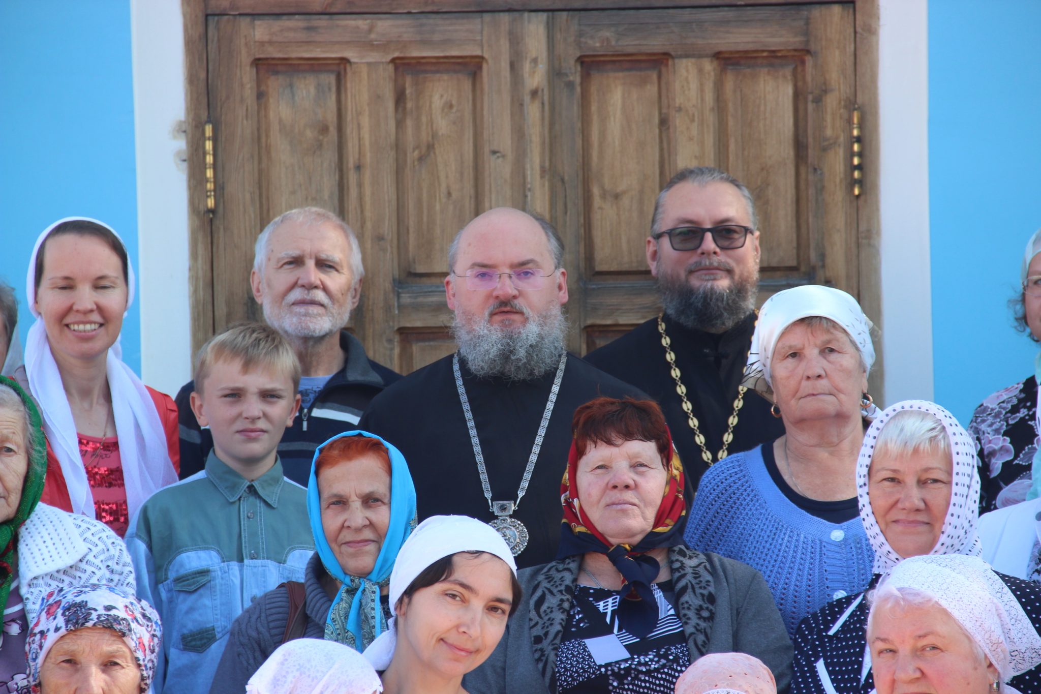 По отпусте литургии священнослужители совершили праздничное молебное пение Божией Матери и крестный ход вокруг храма в завершении которого, вознеся молитву Царице Небесной, владыка обратился к богомольцам с проповедью.
