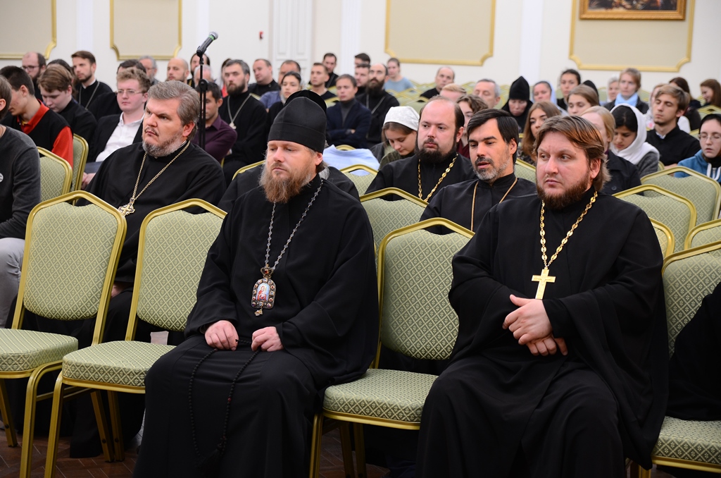 Владыка Климент представил заслуженного профессора Московской духовной академии, апологета, проповедника, видного православного катехизатора современности присутствующим в актовом зале студентам и преподавателям  Калужской духовной семинарии и Калужского духовного училища.