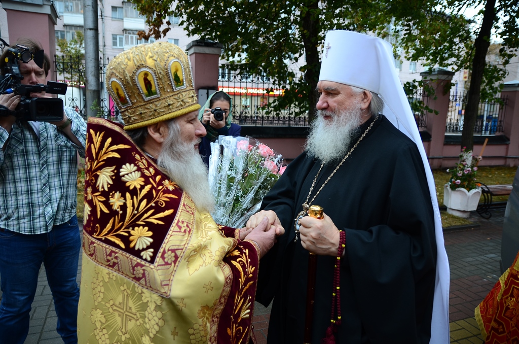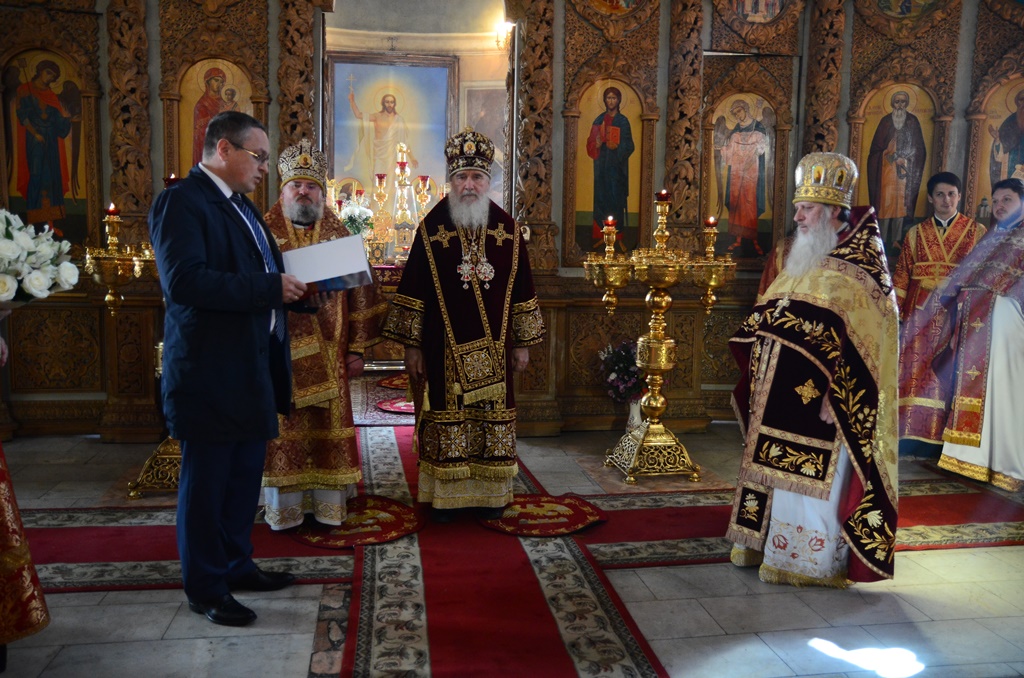Владыка Никита поздравил юбиляра и преподнес ему наперстный крест с украшениями и букет цветов.
