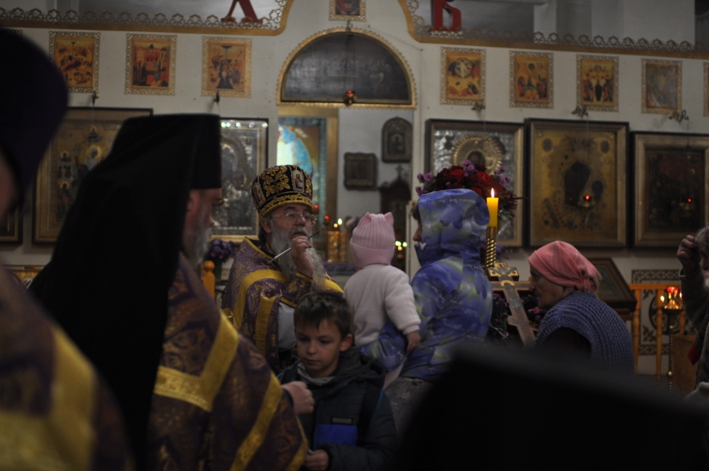 Совершив три земных поклона перед святым Крестом, все, приложившись к нему, подошли под помазание святым елеем.