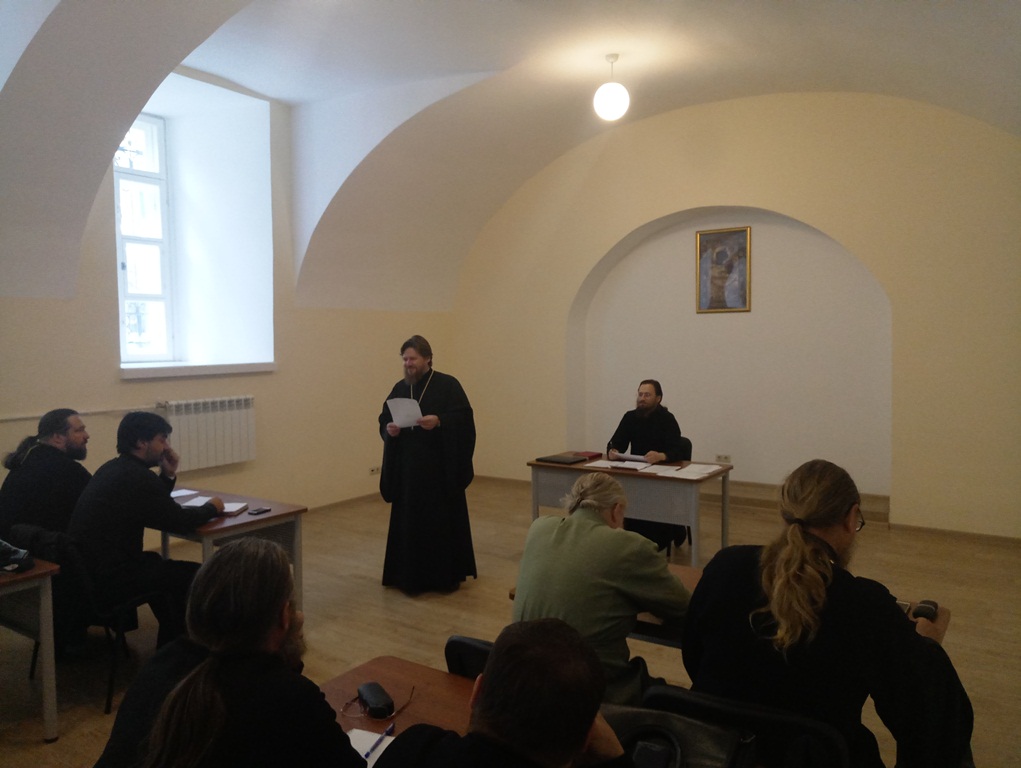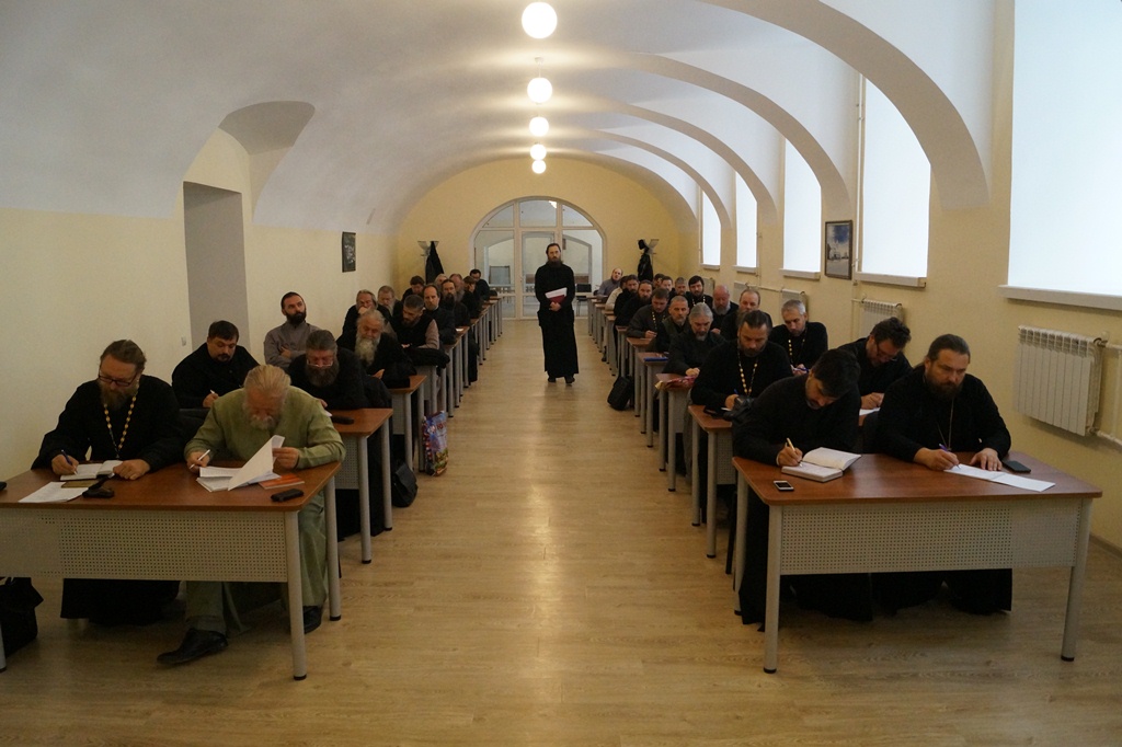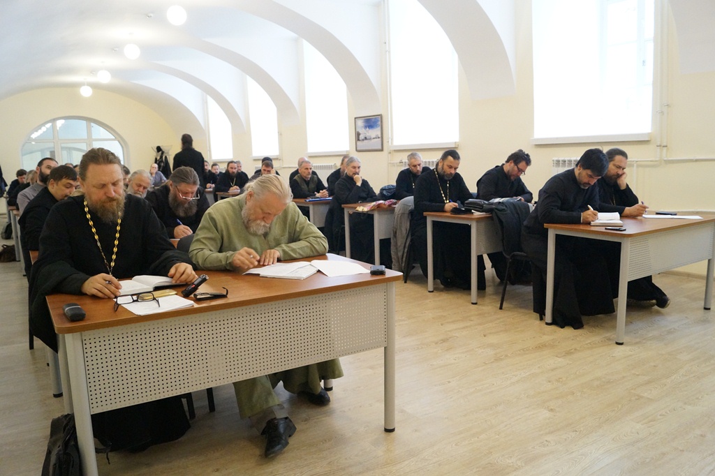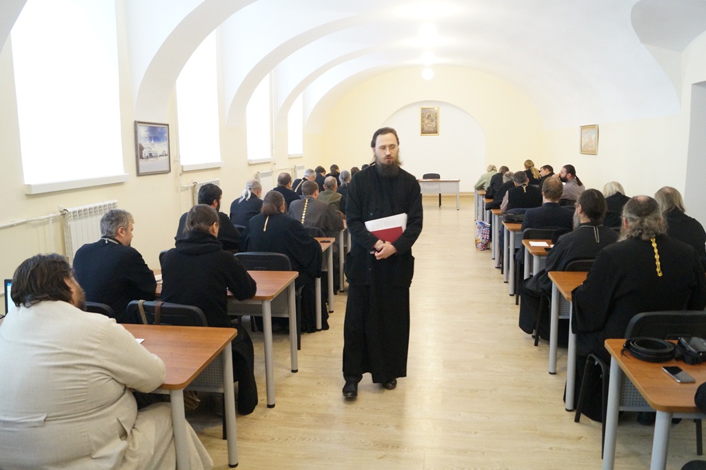 Перед началом программы, к священнослужителям обратился епископ Тарусский Серафим, викарий Калужской епархии. Владыка Серафим отметил высокую явку священнослужителей, что говорит о понимании ответственности, которая возлагается на духовенство Калужской митрополии. Так же, епископ Серафим рассказал о программе, которую предстоит освоить отцам.