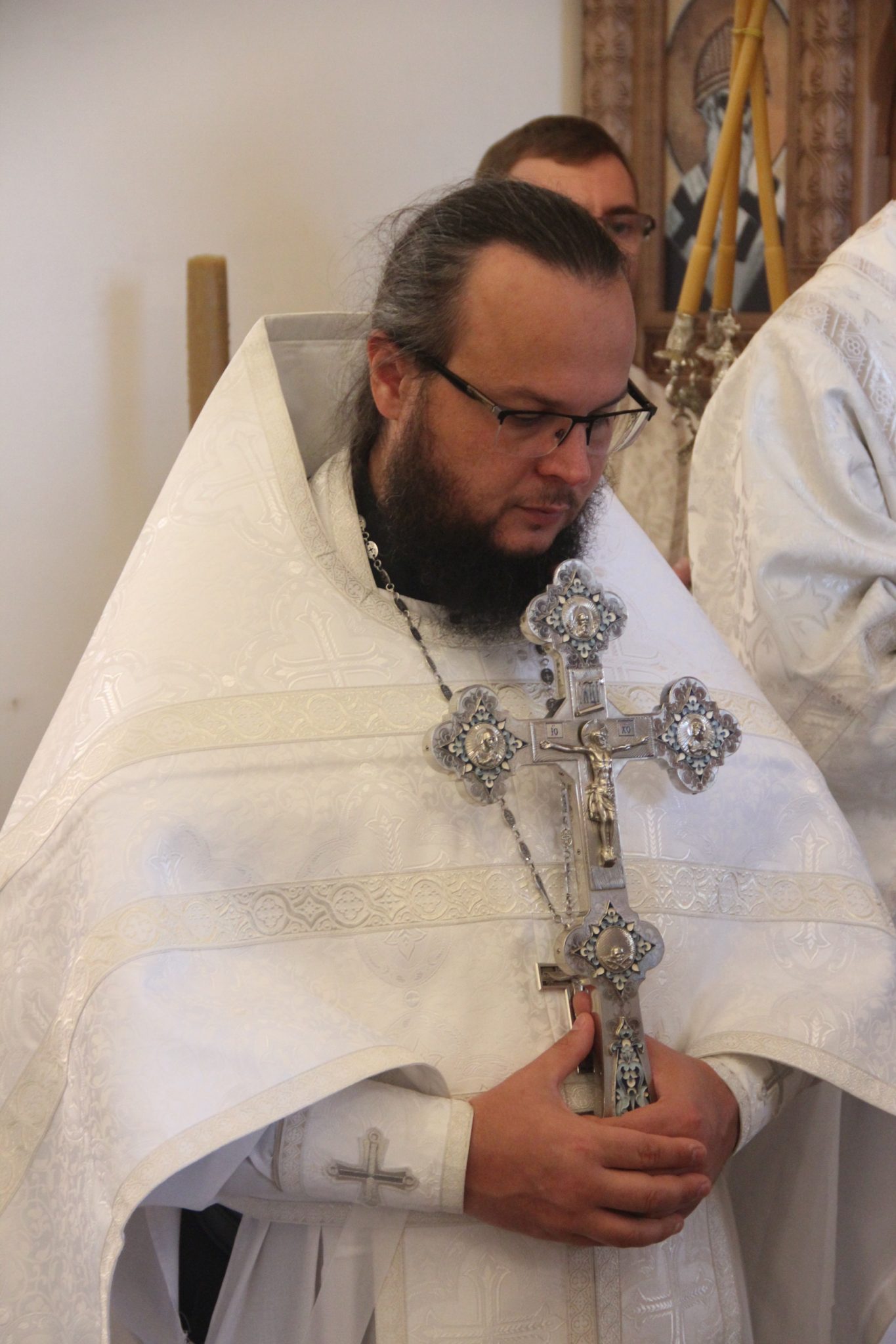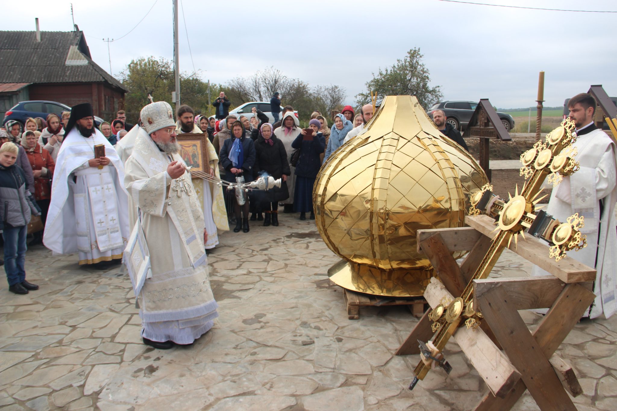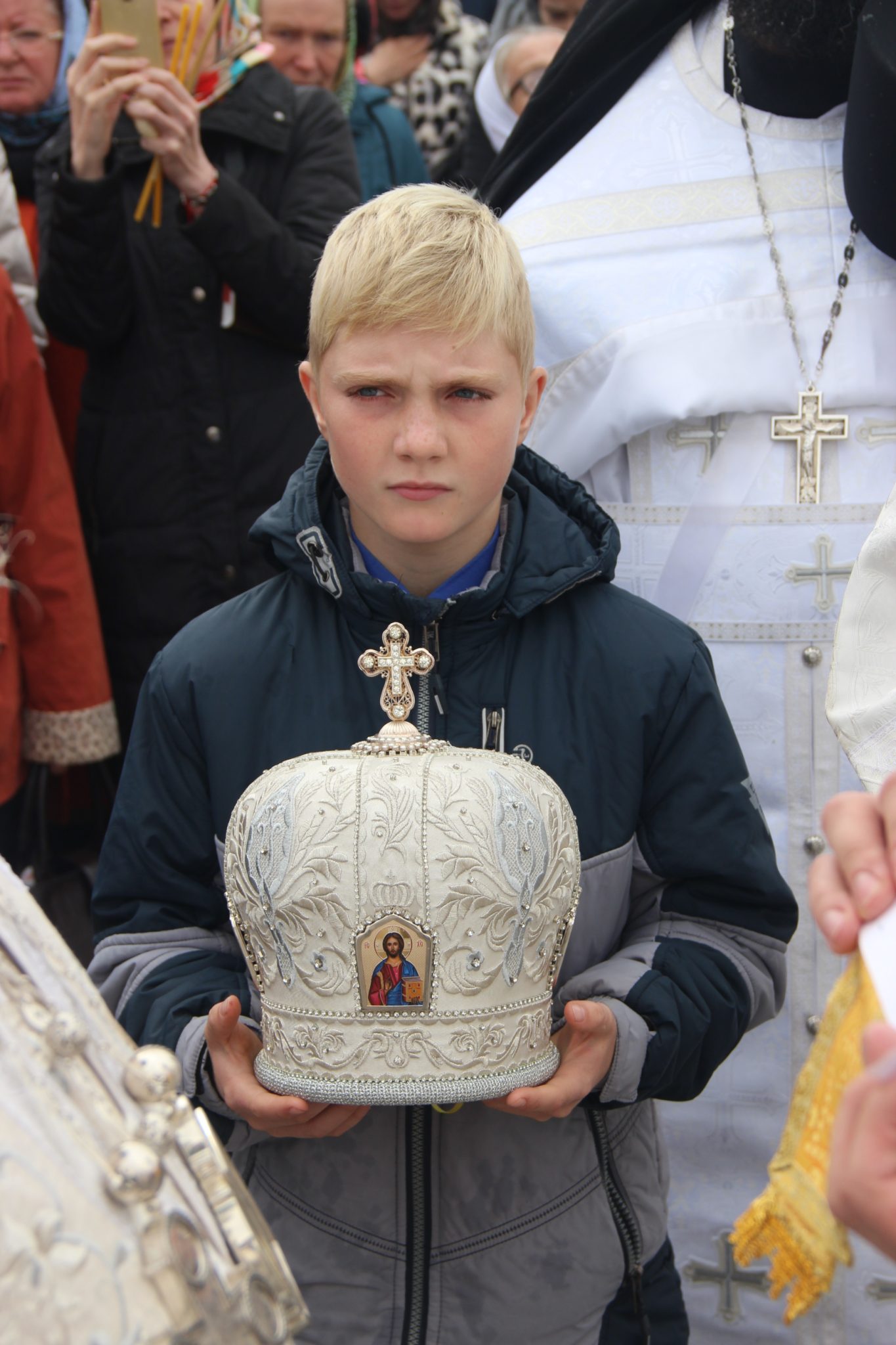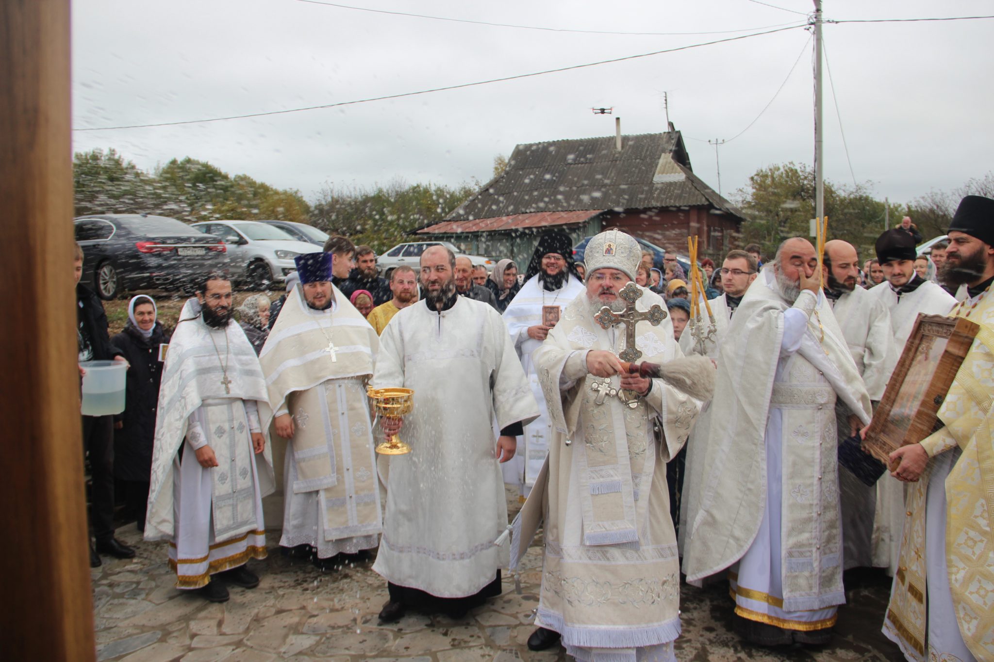 По отпусте литургии священнослужители совершили праздничный молебен и крестный ход вокруг храма, на котором, по прочтении Евангелия, владыка освятил накупольный крест и купол для колокольни.