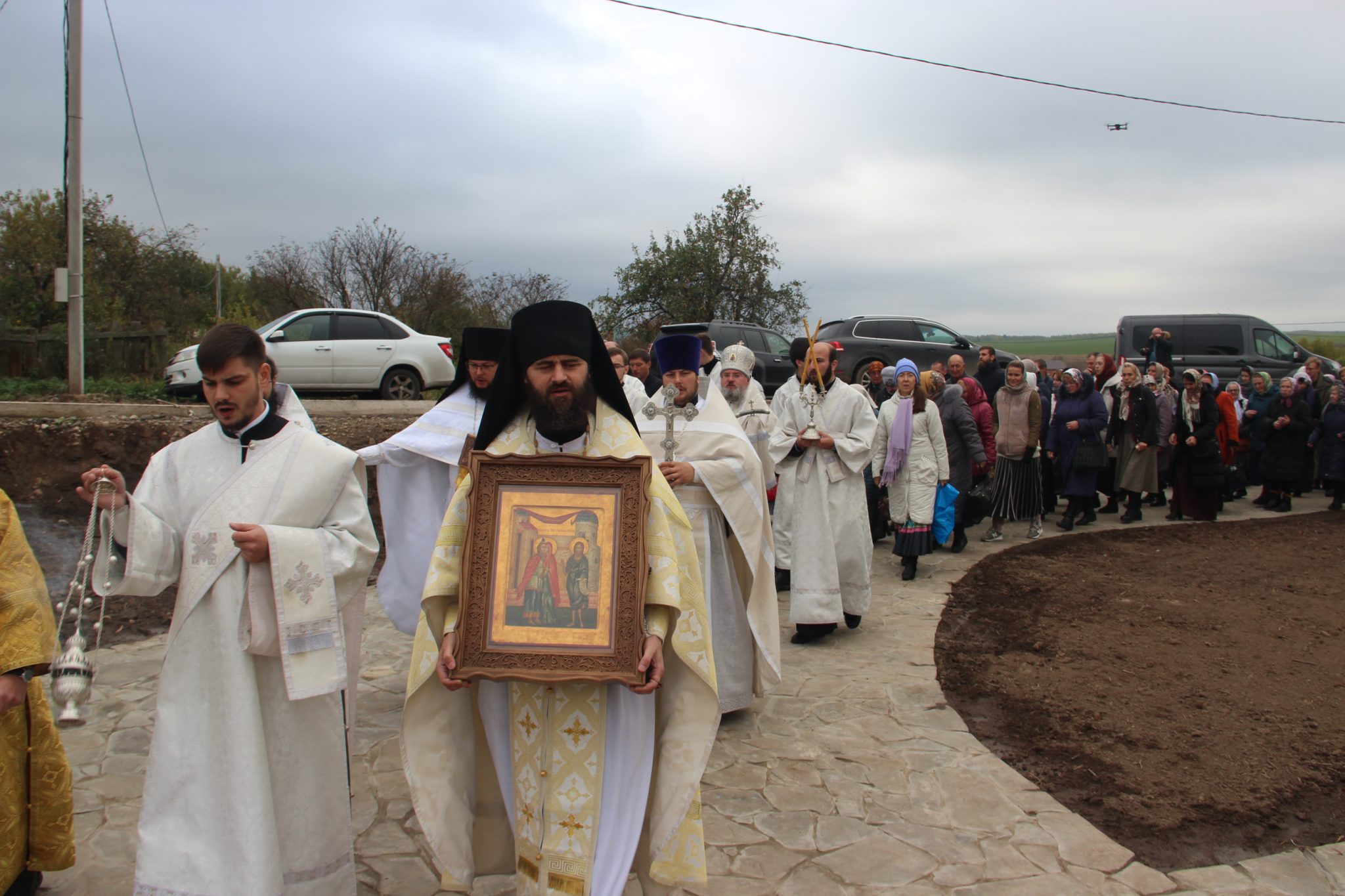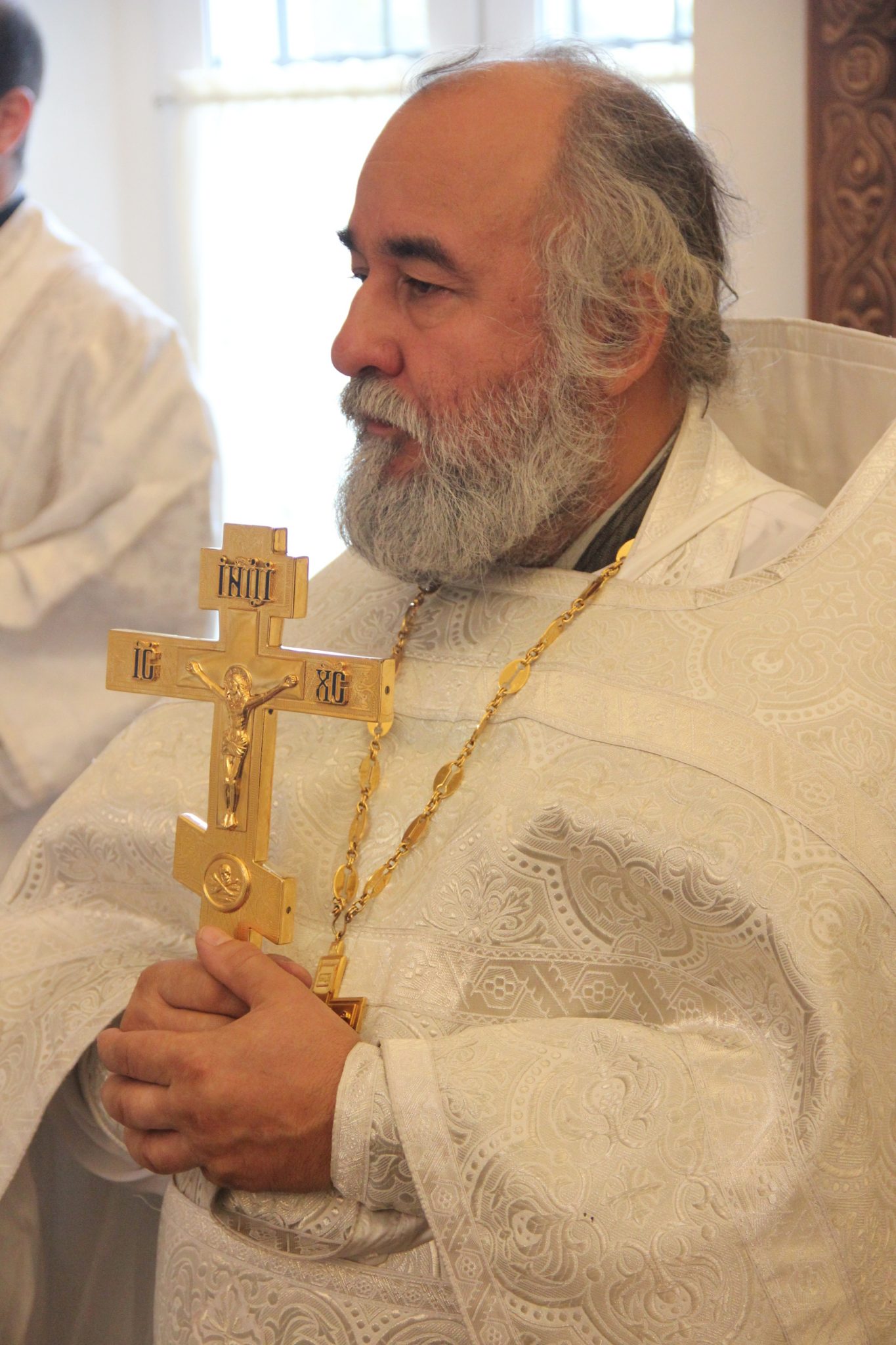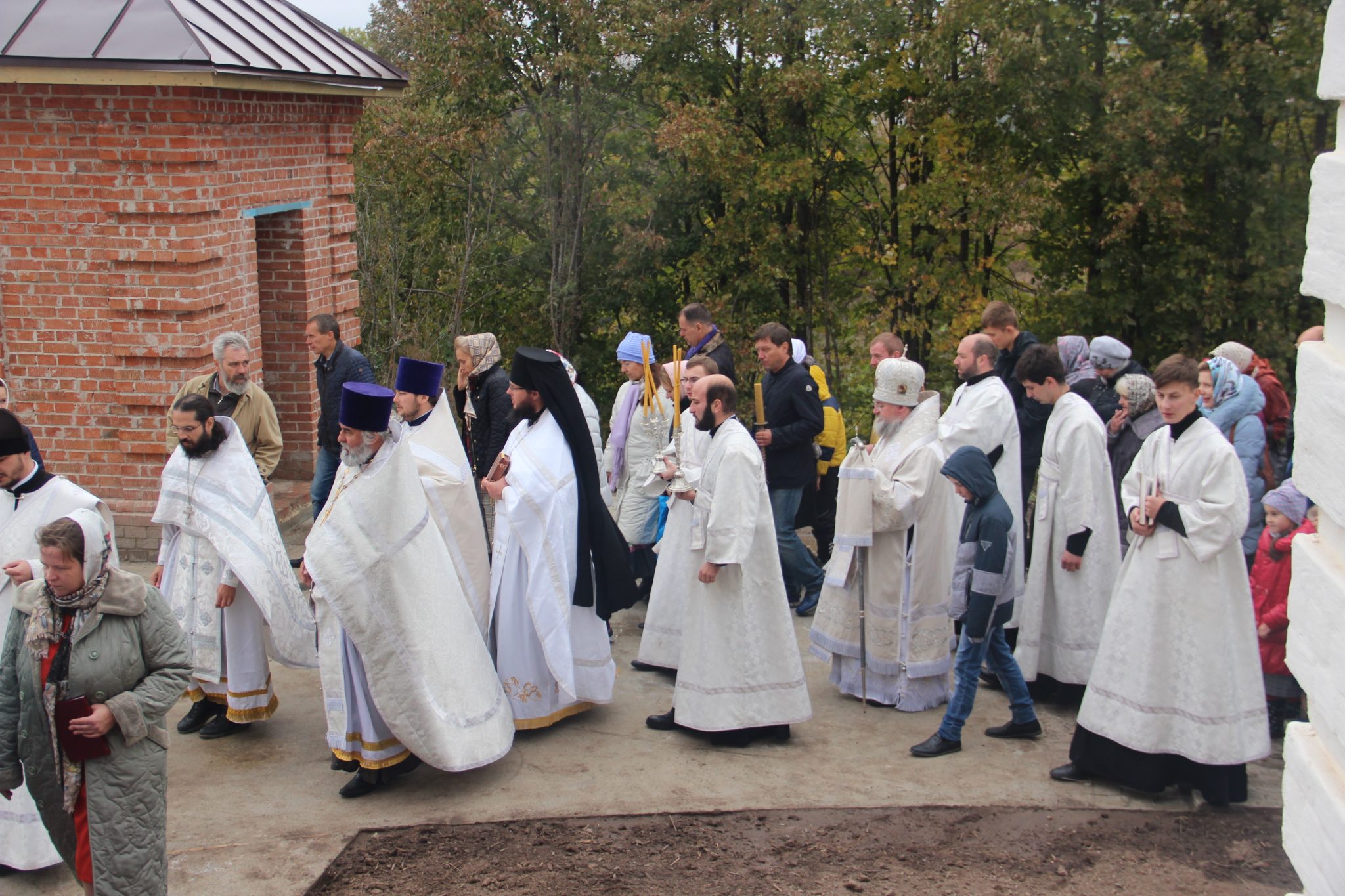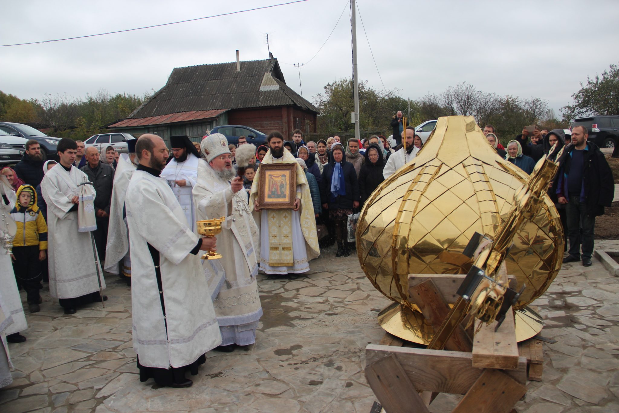 По отпусте литургии священнослужители совершили праздничный молебен и крестный ход вокруг храма, на котором, по прочтении Евангелия, владыка освятил накупольный крест и купол для колокольни.