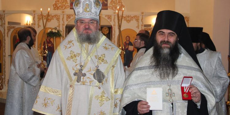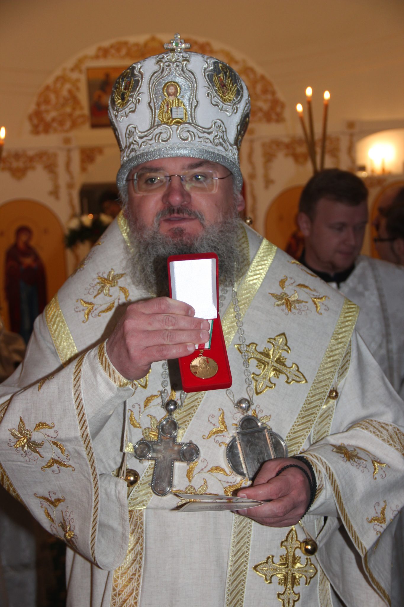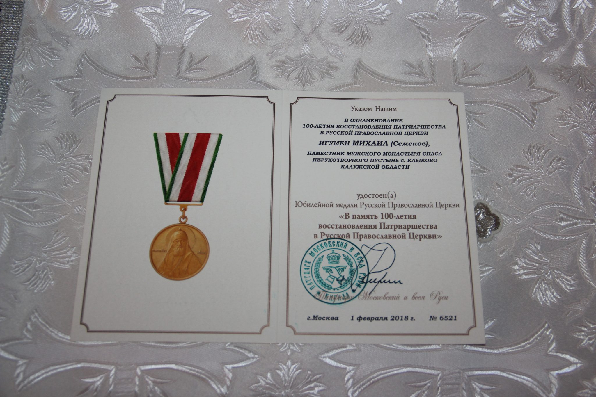 За богослужением владыка поздравил настоятеля монастыря игумена Михаила (Семенова) с днем тезоименитства и вручил ему, по благословению Святейшего Патриарха Кирилла, медаль в ознаменование столетия восстановления патриаршества в Русской Православной Церкви