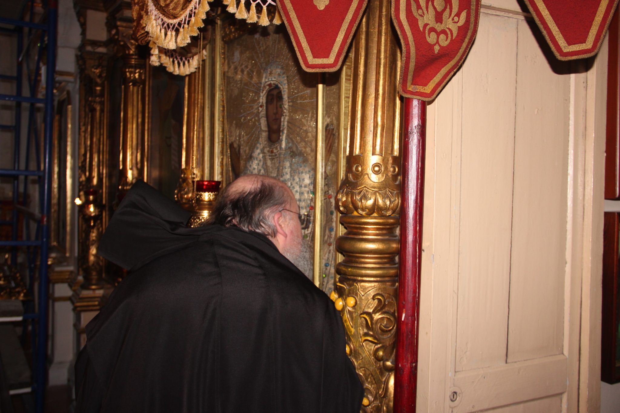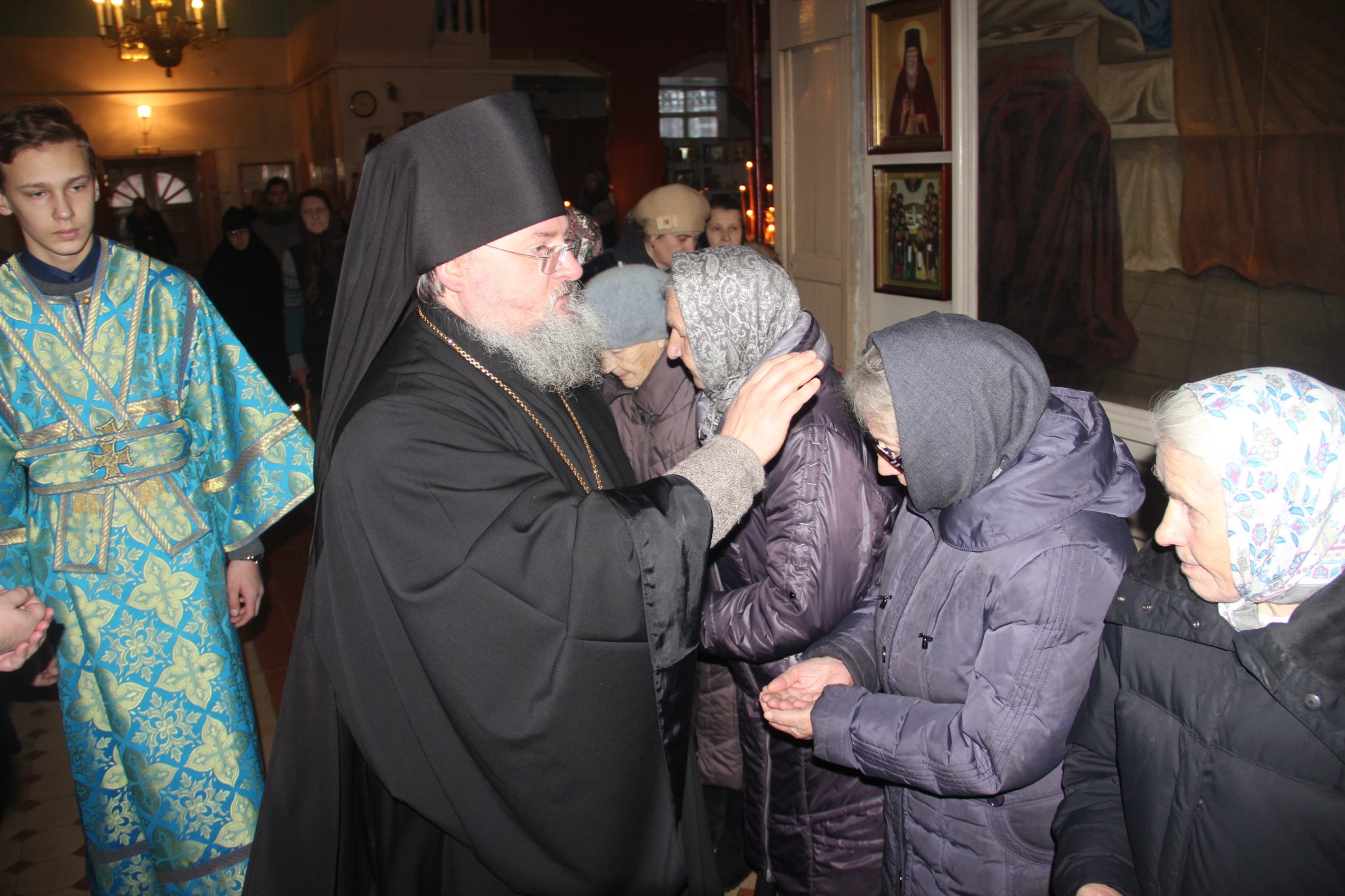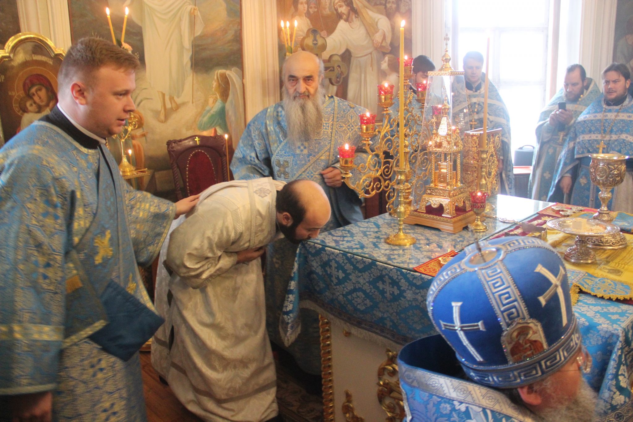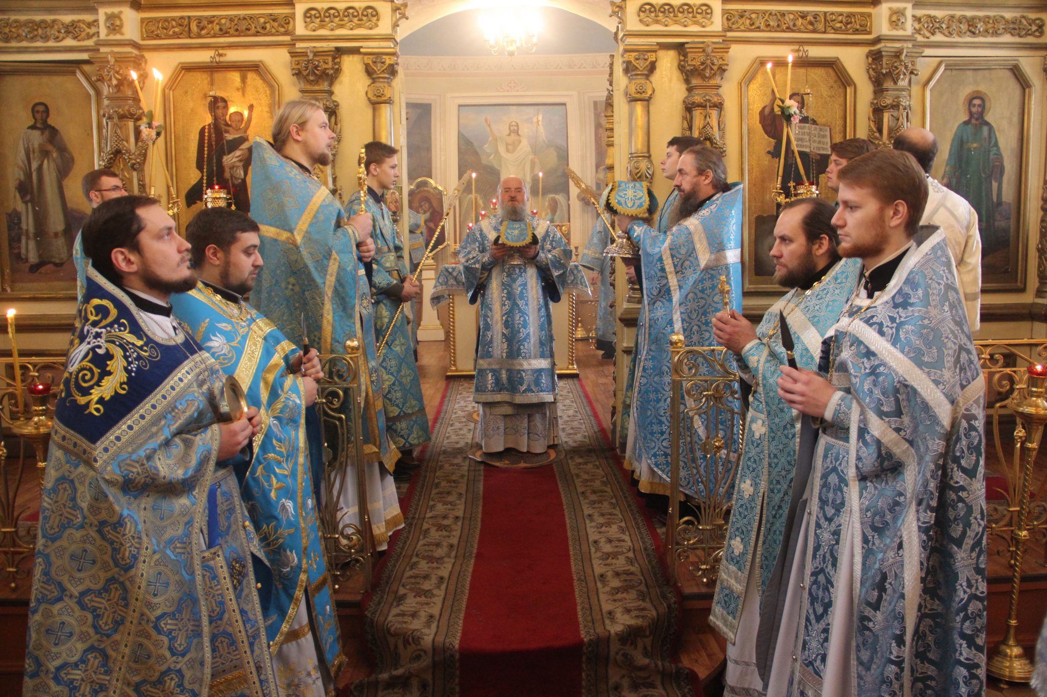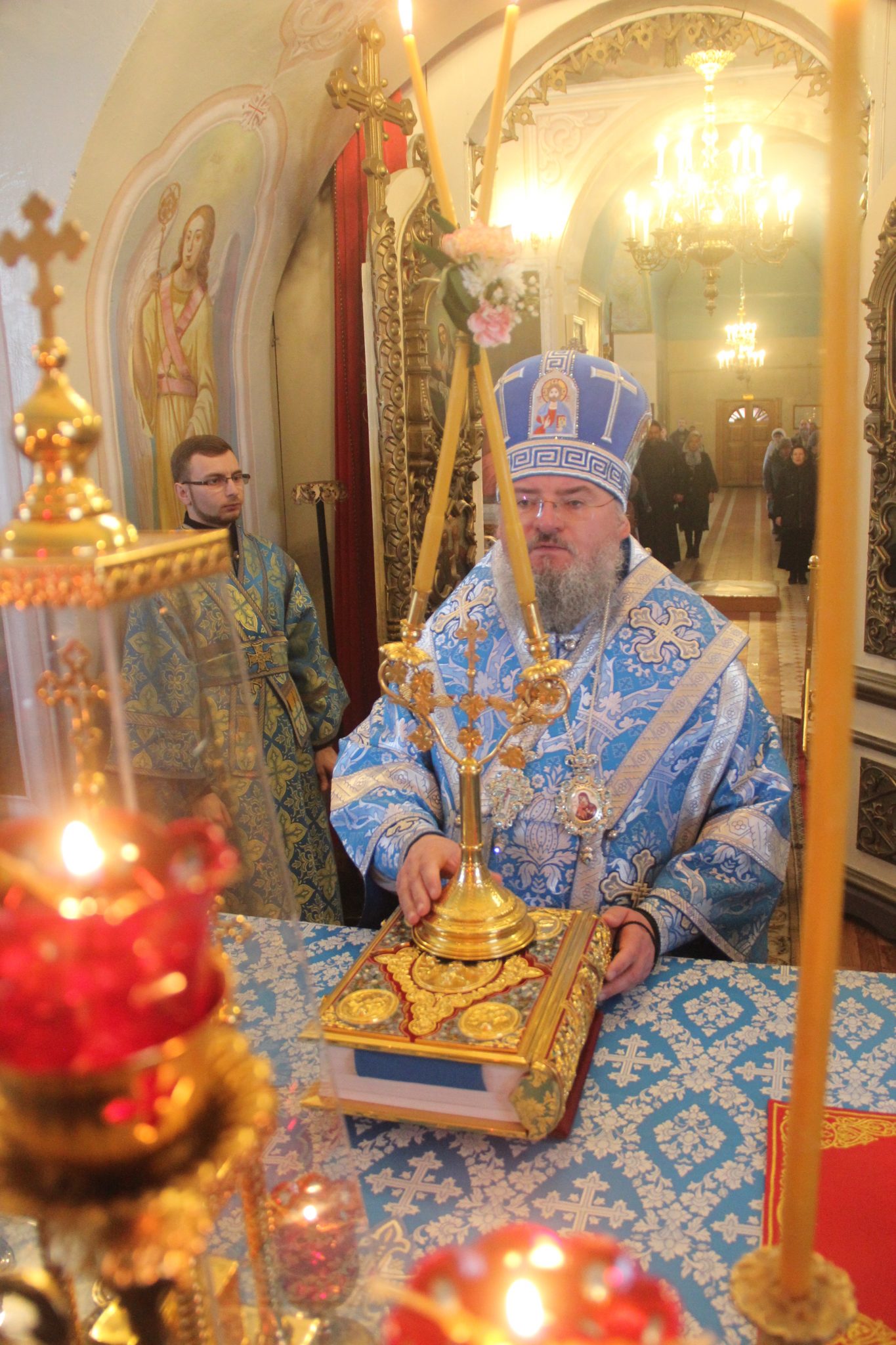 После отпуста литургии в центре храма, пред праздничной иконой, священнослужители совершили славление Божией Матери, а затем, вознеся молитву Царице Небесной, владыка обратился к богомольцам с архипастырским словом.