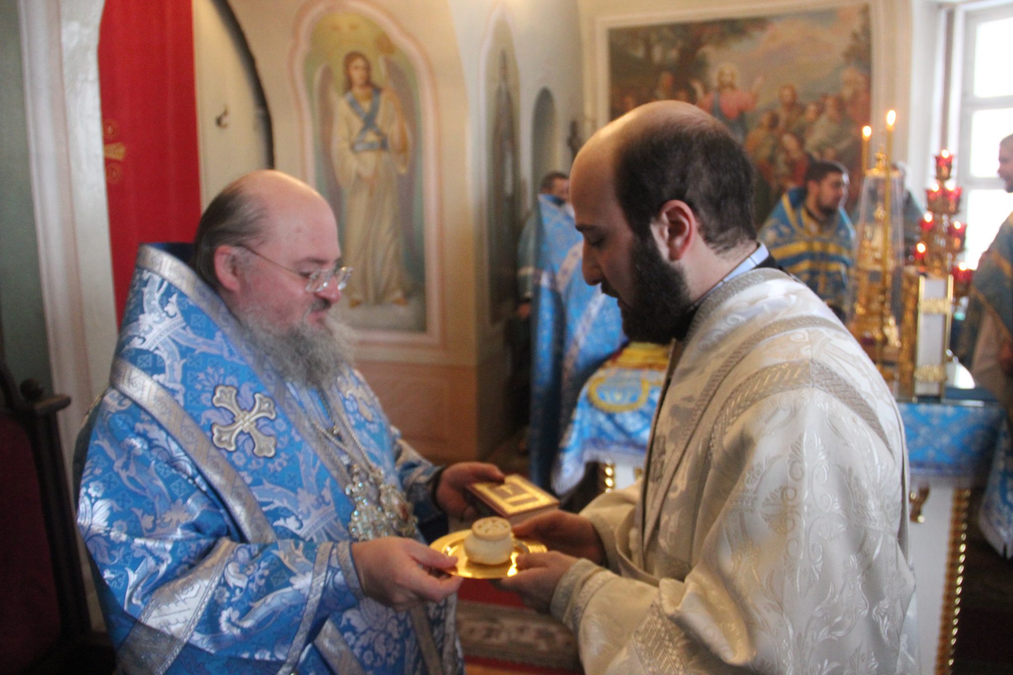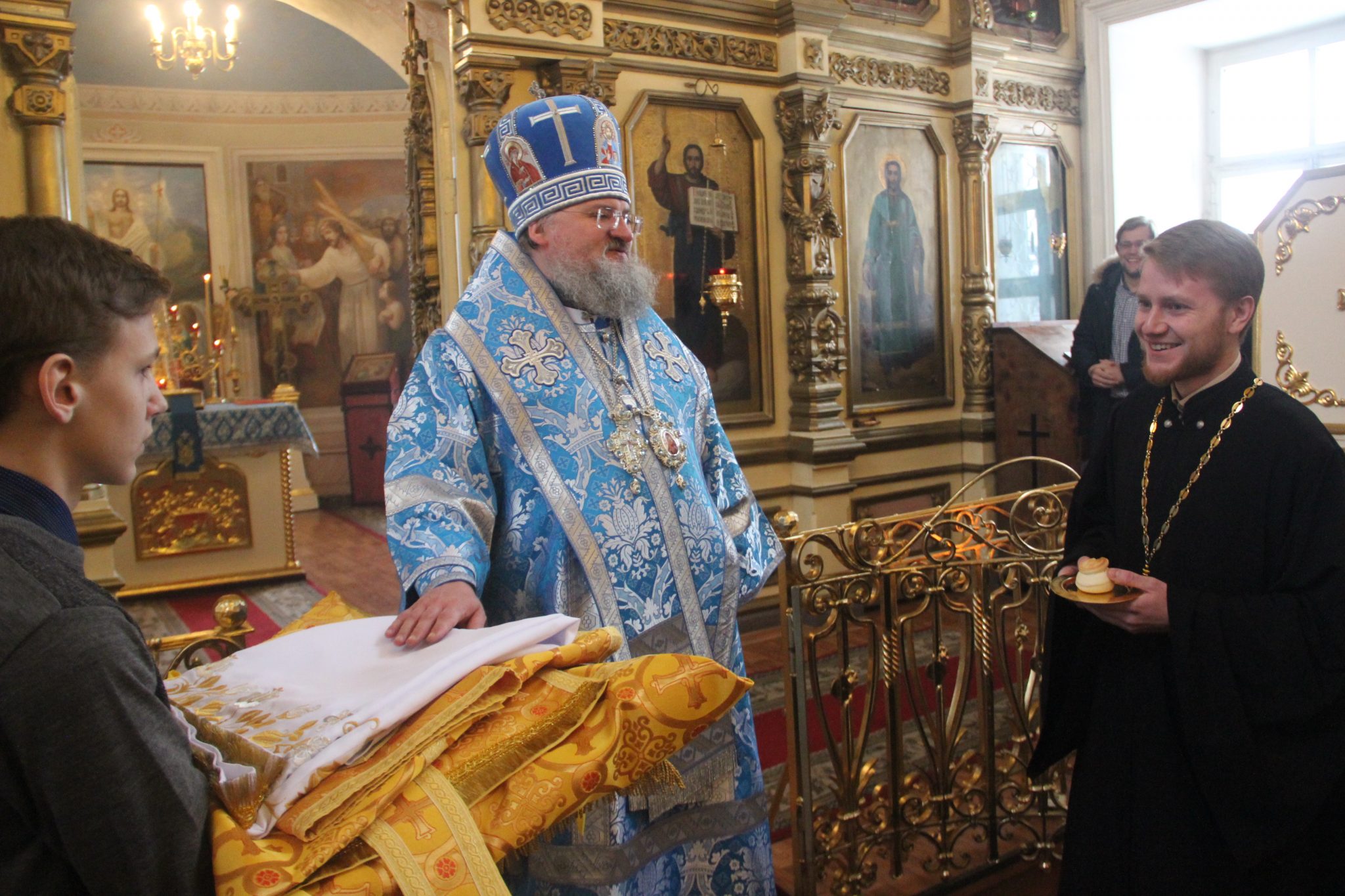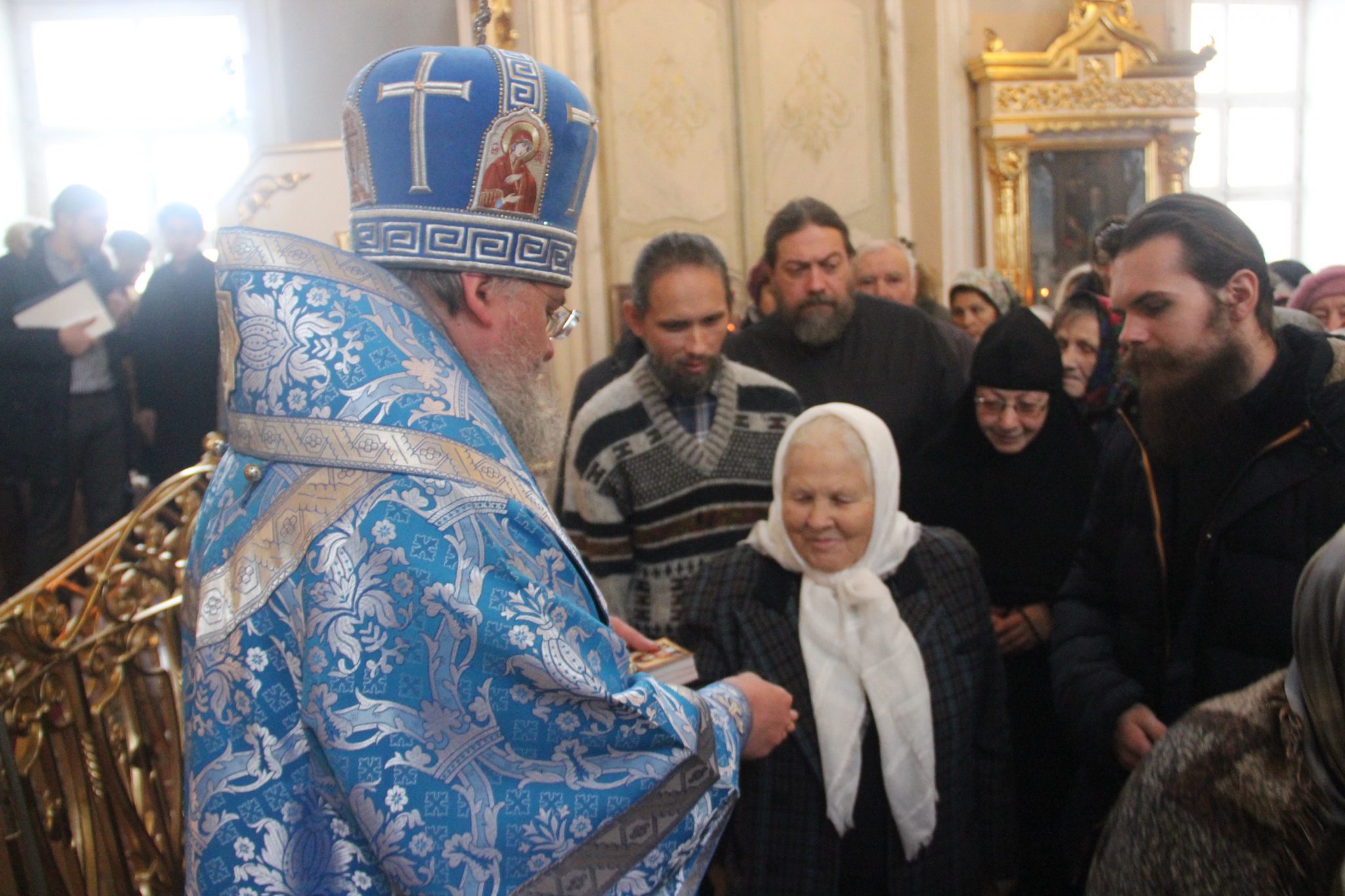 Во внимание к усердному пастырскому служению и в связи с днем иерейской хиротонии и юбилейной датой со дня рождения владыка преподнес в дар комплект иерейского облачения клирику Успенского кафедрального собора иерею Елисею Тимофееву, а всем богомольцам раздал иконки святителя Луки Крымского, освященные на его честных мощах.
