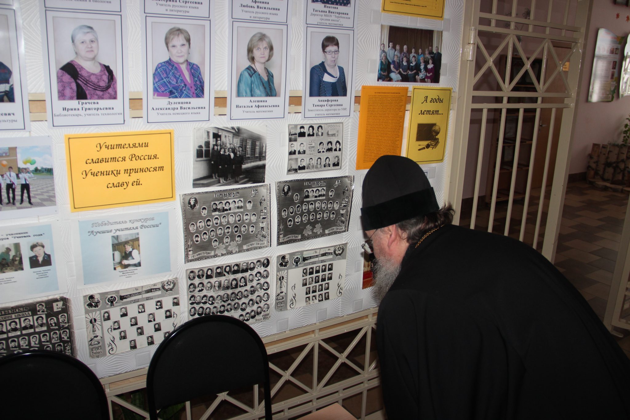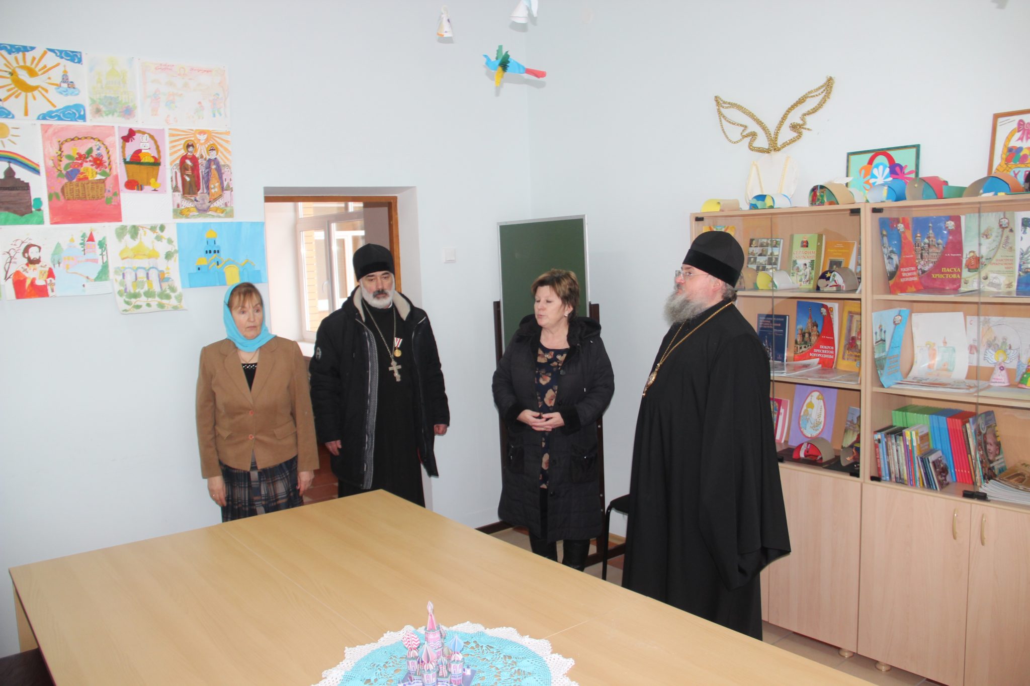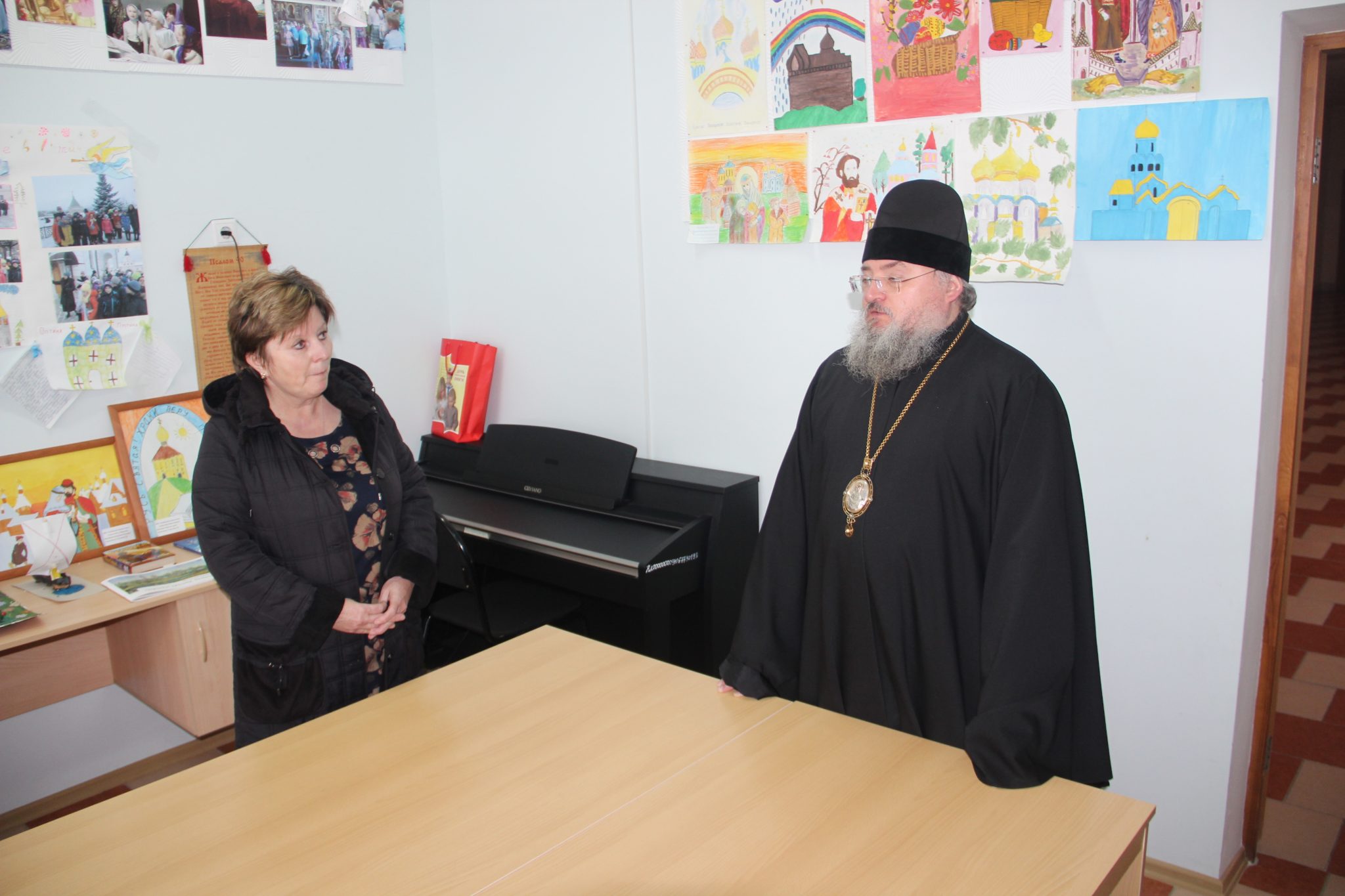 Директор школы Ипатова Татьяна Викторовна и настоятель храма Покрова Пресвятой Богородицы иерей Геннадий Сафиев показали владыке аудиторию, выделенную для занятий воскресной школы детей из сел Кудрявец и Теребень.