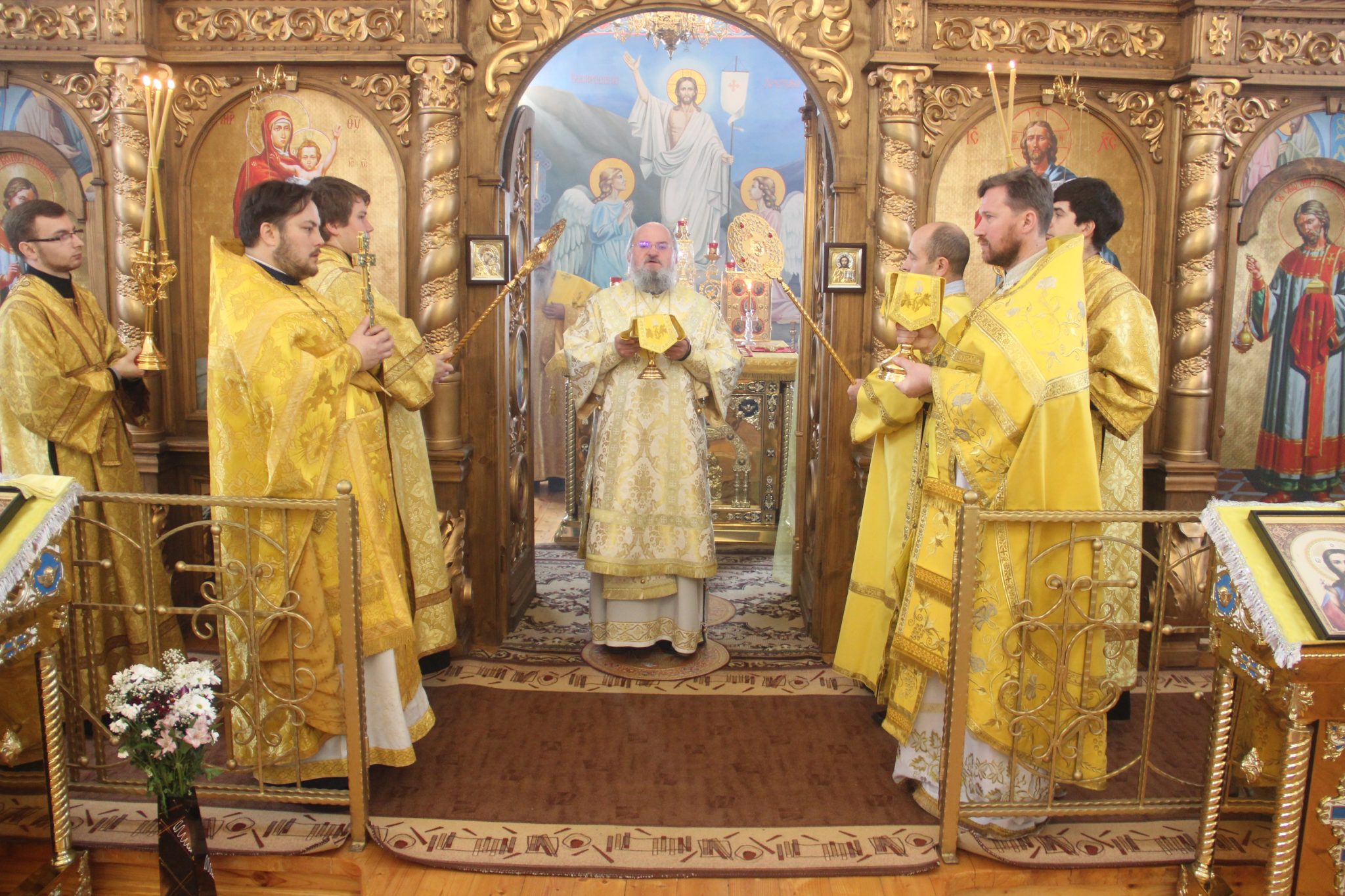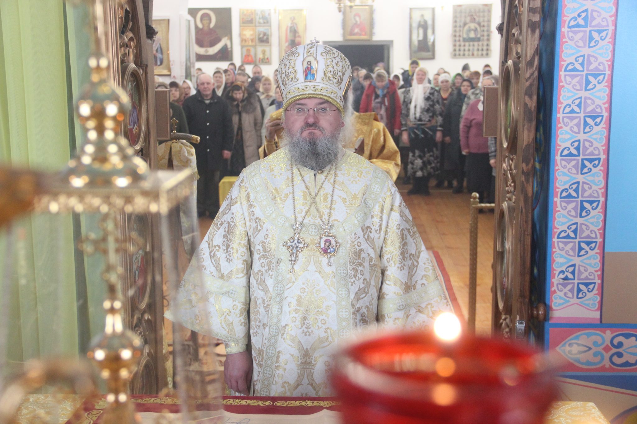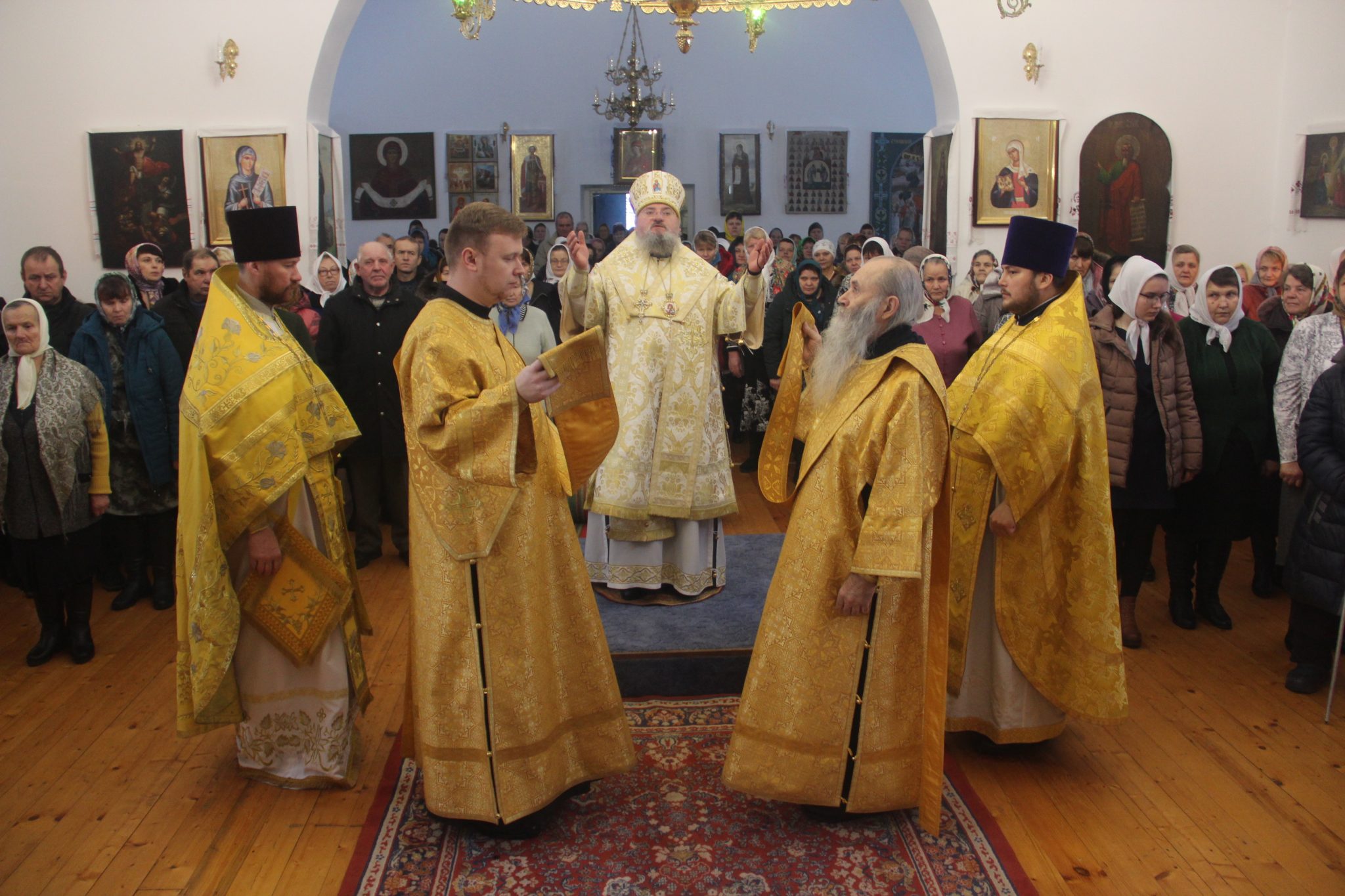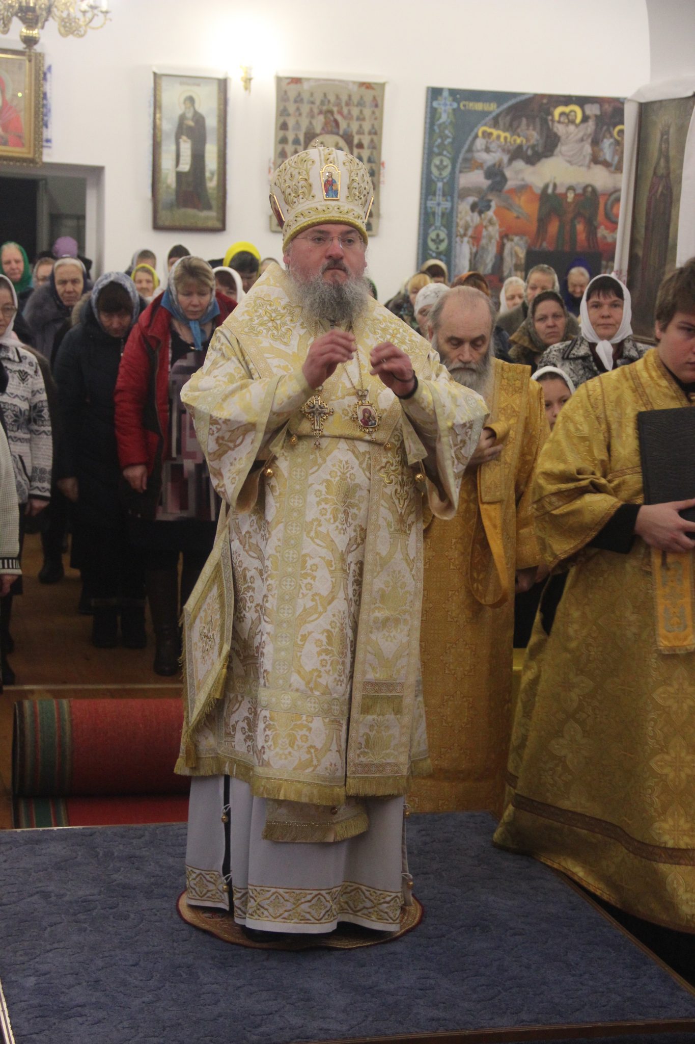 Его Преосвященству сослужили: настоятель храма протоиерей Александр Карпов, протоиерей Антоний Хатунцев, диакон Евгений Ковригин и иеродиакон Виталий (Павленко). По отпусте литургии владыка обратился к богомольцам с архипастырским словом.