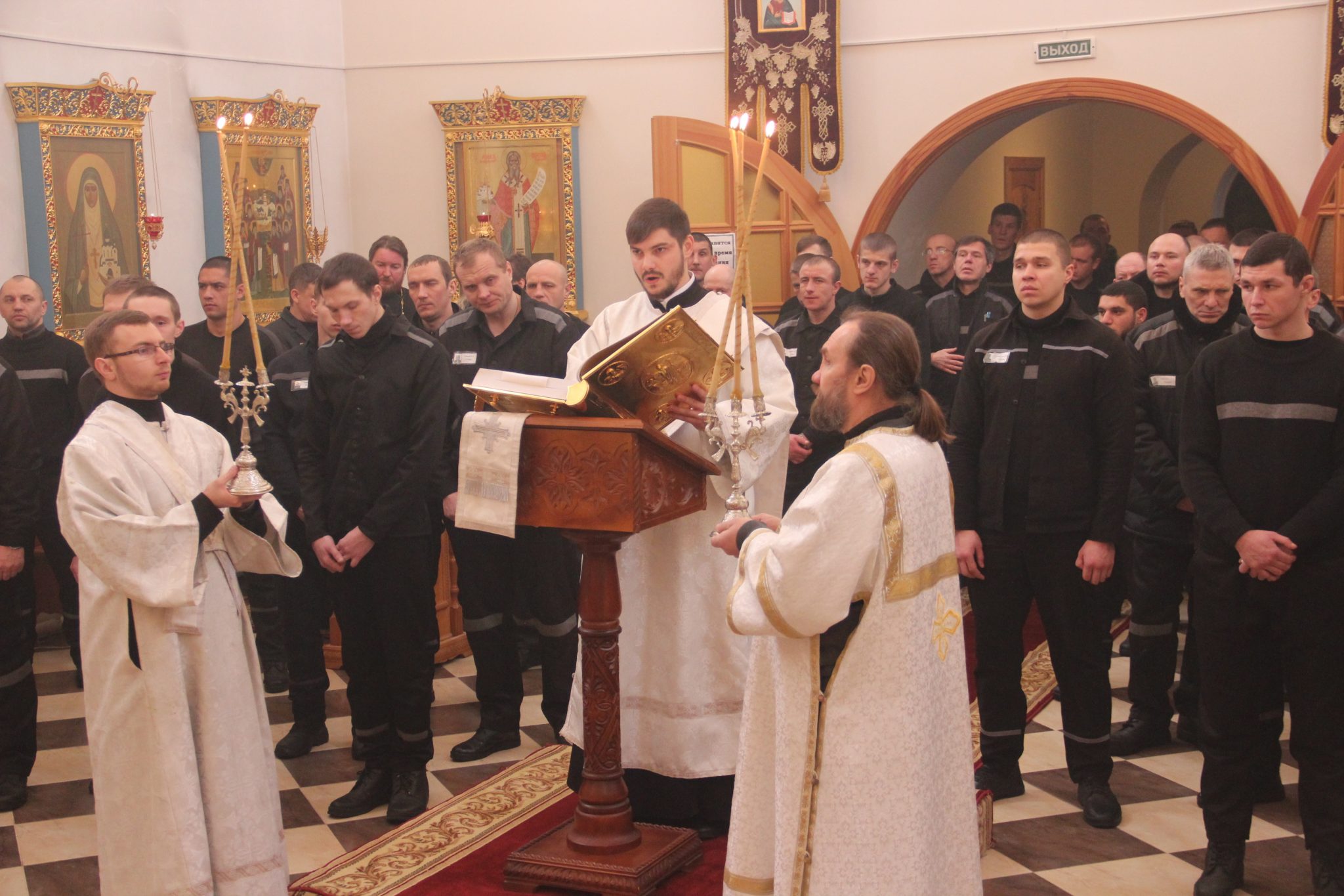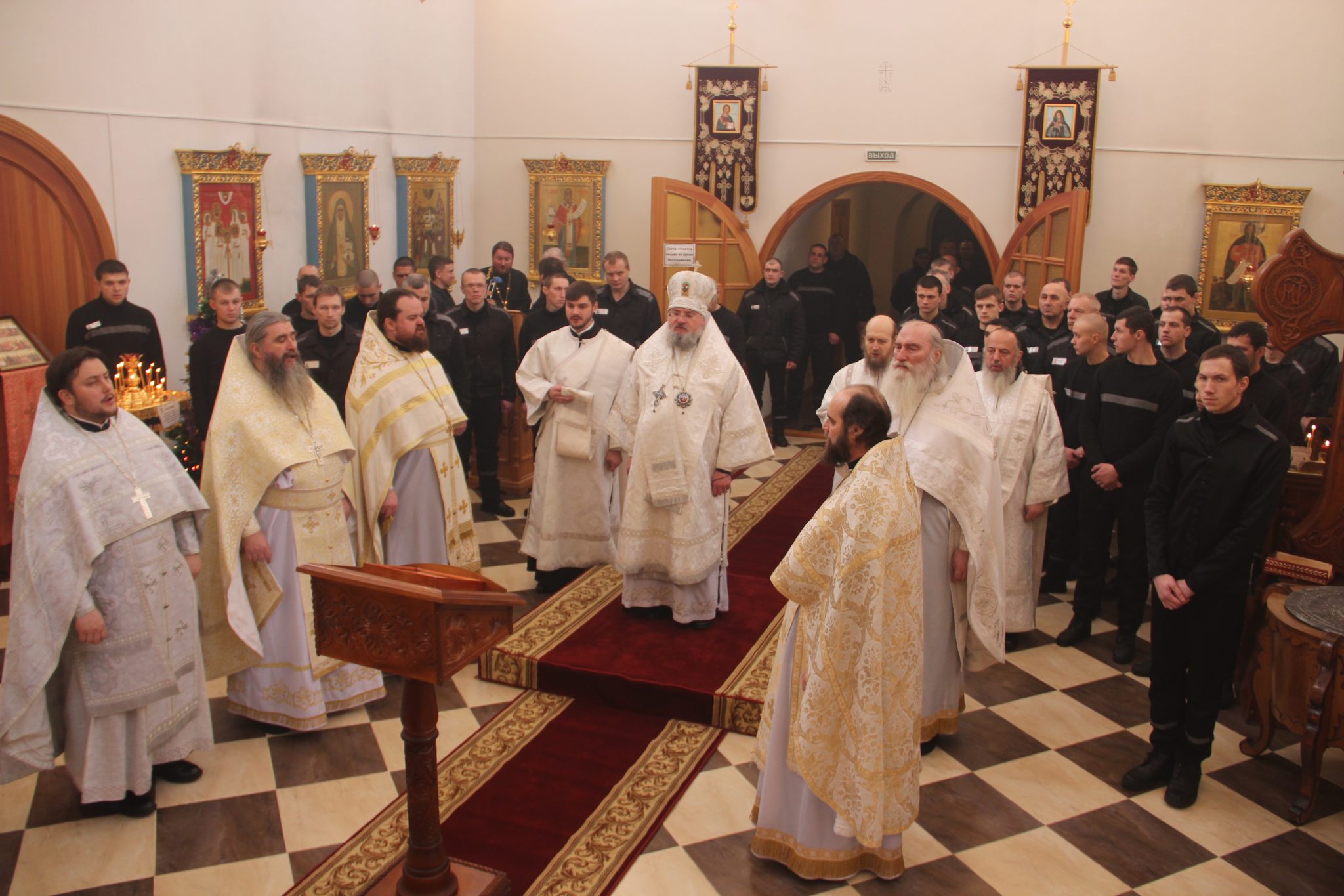 Архипастырю сослужили: протоиерей Дмитрий Сахаров – глава отдела по работе с исправительными учреждениями Козельской епархии, протоиерей Сергий Сычев, протоиерей Антоний Хатунцев, диакон Евгений Васильев, иеросхимонах Серафим, иеромонах Силуан – насельники монастыря Оптина Пустынь, окормляющие осужденных.