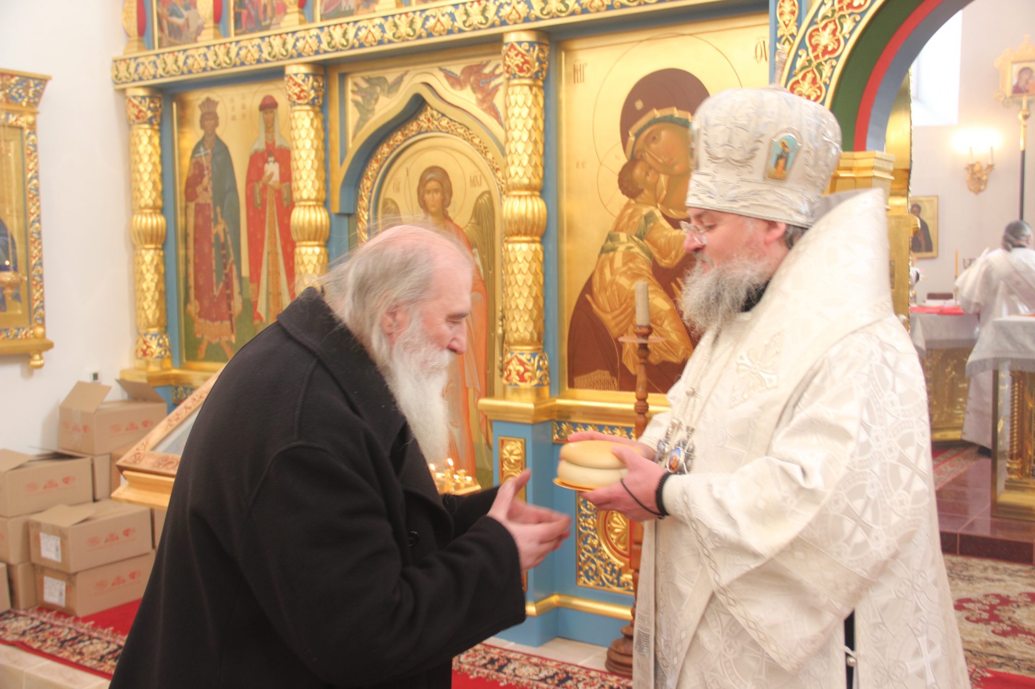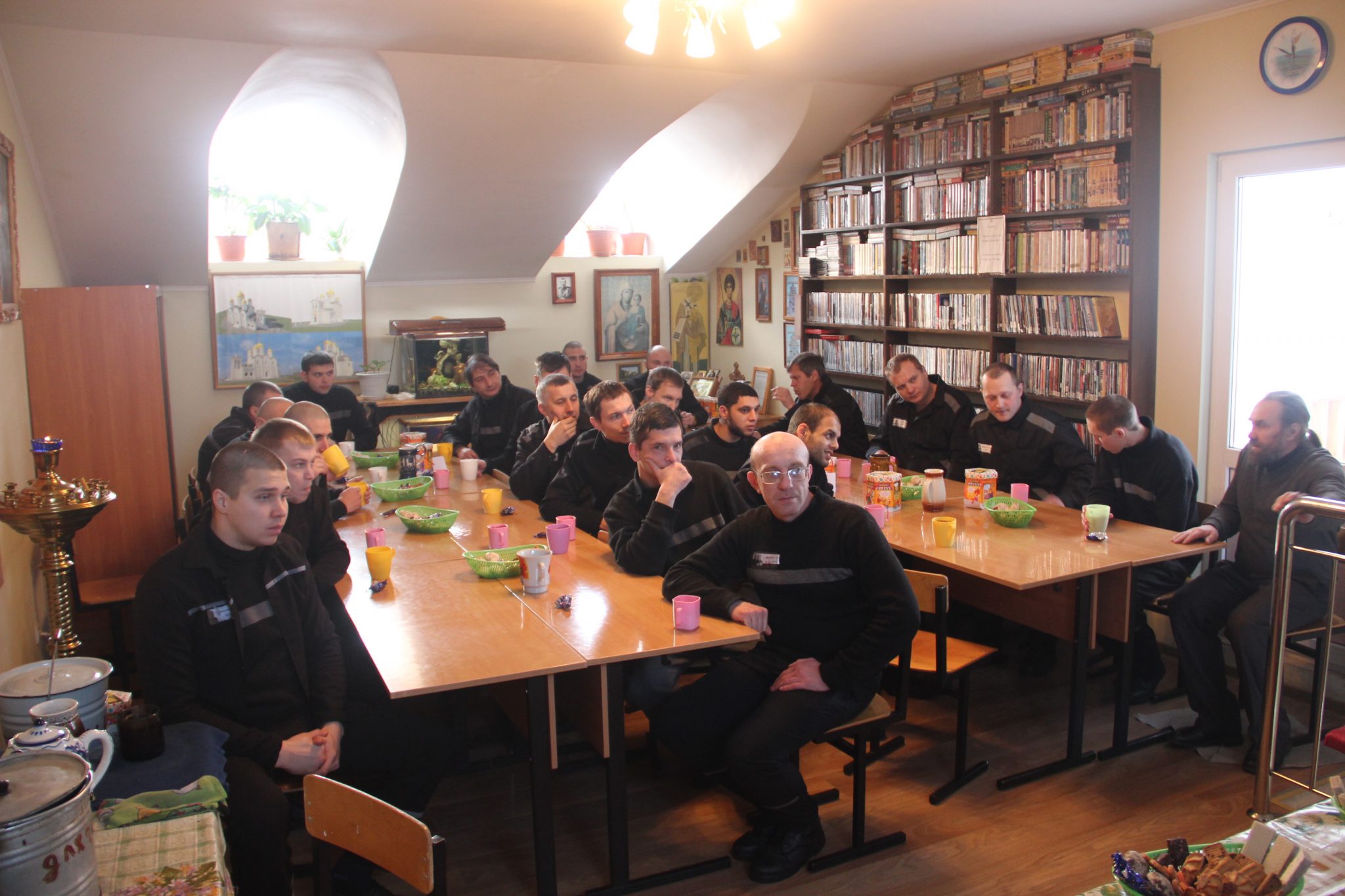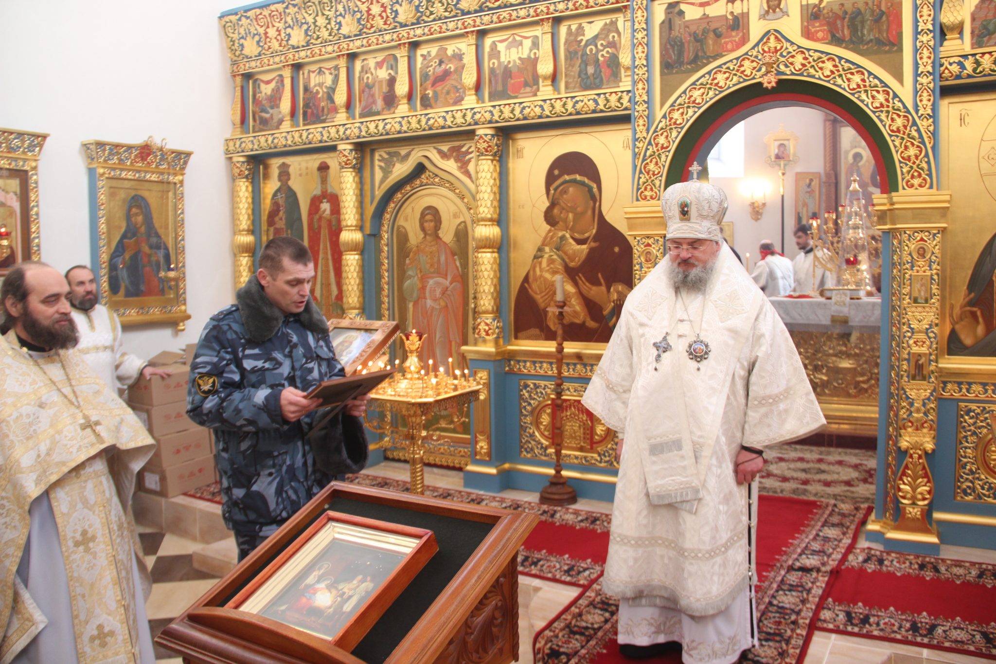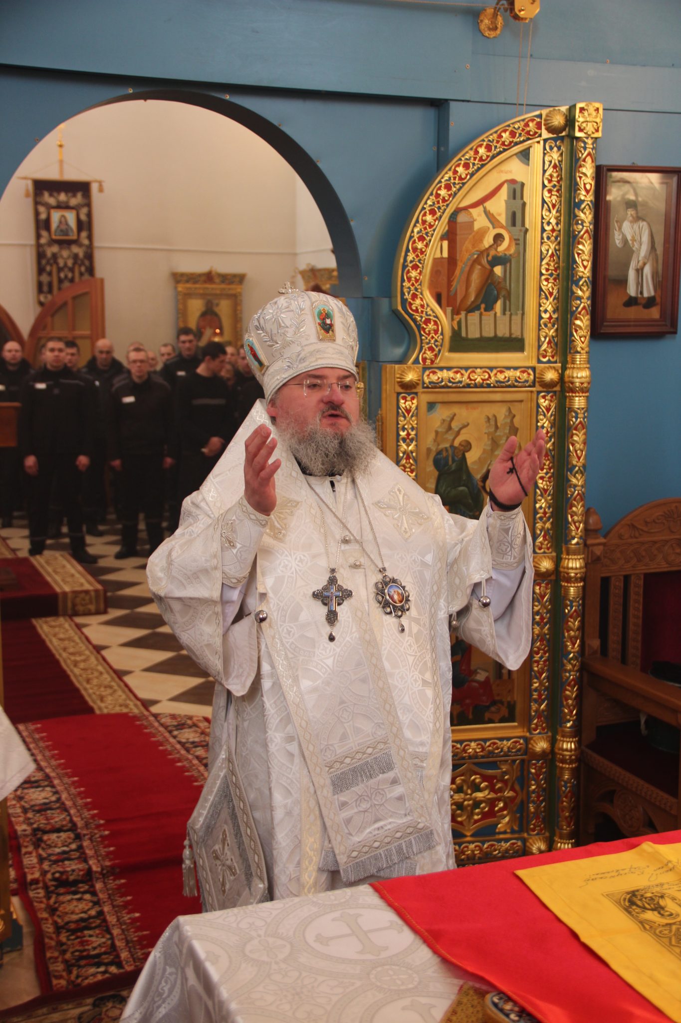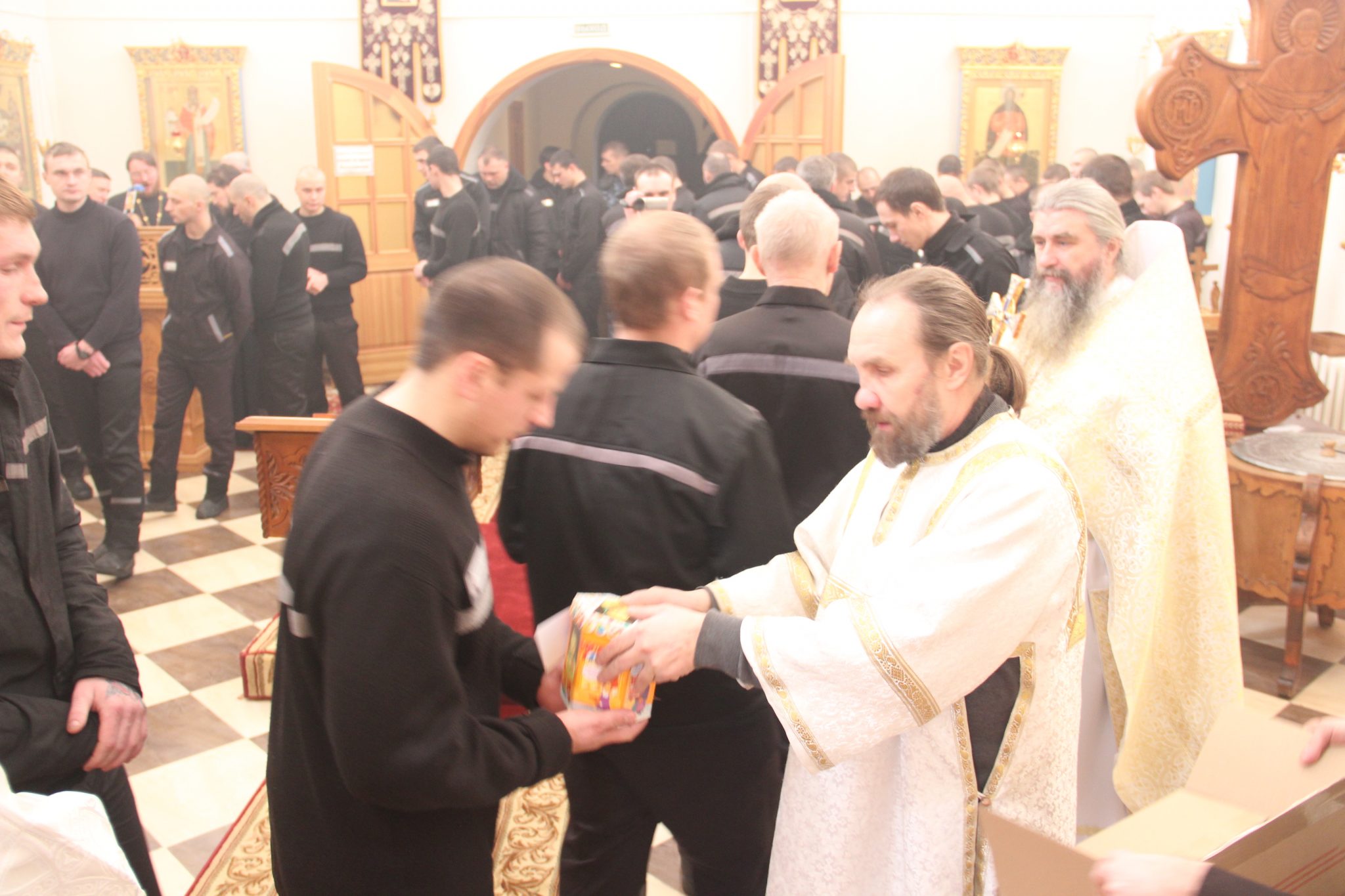 В завершении богослужения владыка поздравил молящихся с праздником и произнес проповедь. Всем присутствующим были розданы небольшие иконки праздника и сладкие подарки. Встреча с заключенными завершилась общим чаепитием.