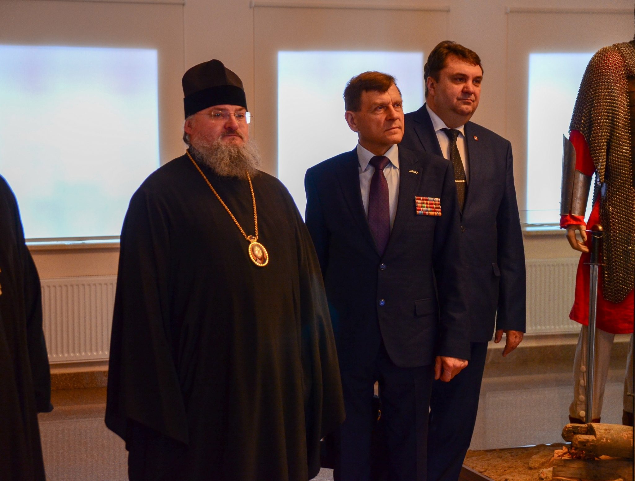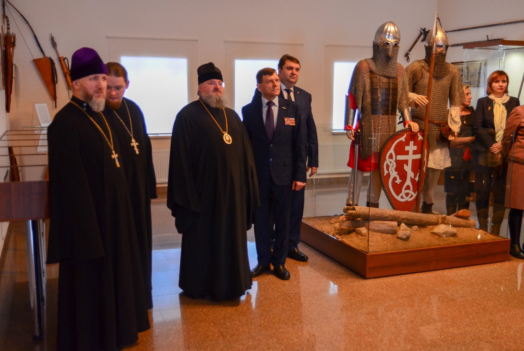 В музее дорогие гости осмотрели картины заслуженного художника Российской Федерации, уроженца Калуги Павла Рыженко (1970-2014), посвященные преподобному Сергию Радонежскому, и диораму, над созданием которой трудилась группа художников студии им. М.Б. Грекова под руководством Павла Рыженко и народного художника Российской Федерации Александра Сытова.