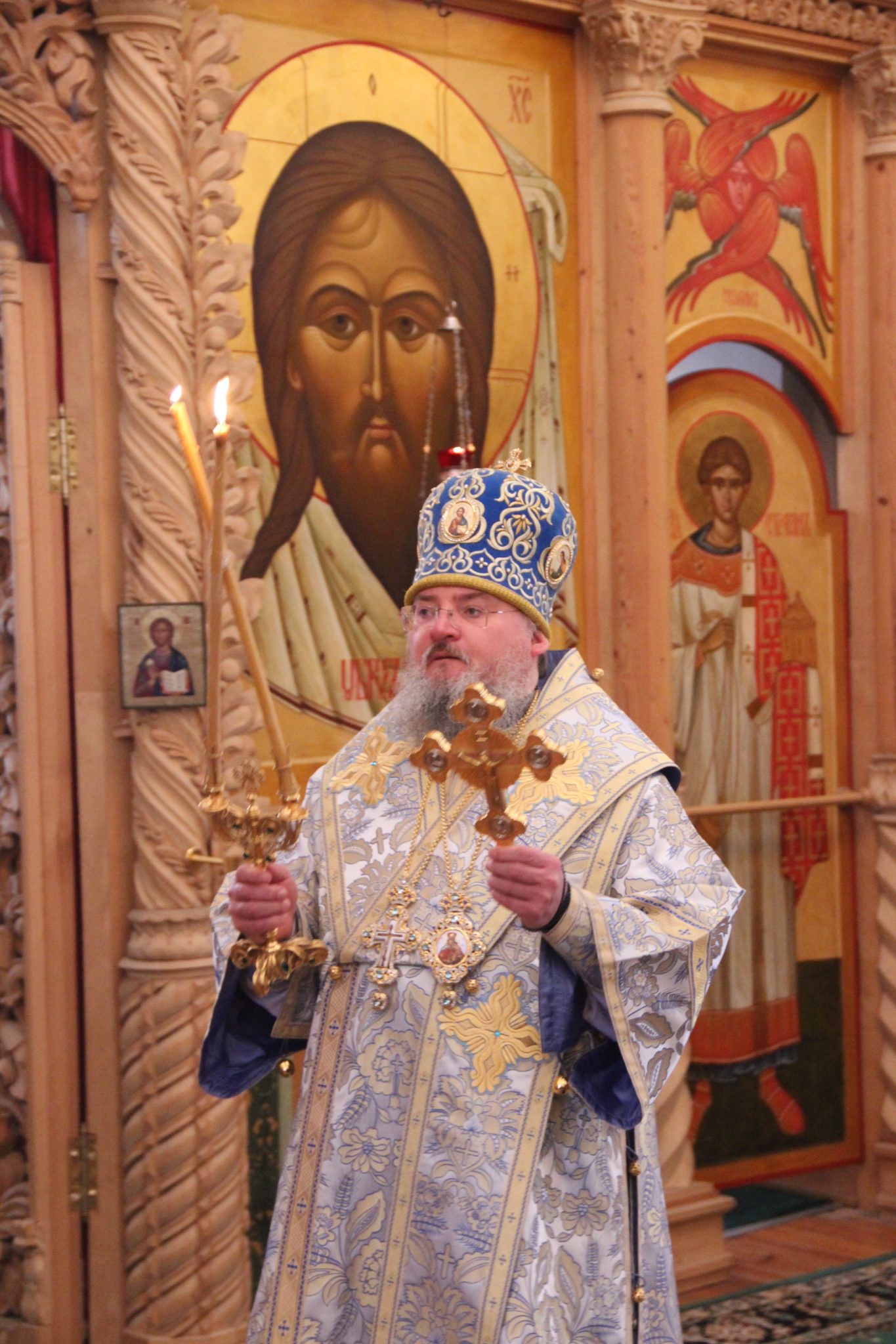 По отпусте литургии священнослужители пропели славление празднику Сретения Господня, а затем владыка обратился к богомольцам с проповедью.