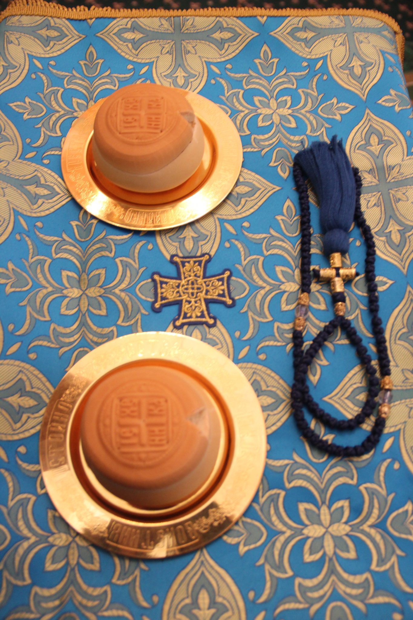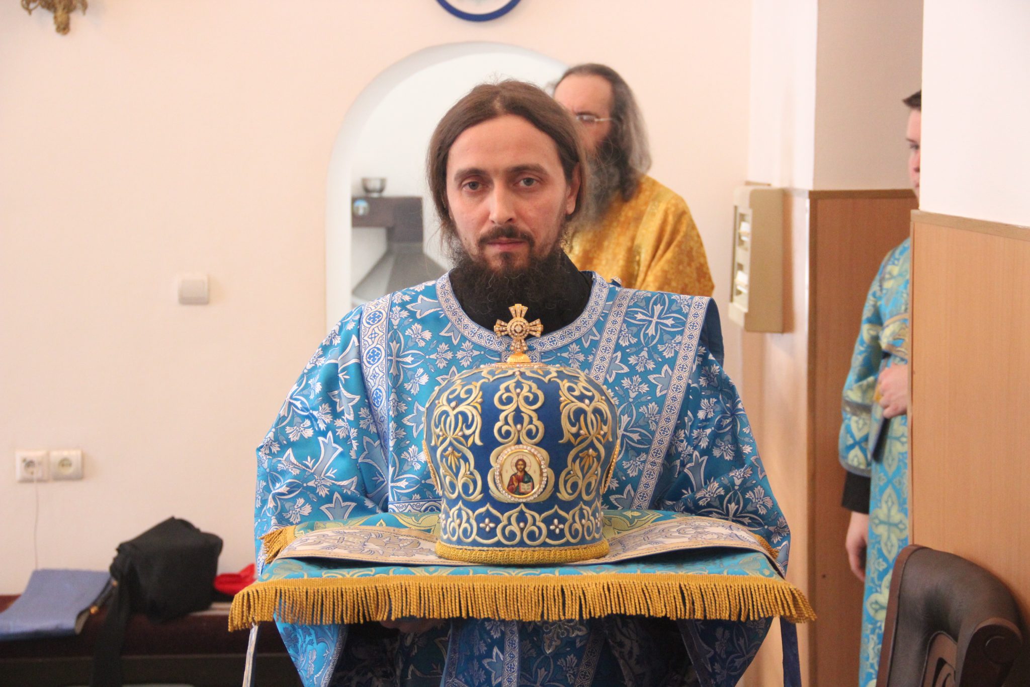 Архипастырь поздравил настоятеля обители игумена Михаила с днем рождения, который был накануне и преподнес ему святую просфору и четки.