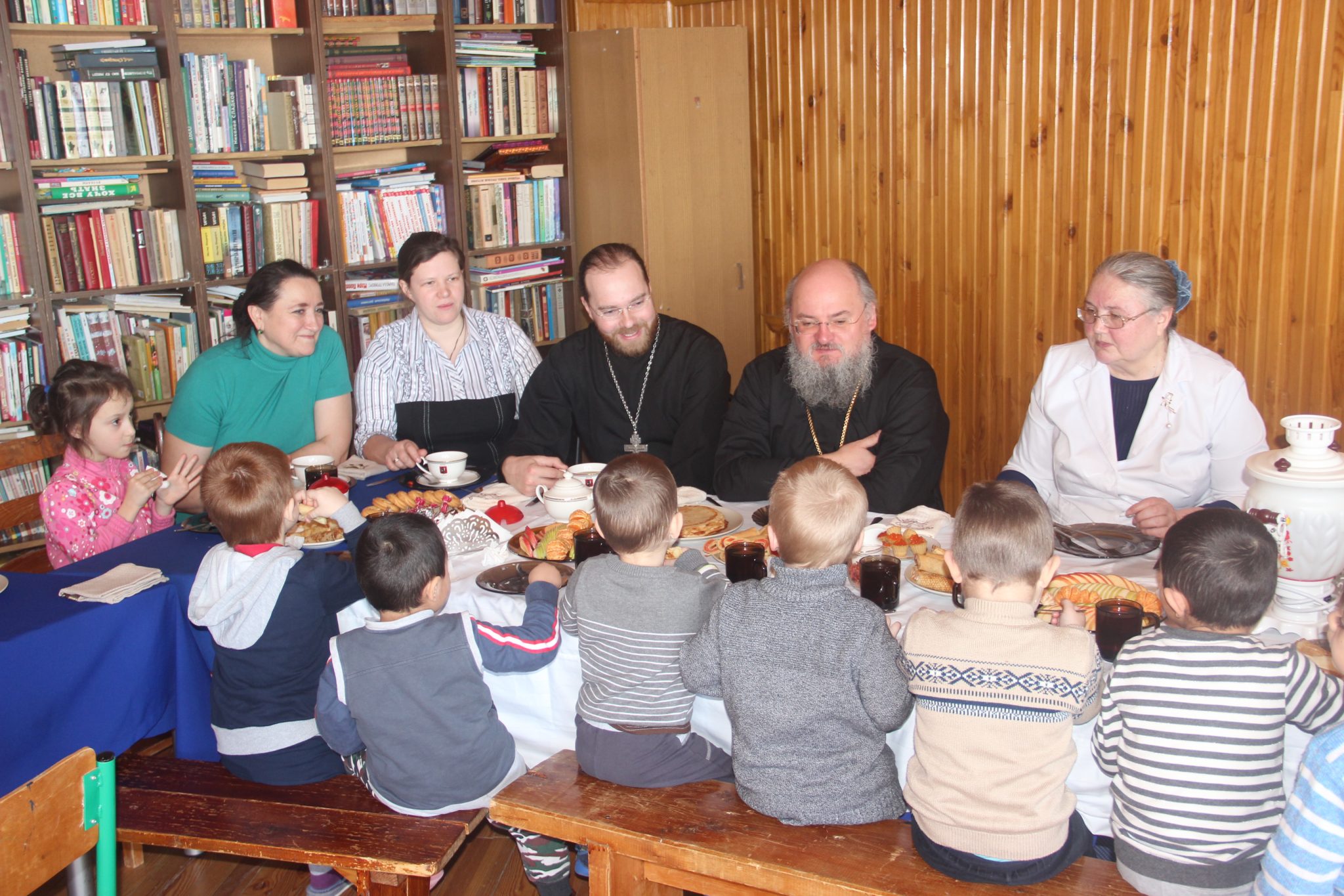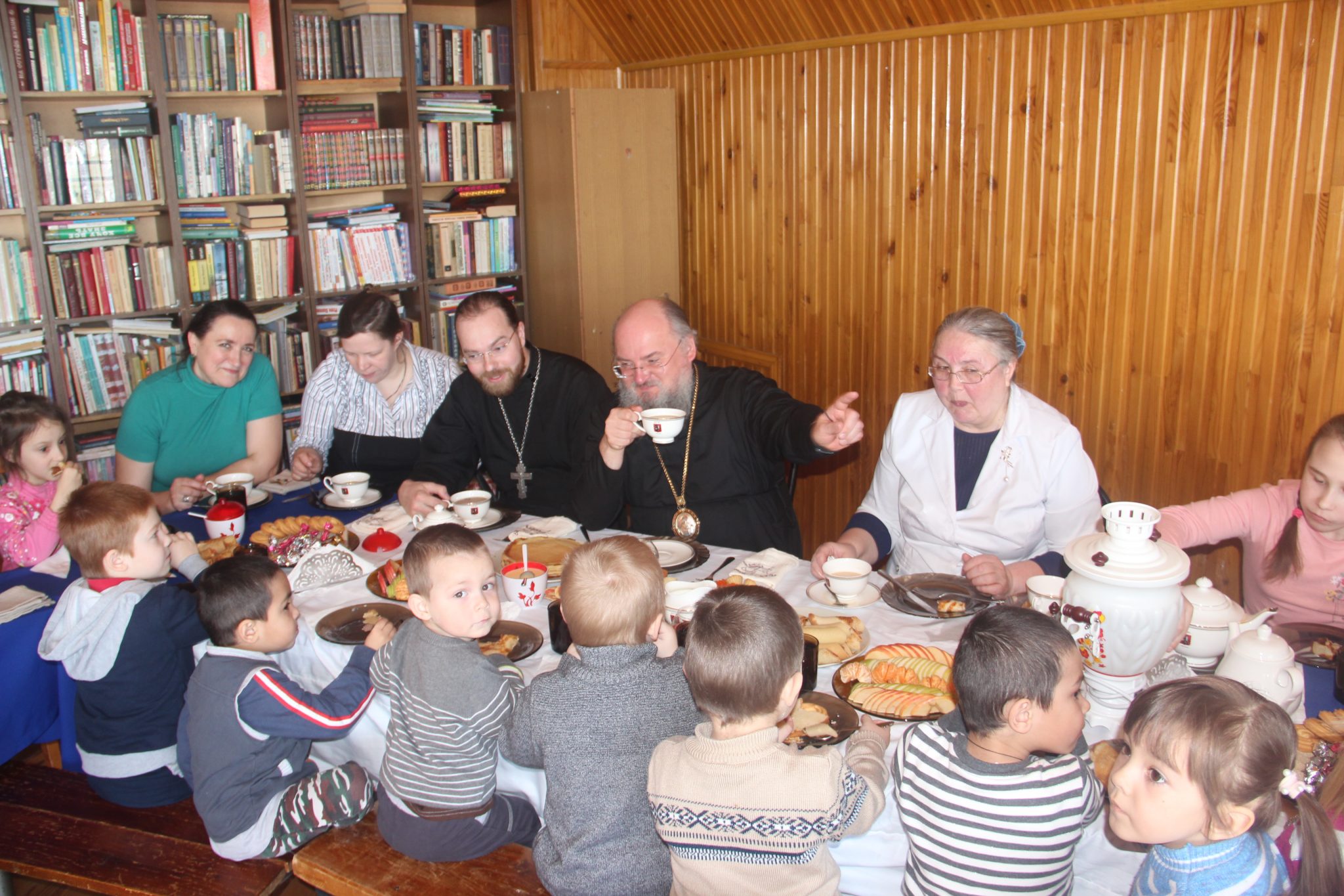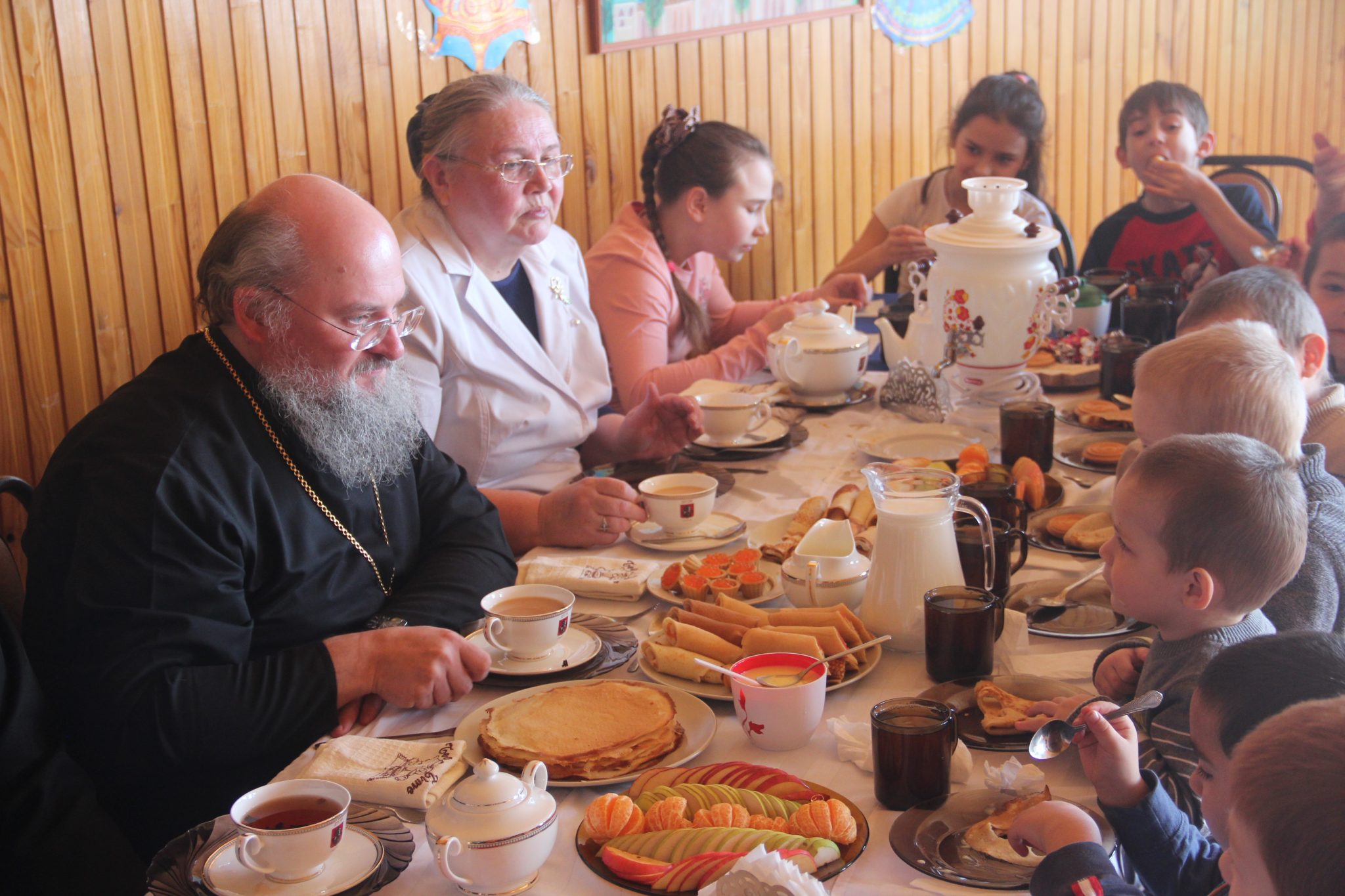 Дети встретили владыку на пороге дома, ставшего им родным, и повели в актовый зал, превратившийся на время встречи светлой трапезной для чаепития с блинами и другими вкусностям.