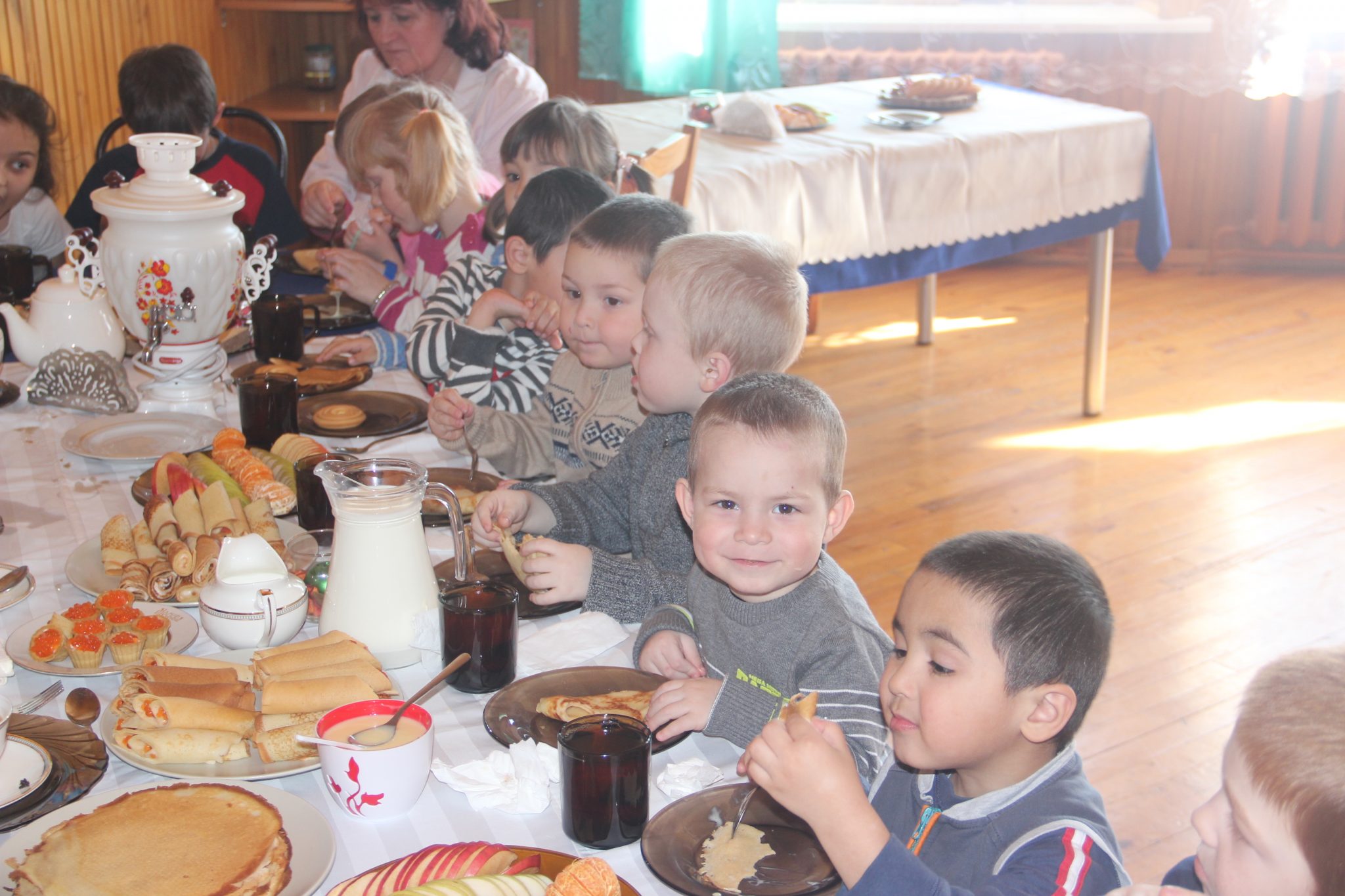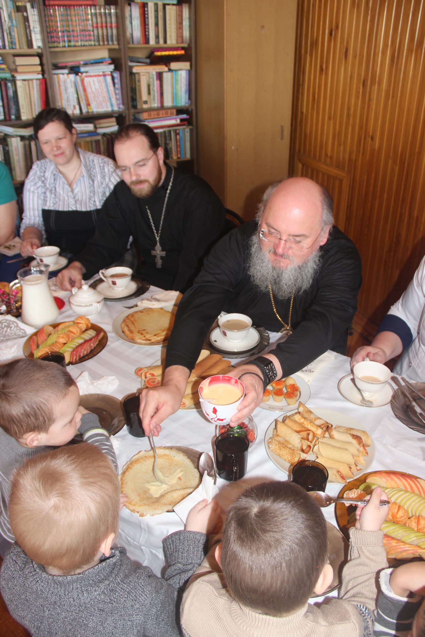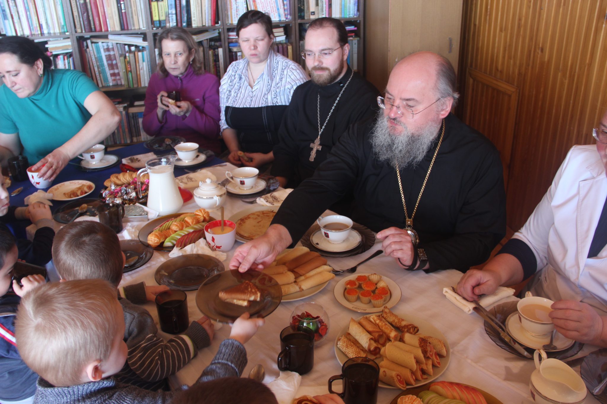 Дети встретили владыку на пороге дома, ставшего им родным, и повели в актовый зал, превратившийся на время встречи светлой трапезной для чаепития с блинами и другими вкусностям.