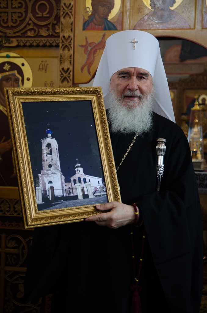 Архиереев поздравил настоятель храма протоиерей Константин Гипп. Отец Константин подарил архиереям Калужской митрополии картины с изображением Свято-Покровского храма города Жиздры.