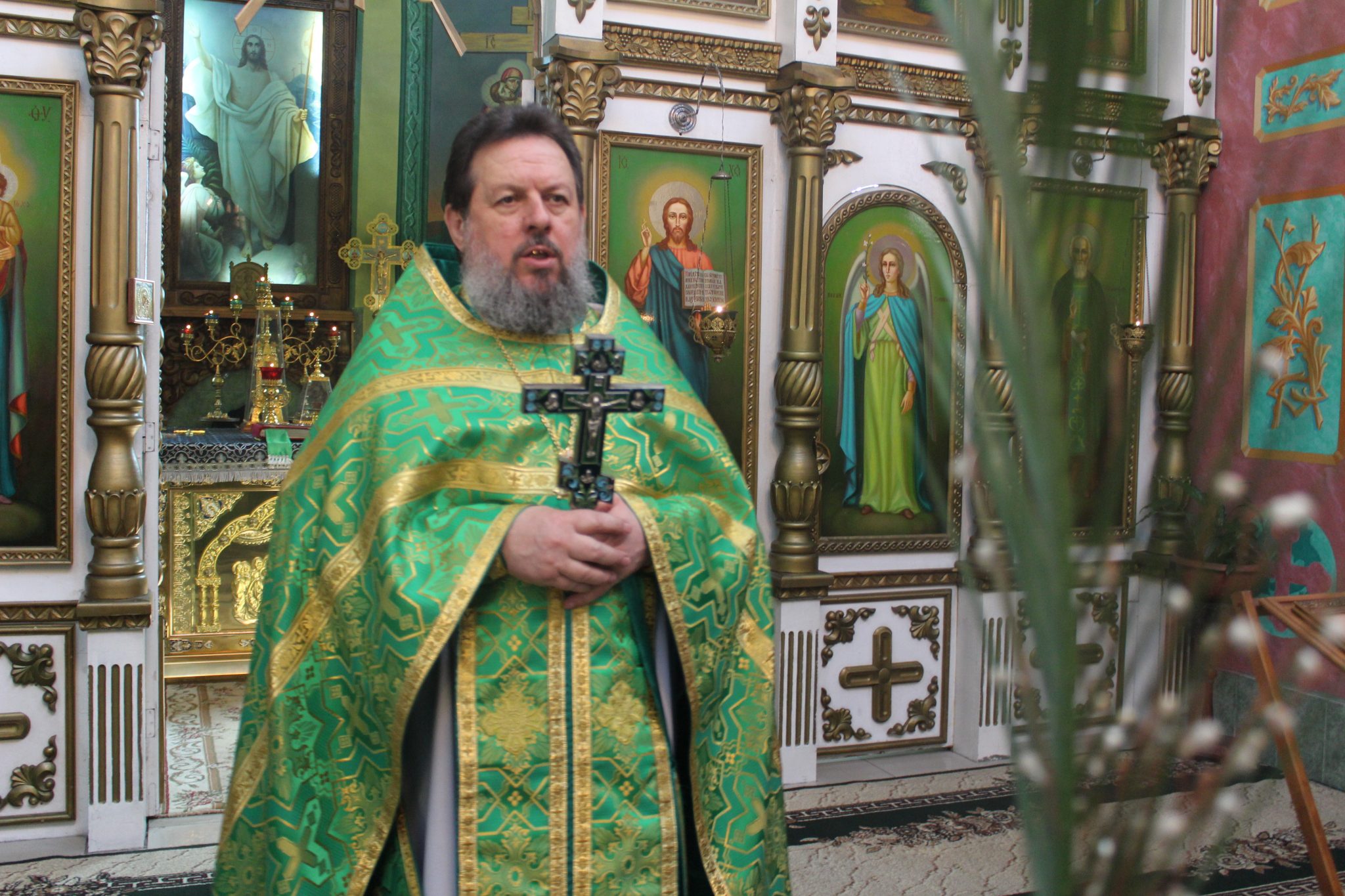 В завершении богослужения, протоиерей Василий обратился к молящимся с проповедью. «Всех вас, дорогие братья и сестры, сердечно поздравляю с воскресным днем и двунадесятым праздником – входом Господним в Иерусалим. Мы в сегодняшнем праздничном Евангелии слышали о том, что после воскресения четверодневного Лазаря, брата Марфы и Марии, который уже четыре дня как был погребен, а мы знаем, что в Палестине климат достаточно жаркий, тело человеческое долго не может храниться, и конечно четыре дня достаточно для того, чтобы оно стало разлагаться. И вот такое тело, такого человека Господь воскрешает, и после этого  идет в Иерусалим. И мы слышим из Евангелия о том, что Его сопровождают десятки, сотни, тысячи людей, они идут и воспевают: «благословен Грядущий во имя Господне! осанна в вышних!» Воскресение Лазаря  прообразовало всеобщее воскресение всех людей из мертвых. Мы с Вами, стоя в церкви в вербное воскресенье, держим в руках зажженные свечи и веточки вербы, которые едино символизируют победу жизни над смертью. Мы, молясь, приветствуем Иисуса Христа как Победителя смерти и ада, освободителя грехов наших.»