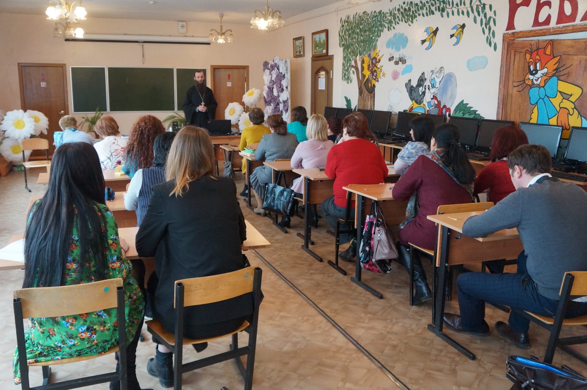 В этот же день после обеда иерей Сергий встретился с преподавателями Основ православной культуры и социальными педагогами города Людиново и ближайших населенных пунктов. Тема «Роль Церкви, семьи и школы в профилактике зависимого поведения», предложенная Ольгой Сергеевной, актуальна для большинства школ т.к. современная информационная среда активно воздействует на подростков и формирует у них предрасположенность к зависимому поведению. Преподаватели по результатам анкетирования признали, что информация, представленная иереем Сергием, была во многом новой и полезной в их дальнейшей работе.