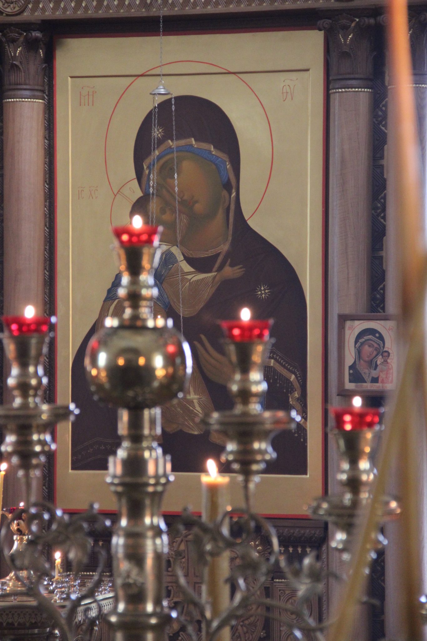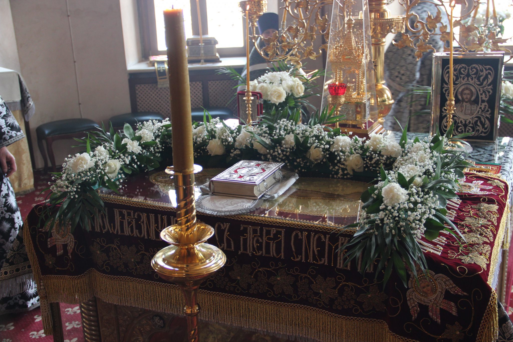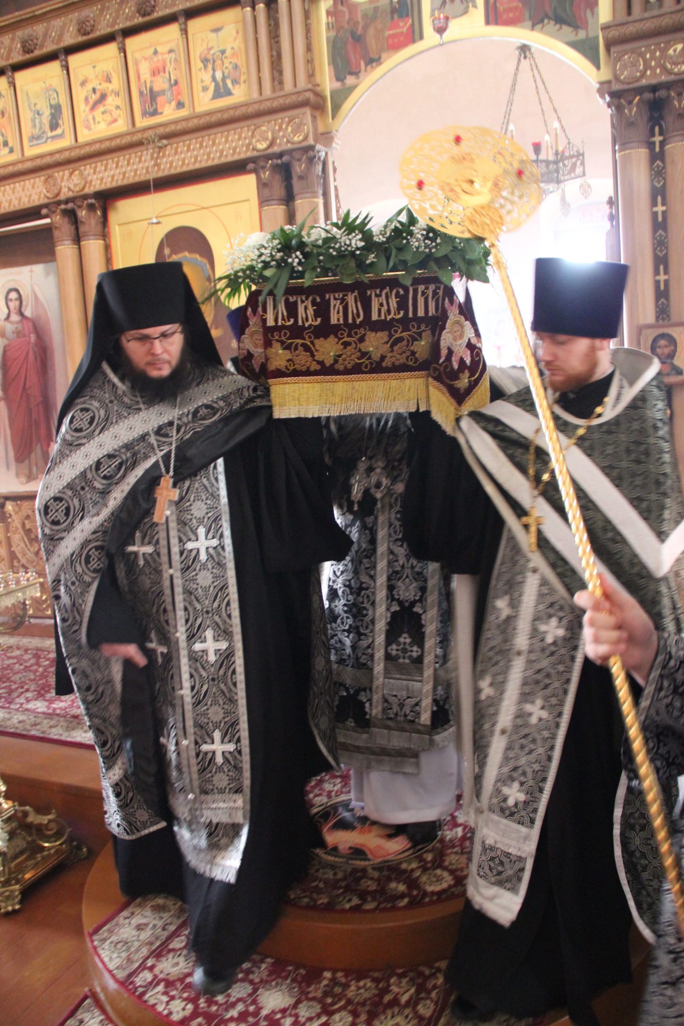 При пении тропаря «Благообразный Иосиф, с древа снем Пречистое Тело Твое…», из алтаря на середину храма была перенесена святая Плащаница Господа Иисуса Христа.