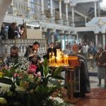 После великого славословия с пением погребального «Святый Боже» был совершен крестный ход с Плащаницей вокруг Храма и колокольный перезвон.