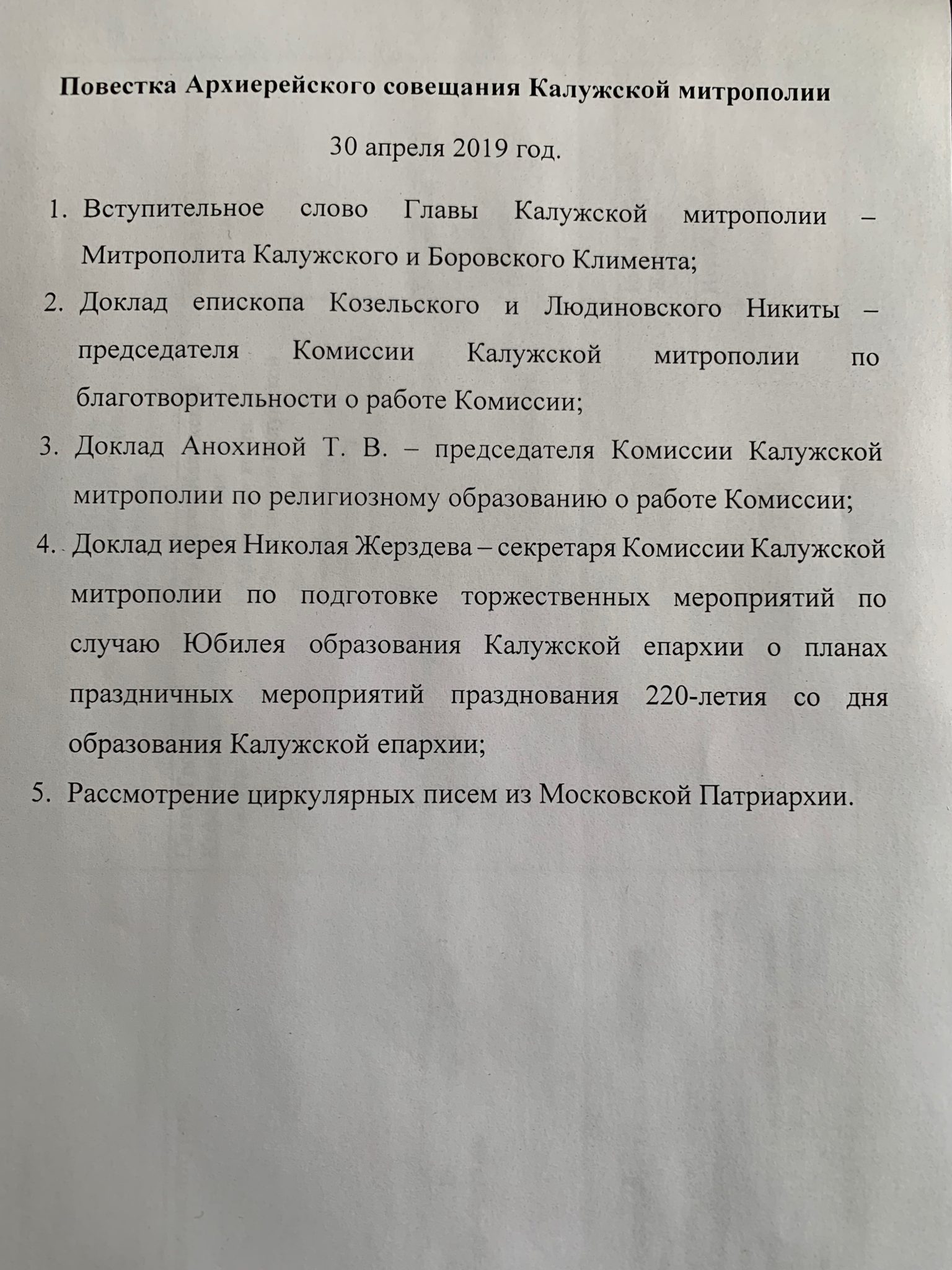 К обсуждению были предложены ряд докладов по деятельности комиссий Калужской митрополии, мероприятия по подготовке празднования 220-летия со дня образования Калужской епархии, а также исполнение циркулярных писем из Московской Патриархии.