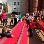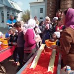 Затем, по русской традиции, дети и взрослые катали пасхальные яйца, звонили в колокола. А для учителей школы по благословение настоятеля прошло пасхальное чаепитие.