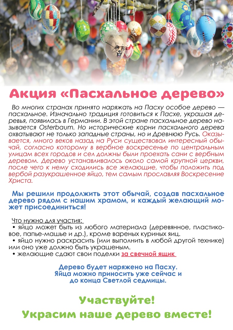 Еще постом клирик храма иерей Алексей Ефименков, организатор акции, пригласил всех участвовать, дал объявление в районную газету. Помимо жителей города, в этом мероприятии поучаствовали православные христиане из других уголков России: дерево украсили яйца из Сергиева Посада, Самарской области и Новосибирска. Дерево порадует горожан до отдания Пасхи, акция планируется проводиться ежегодно.