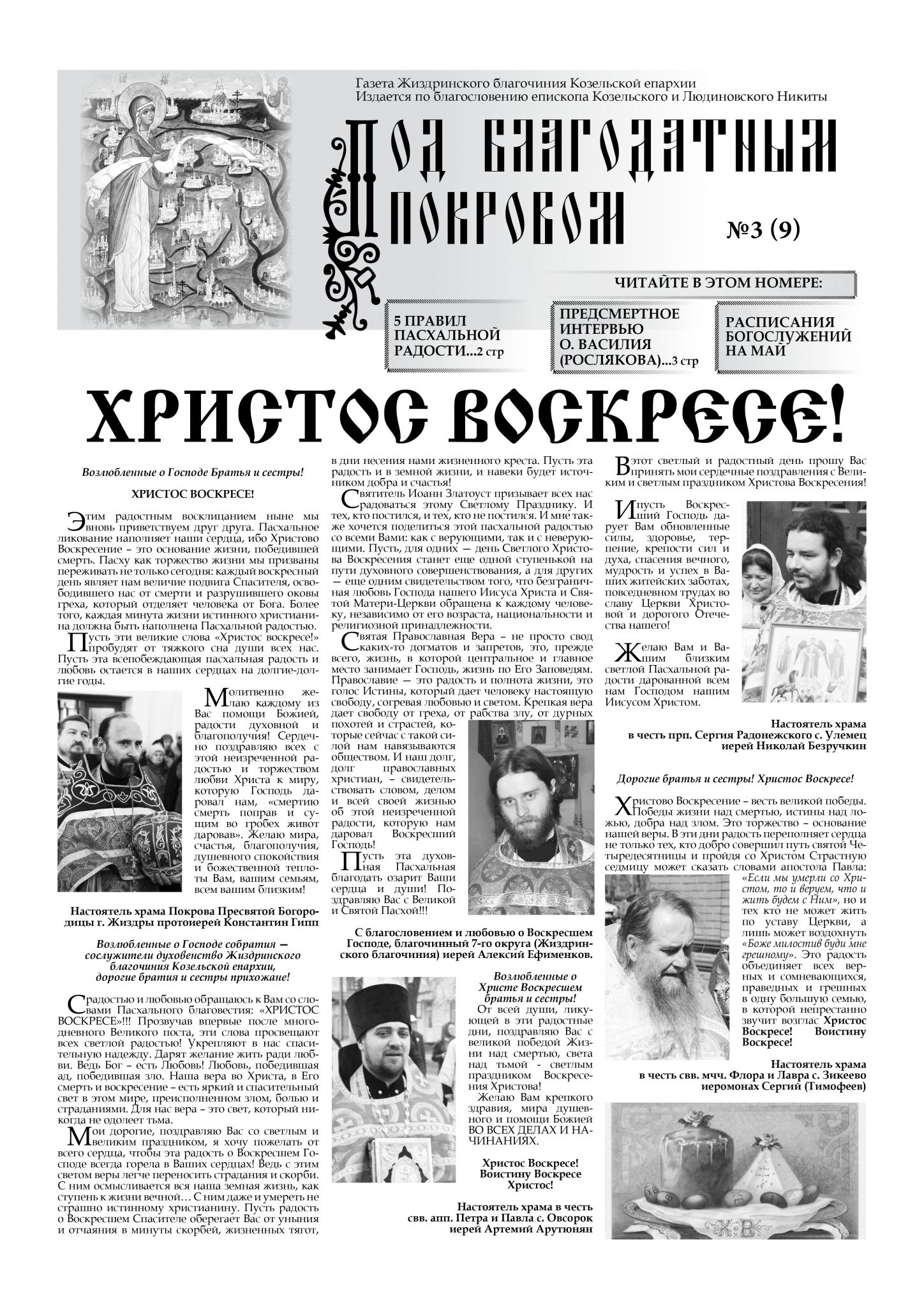 В ЖИЗДРИНСКОМ БЛАГОЧИНИИ ВЫШЕЛ ПАСХАЛЬНЫЙ НОМЕР ГАЗЕТЫ «ПОД БЛАГОДАТНЫМ ПОКРОВОМ»