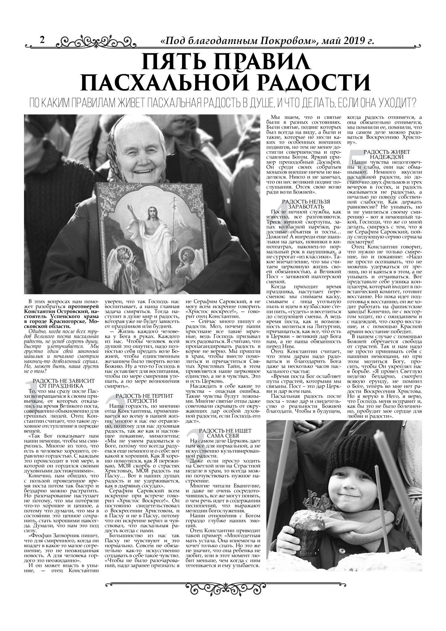 Также в номере можно узнать, по каким правилам живет пасхальная радость в душе, и что делать, если она уходит, в статье протоиерея Константина Островского, настоятеля Успенского храма в городе Красногорске, Московской области.