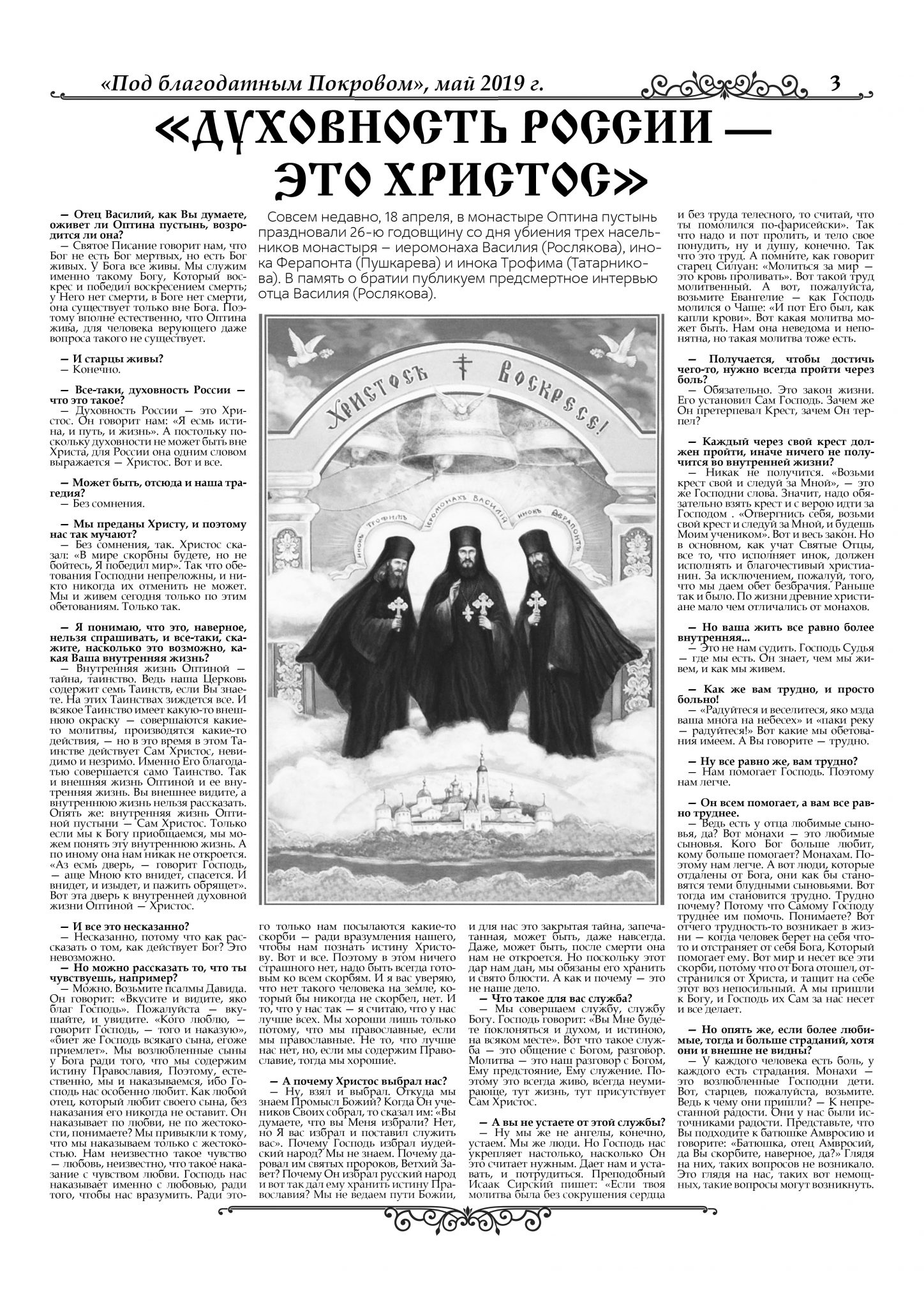 В честь 26-й годовщины со дня убиения трех насельников монастыря – иеромонаха Василия (Рослякова), инока Ферапонта (Пушкарева) и инока Трофима (Татарникова) редакция газеты опубликовала в новом номере предсмертное интервью отца Василия (Рослякова).