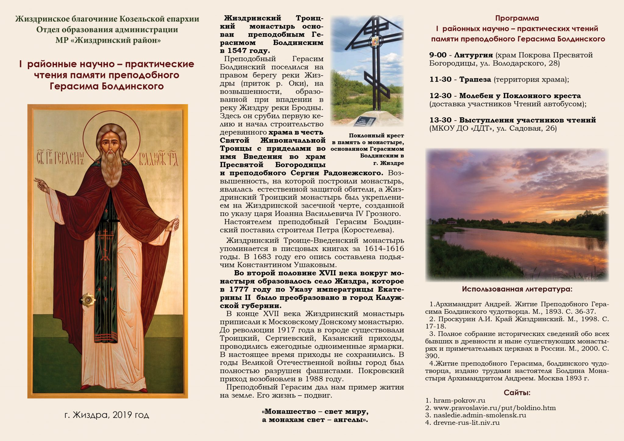 По благословению епископа Козельского и Людиновского Никиты по инициативе благочинного 7-округа Козельской епархии 14 мая в г. Жиздре пройдут I  районные научно-практические чтения памяти преподобного Герасима Болдинского. Организаторы чтений – отдел образования МР «Жиздринский район» и Жиздринское благочиние Козельской епархии.