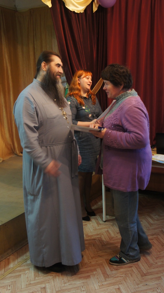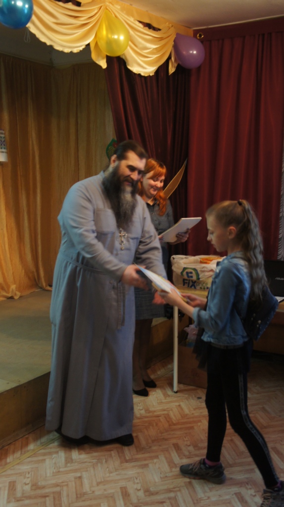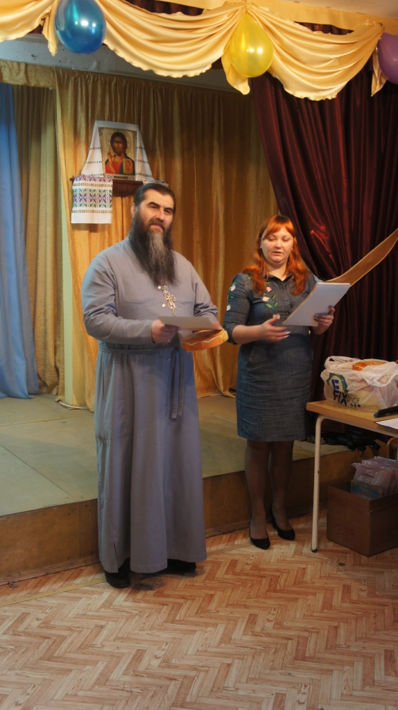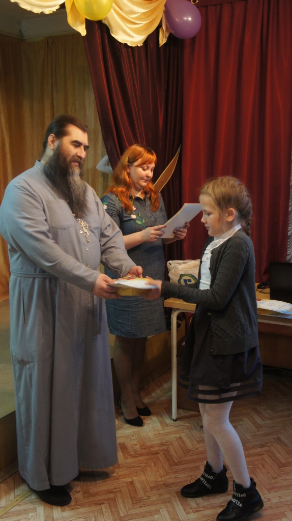 Ведущая праздника Иванова М.А. поздравила всех с праздником Светлой Пасхи. Слово для приветствия и награждения победителей выставки – конкурса «Символы Пасхи» предоставили духовнику ДЦ «Возрождение» отцу игумену Михаилу (Семенову).