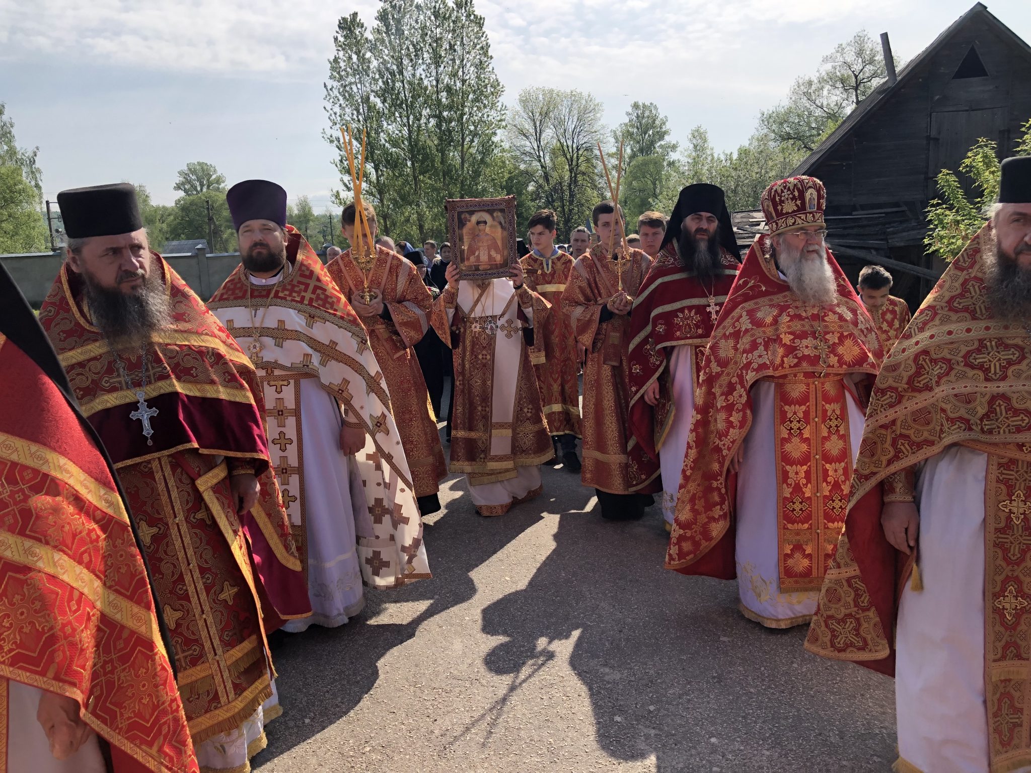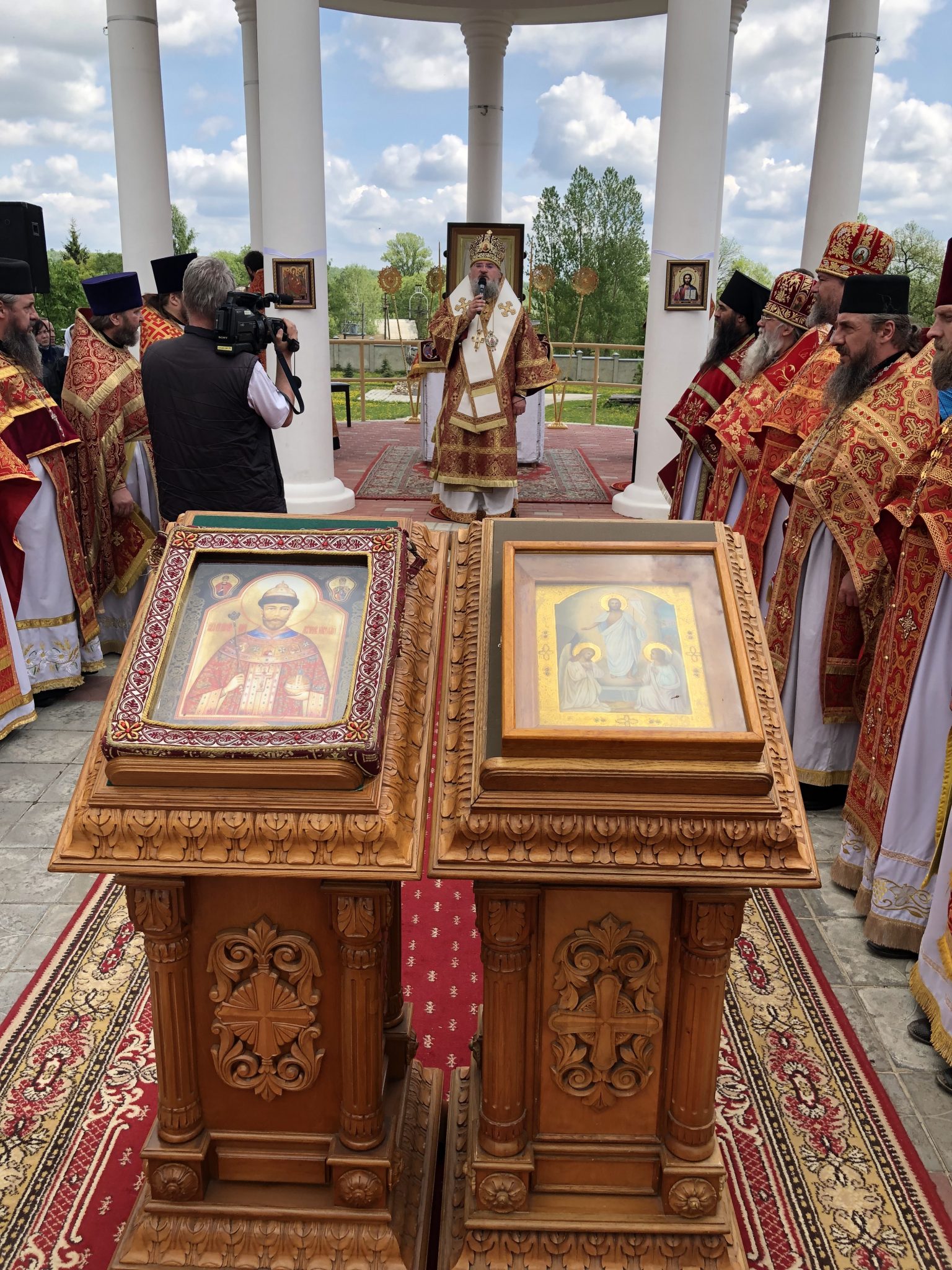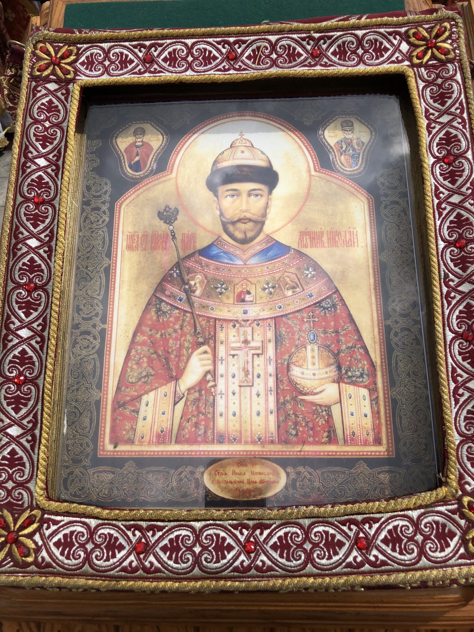 Перед началом богослужения священнослужители и паломники торжественно встретили мироточивый образ царя страстотерпца Николая Второго, пребывающий в эти дни в Козельской епархии.